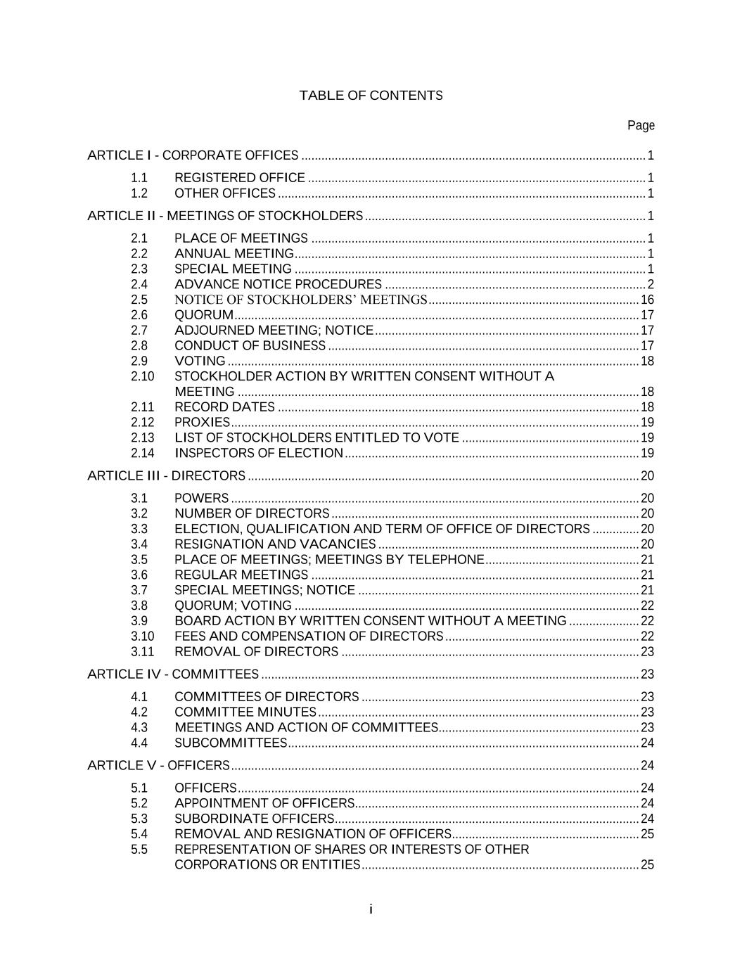 i TABLE OF CONTENTS Page ARTICLE I - CORPORATE OFFICES ....................................................................................................... 1 1.1 REGISTERED OFFICE ..................................................................................................... 1 1.2 OTHER OFFICES .............................................................................................................. 1 ARTICLE II - MEETINGS OF STOCKHOLDERS .................................................................................... 1 2.1 PLACE OF MEETINGS .................................................................................................... 1 2.2 ANNUAL MEETING ......................................................................................................... 1 2.3 SPECIAL MEETING ......................................................................................................... 1 2.4 ADVANCE NOTICE PROCEDURES .............................................................................. 2 2.5 NOTICE OF STOCKHOLDERS’ MEETINGS ............................................................... 16 2.6 QUORUM ......................................................................................................................... 17 2.7 ADJOURNED MEETING; NOTICE ............................................................................... 17 2.8 CONDUCT OF BUSINESS ............................................................................................. 17 2.9 VOTING ........................................................................................................................... 18 2.10 STOCKHOLDER ACTION BY WRITTEN CONSENT WITHOUT A MEETING ........................................................................................................................ 18 2.11 RECORD DATES ............................................................................................................ 18 2.12 PROXIES .......................................................................................................................... 19 2.13 LIST OF STOCKHOLDERS ENTITLED TO VOTE ..................................................... 19 2.14 INSPECTORS OF ELECTION ........................................................................................ 19 ARTICLE III - DIRECTORS ..................................................................................................................... 20 3.1 POWERS .......................................................................................................................... 20 3.2 NUMBER OF DIRECTORS ............................................................................................ 20 3.3 ELECTION, QUALIFICATION AND TERM OF OFFICE OF DIRECTORS .............. 20 3.4 RESIGNATION AND VACANCIES .............................................................................. 20 3.5 PLACE OF MEETINGS; MEETINGS BY TELEPHONE .............................................. 21 3.6 REGULAR MEETINGS .................................................................................................. 21 3.7 SPECIAL MEETINGS; NOTICE .................................................................................... 21 3.8 QUORUM; VOTING ....................................................................................................... 22 3.9 BOARD ACTION BY WRITTEN CONSENT WITHOUT A MEETING ..................... 22 3.10 FEES AND COMPENSATION OF DIRECTORS .......................................................... 22 3.11 REMOVAL OF DIRECTORS ......................................................................................... 23 ARTICLE IV - COMMITTEES ................................................................................................................. 23 4.1 COMMITTEES OF DIRECTORS ................................................................................... 23 4.2 COMMITTEE MINUTES ................................................................................................ 23 4.3 MEETINGS AND ACTION OF COMMITTEES............................................................ 23 4.4 SUBCOMMITTEES ......................................................................................................... 24 ARTICLE V - OFFICERS .......................................................................................................................... 24 5.1 OFFICERS ........................................................................................................................ 24 5.2 APPOINTMENT OF OFFICERS..................................................................................... 24 5.3 SUBORDINATE OFFICERS ........................................................................................... 24 5.4 REMOVAL AND RESIGNATION OF OFFICERS........................................................ 25 5.5 REPRESENTATION OF SHARES OR INTERESTS OF OTHER CORPORATIONS OR ENTITIES ................................................................................... 25