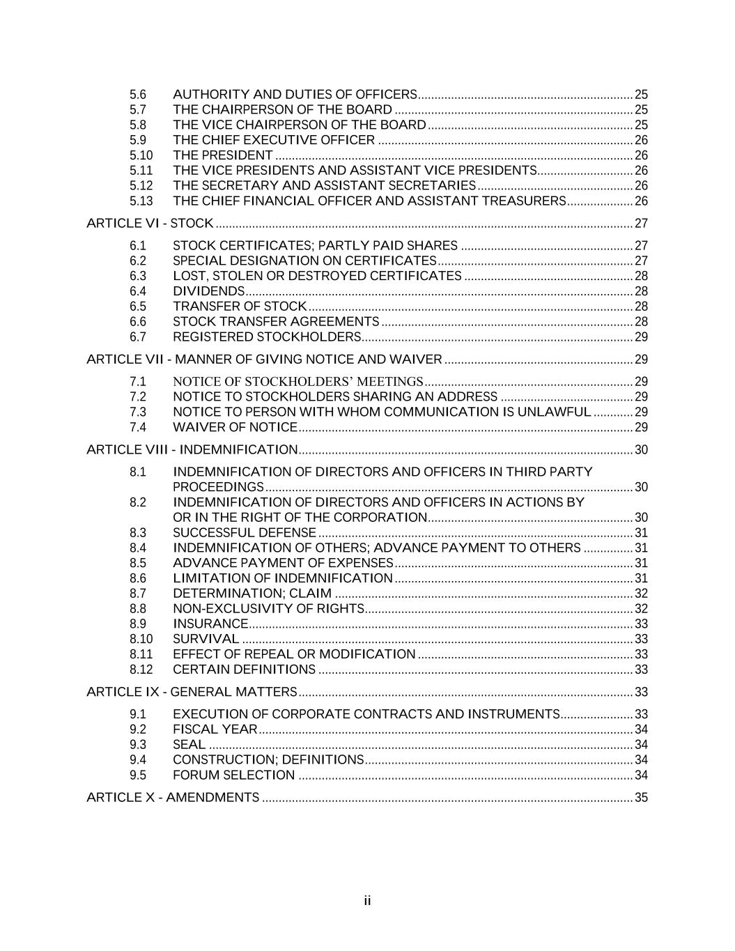 ii 5.6 AUTHORITY AND DUTIES OF OFFICERS ................................................................. 25 5.7 THE CHAIRPERSON OF THE BOARD ........................................................................ 25 5.8 THE VICE CHAIRPERSON OF THE BOARD .............................................................. 25 5.9 THE CHIEF EXECUTIVE OFFICER ............................................................................. 26 5.10 THE PRESIDENT ............................................................................................................ 26 5.11 THE VICE PRESIDENTS AND ASSISTANT VICE PRESIDENTS............................. 26 5.12 THE SECRETARY AND ASSISTANT SECRETARIES ............................................... 26 5.13 THE CHIEF FINANCIAL OFFICER AND ASSISTANT TREASURERS .................... 26 ARTICLE VI - STOCK .............................................................................................................................. 27 6.1 STOCK CERTIFICATES; PARTLY PAID SHARES .................................................... 27 6.2 SPECIAL DESIGNATION ON CERTIFICATES ........................................................... 27 6.3 LOST, STOLEN OR DESTROYED CERTIFICATES ................................................... 28 6.4 DIVIDENDS ..................................................................................................................... 28 6.5 TRANSFER OF STOCK .................................................................................................. 28 6.6 STOCK TRANSFER AGREEMENTS ............................................................................ 28 6.7 REGISTERED STOCKHOLDERS .................................................................................. 29 ARTICLE VII - MANNER OF GIVING NOTICE AND WAIVER ......................................................... 29 7.1 NOTICE OF STOCKHOLDERS’ MEETINGS ............................................................... 29 7.2 NOTICE TO STOCKHOLDERS SHARING AN ADDRESS ........................................ 29 7.3 NOTICE TO PERSON WITH WHOM COMMUNICATION IS UNLAWFUL ............ 29 7.4 WAIVER OF NOTICE ..................................................................................................... 29 ARTICLE VIII - INDEMNIFICATION ..................................................................................................... 30 8.1 INDEMNIFICATION OF DIRECTORS AND OFFICERS IN THIRD PARTY PROCEEDINGS ............................................................................................................... 30 8.2 INDEMNIFICATION OF DIRECTORS AND OFFICERS IN ACTIONS BY OR IN THE RIGHT OF THE CORPORATION.............................................................. 30 8.3 SUCCESSFUL DEFENSE ............................................................................................... 31 8.4 INDEMNIFICATION OF OTHERS; ADVANCE PAYMENT TO OTHERS ............... 31 8.5 ADVANCE PAYMENT OF EXPENSES ........................................................................ 31 8.6 LIMITATION OF INDEMNIFICATION ........................................................................ 31 8.7 DETERMINATION; CLAIM .......................................................................................... 32 8.8 NON-EXCLUSIVITY OF RIGHTS ................................................................................. 32 8.9 INSURANCE.................................................................................................................... 33 8.10 SURVIVAL ...................................................................................................................... 33 8.11 EFFECT OF REPEAL OR MODIFICATION ................................................................. 33 8.12 CERTAIN DEFINITIONS ............................................................................................... 33 ARTICLE IX - GENERAL MATTERS ..................................................................................................... 33 9.1 EXECUTION OF CORPORATE CONTRACTS AND INSTRUMENTS...................... 33 9.2 FISCAL YEAR ................................................................................................................. 34 9.3 SEAL ................................................................................................................................ 34 9.4 CONSTRUCTION; DEFINITIONS ................................................................................. 34 9.5 FORUM SELECTION ..................................................................................................... 34 ARTICLE X - AMENDMENTS ................................................................................................................ 35