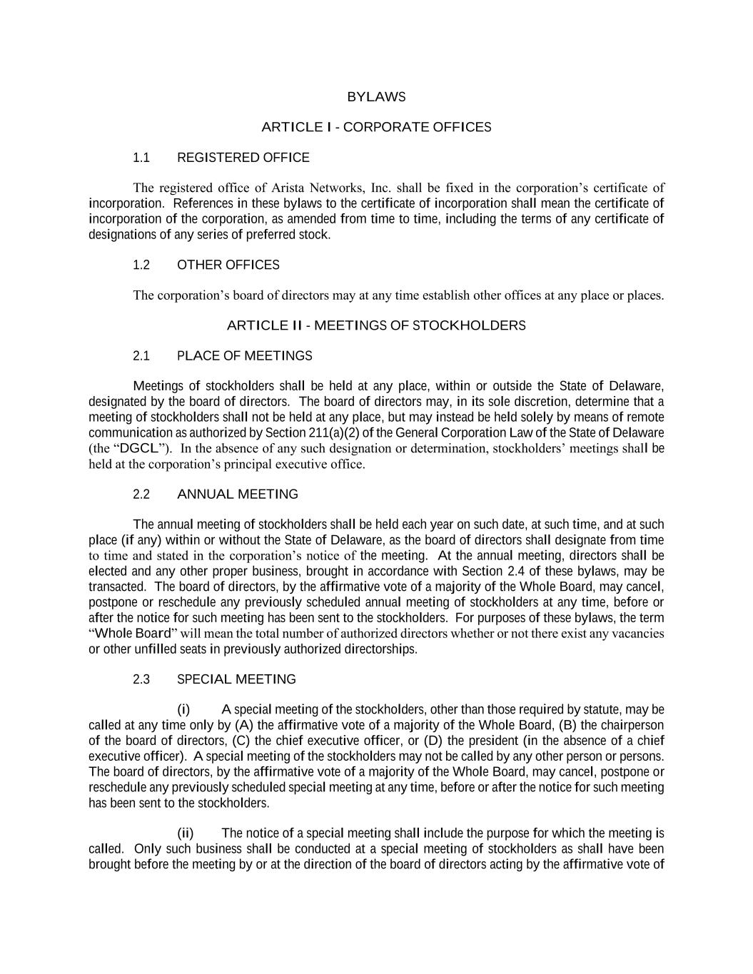 BYLAWS ARTICLE I - CORPORATE OFFICES 1.1 REGISTERED OFFICE The registered office of Arista Networks, Inc. shall be fixed in the corporation’s certificate of incorporation. References in these bylaws to the certificate of incorporation shall mean the certificate of incorporation of the corporation, as amended from time to time, including the terms of any certificate of designations of any series of preferred stock. 1.2 OTHER OFFICES The corporation’s board of directors may at any time establish other offices at any place or places. ARTICLE II - MEETINGS OF STOCKHOLDERS 2.1 PLACE OF MEETINGS Meetings of stockholders shall be held at any place, within or outside the State of Delaware, designated by the board of directors. The board of directors may, in its sole discretion, determine that a meeting of stockholders shall not be held at any place, but may instead be held solely by means of remote communication as authorized by Section 211(a)(2) of the General Corporation Law of the State of Delaware (the “DGCL”). In the absence of any such designation or determination, stockholders’ meetings shall be held at the corporation’s principal executive office. 2.2 ANNUAL MEETING The annual meeting of stockholders shall be held each year on such date, at such time, and at such place (if any) within or without the State of Delaware, as the board of directors shall designate from time to time and stated in the corporation’s notice of the meeting. At the annual meeting, directors shall be elected and any other proper business, brought in accordance with Section 2.4 of these bylaws, may be transacted. The board of directors, by the affirmative vote of a majority of the Whole Board, may cancel, postpone or reschedule any previously scheduled annual meeting of stockholders at any time, before or after the notice for such meeting has been sent to the stockholders. For purposes of these bylaws, the term “Whole Board” will mean the total number of authorized directors whether or not there exist any vacancies or other unfilled seats in previously authorized directorships. 2.3 SPECIAL MEETING (i) A special meeting of the stockholders, other than those required by statute, may be called at any time only by (A) the affirmative vote of a majority of the Whole Board, (B) the chairperson of the board of directors, (C) the chief executive officer, or (D) the president (in the absence of a chief executive officer). A special meeting of the stockholders may not be called by any other person or persons. The board of directors, by the affirmative vote of a majority of the Whole Board, may cancel, postpone or reschedule any previously scheduled special meeting at any time, before or after the notice for such meeting has been sent to the stockholders. (ii) The notice of a special meeting shall include the purpose for which the meeting is called. Only such business shall be conducted at a special meeting of stockholders as shall have been brought before the meeting by or at the direction of the board of directors acting by the affirmative vote of