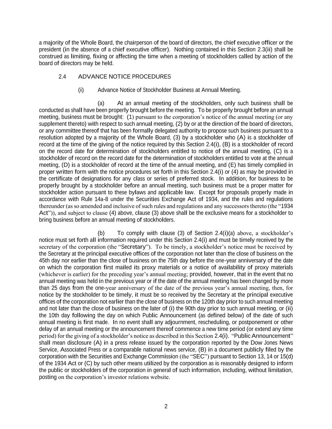 2 a majority of the Whole Board, the chairperson of the board of directors, the chief executive officer or the president (in the absence of a chief executive officer). Nothing contained in this Section 2.3(ii) shall be construed as limiting, fixing or affecting the time when a meeting of stockholders called by action of the board of directors may be held. 2.4 ADVANCE NOTICE PROCEDURES (i) Advance Notice of Stockholder Business at Annual Meeting. (a) At an annual meeting of the stockholders, only such business shall be conducted as shall have been properly brought before the meeting. To be properly brought before an annual meeting, business must be brought: (1) pursuant to the corporation’s notice of the annual meeting (or any supplement thereto) with respect to such annual meeting, (2) by or at the direction of the board of directors, or any committee thereof that has been formally delegated authority to propose such business pursuant to a resolution adopted by a majority of the Whole Board, (3) by a stockholder who (A) is a stockholder of record at the time of the giving of the notice required by this Section 2.4(i), (B) is a stockholder of record on the record date for determination of stockholders entitled to notice of the annual meeting, (C) is a stockholder of record on the record date for the determination of stockholders entitled to vote at the annual meeting, (D) is a stockholder of record at the time of the annual meeting, and (E) has timely complied in proper written form with the notice procedures set forth in this Section 2.4(i) or (4) as may be provided in the certificate of designations for any class or series of preferred stock. In addition, for business to be properly brought by a stockholder before an annual meeting, such business must be a proper matter for stockholder action pursuant to these bylaws and applicable law. Except for proposals properly made in accordance with Rule 14a-8 under the Securities Exchange Act of 1934, and the rules and regulations thereunder (as so amended and inclusive of such rules and regulations and any successors thereto (the “1934 Act”)), and subject to clause (4) above, clause (3) above shall be the exclusive means for a stockholder to bring business before an annual meeting of stockholders. (b) To comply with clause (3) of Section 2.4(i)(a) above, a stockholder’s notice must set forth all information required under this Section 2.4(i) and must be timely received by the secretary of the corporation (the “Secretary”). To be timely, a stockholder’s notice must be received by the Secretary at the principal executive offices of the corporation not later than the close of business on the 45th day nor earlier than the close of business on the 75th day before the one-year anniversary of the date on which the corporation first mailed its proxy materials or a notice of availability of proxy materials (whichever is earlier) for the preceding year’s annual meeting; provided, however, that in the event that no annual meeting was held in the previous year or if the date of the annual meeting has been changed by more than 25 days from the one-year anniversary of the date of the previous year’s annual meeting, then, for notice by the stockholder to be timely, it must be so received by the Secretary at the principal executive offices of the corporation not earlier than the close of business on the 120th day prior to such annual meeting and not later than the close of business on the later of (i) the 90th day prior to such annual meeting, or (ii) the 10th day following the day on which Public Announcement (as defined below) of the date of such annual meeting is first made. In no event shall any adjournment, rescheduling, or postponement or other delay of an annual meeting or the announcement thereof commence a new time period (or extend any time period) for the giving of a stockholder’s notice as described in this Section 2.4(i). “Public Announcement” shall mean disclosure (A) in a press release issued by the corporation reported by the Dow Jones News Service, Associated Press or a comparable national news service, (B) in a document publicly filed by the corporation with the Securities and Exchange Commission (the “SEC”) pursuant to Section 13, 14 or 15(d) of the 1934 Act or (C) by such other means utilized by the corporation as is reasonably designed to inform the public or stockholders of the corporation in general of such information, including, without limitation, posting on the corporation’s investor relations website.