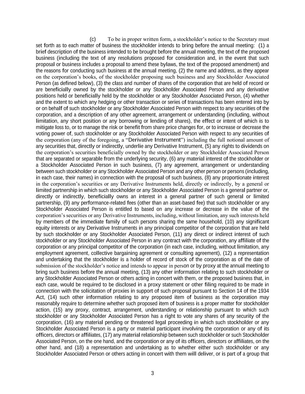 3 (c) To be in proper written form, a stockholder’s notice to the Secretary must set forth as to each matter of business the stockholder intends to bring before the annual meeting: (1) a brief description of the business intended to be brought before the annual meeting, the text of the proposed business (including the text of any resolutions proposed for consideration and, in the event that such proposal or business includes a proposal to amend these bylaws, the text of the proposed amendment) and the reasons for conducting such business at the annual meeting, (2) the name and address, as they appear on the corporation’s books, of the stockholder proposing such business and any Stockholder Associated Person (as defined below), (3) the class and number of shares of the corporation that are held of record or are beneficially owned by the stockholder or any Stockholder Associated Person and any derivative positions held or beneficially held by the stockholder or any Stockholder Associated Person, (4) whether and the extent to which any hedging or other transaction or series of transactions has been entered into by or on behalf of such stockholder or any Stockholder Associated Person with respect to any securities of the corporation, and a description of any other agreement, arrangement or understanding (including, without limitation, any short position or any borrowing or lending of shares), the effect or intent of which is to mitigate loss to, or to manage the risk or benefit from share price changes for, or to increase or decrease the voting power of, such stockholder or any Stockholder Associated Person with respect to any securities of the corporation (any of the foregoing, a “Derivative Instrument”) including the full notional amount of any securities that, directly or indirectly, underlie any Derivative Instrument, (5) any rights to dividends on the corporation’s securities beneficially owned by the stockholder or any Stockholder Associated Person that are separated or separable from the underlying security, (6) any material interest of the stockholder or a Stockholder Associated Person in such business, (7) any agreement, arrangement or understanding between such stockholder or any Stockholder Associated Person and any other person or persons (including, in each case, their names) in connection with the proposal of such business, (8) any proportionate interest in the corporation’s securities or any Derivative Instruments held, directly or indirectly, by a general or limited partnership in which such stockholder or any Stockholder Associated Person is a general partner or, directly or indirectly, beneficially owns an interest in a general partner of such general or limited partnership, (9) any performance-related fees (other than an asset-based fee) that such stockholder or any Stockholder Associated Person is entitled to based on any increase or decrease in the value of the corporation’s securities or any Derivative Instruments, including, without limitation, any such interests held by members of the immediate family of such persons sharing the same household, (10) any significant equity interests or any Derivative Instruments in any principal competitor of the corporation that are held by such stockholder or any Stockholder Associated Person, (11) any direct or indirect interest of such stockholder or any Stockholder Associated Person in any contract with the corporation, any affiliate of the corporation or any principal competitor of the corporation (in each case, including, without limitation, any employment agreement, collective bargaining agreement or consulting agreement), (12) a representation and undertaking that the stockholder is a holder of record of stock of the corporation as of the date of submission of the stockholder’s notice and intends to appear in person or by proxy at the annual meeting to bring such business before the annual meeting, (13) any other information relating to such stockholder or any Stockholder Associated Person or others acting in concert with them, or the proposed business that, in each case, would be required to be disclosed in a proxy statement or other filing required to be made in connection with the solicitation of proxies in support of such proposal pursuant to Section 14 of the 1934 Act, (14) such other information relating to any proposed item of business as the corporation may reasonably require to determine whether such proposed item of business is a proper matter for stockholder action, (15) any proxy, contract, arrangement, understanding or relationship pursuant to which such stockholder or any Stockholder Associated Person has a right to vote any shares of any security of the corporation, (16) any material pending or threatened legal proceeding in which such stockholder or any Stockholder Associated Person is a party or material participant involving the corporation or any of its officers, directors or affiliates, (17) any material relationship between such stockholder or such Stockholder Associated Person, on the one hand, and the corporation or any of its officers, directors or affiliates, on the other hand, and (18) a representation and undertaking as to whether either such stockholder or any Stockholder Associated Person or others acting in concert with them will deliver, or is part of a group that