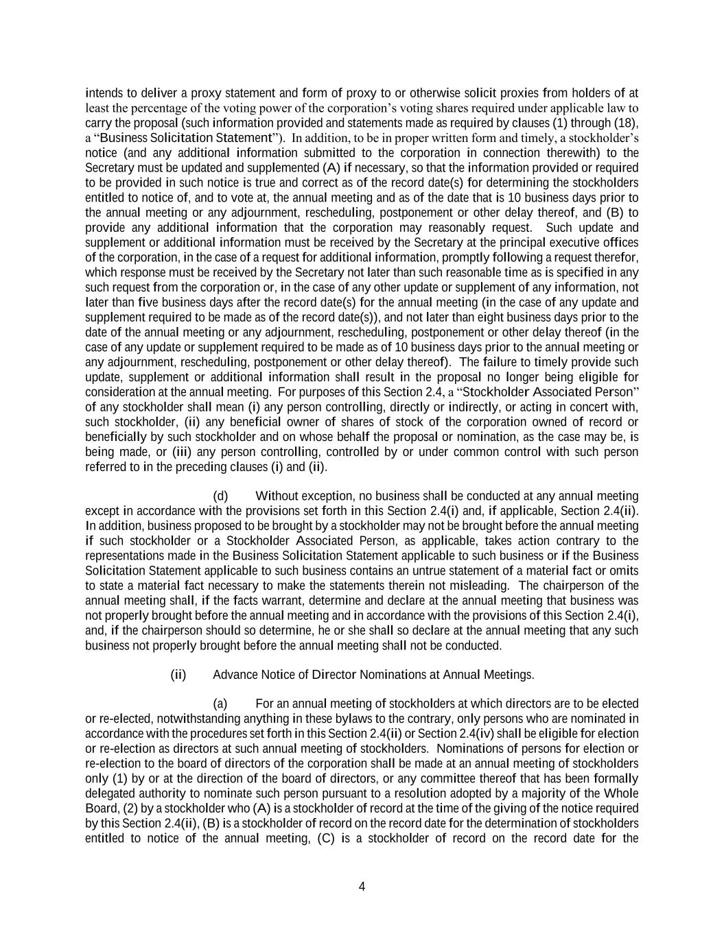 4 intends to deliver a proxy statement and form of proxy to or otherwise solicit proxies from holders of at least the percentage of the voting power of the corporation’s voting shares required under applicable law to carry the proposal (such information provided and statements made as required by clauses (1) through (18), a “Business Solicitation Statement”). In addition, to be in proper written form and timely, a stockholder’s notice (and any additional information submitted to the corporation in connection therewith) to the Secretary must be updated and supplemented (A) if necessary, so that the information provided or required to be provided in such notice is true and correct as of the record date(s) for determining the stockholders entitled to notice of, and to vote at, the annual meeting and as of the date that is 10 business days prior to the annual meeting or any adjournment, rescheduling, postponement or other delay thereof, and (B) to provide any additional information that the corporation may reasonably request. Such update and supplement or additional information must be received by the Secretary at the principal executive offices of the corporation, in the case of a request for additional information, promptly following a request therefor, which response must be received by the Secretary not later than such reasonable time as is specified in any such request from the corporation or, in the case of any other update or supplement of any information, not later than five business days after the record date(s) for the annual meeting (in the case of any update and supplement required to be made as of the record date(s)), and not later than eight business days prior to the date of the annual meeting or any adjournment, rescheduling, postponement or other delay thereof (in the case of any update or supplement required to be made as of 10 business days prior to the annual meeting or any adjournment, rescheduling, postponement or other delay thereof). The failure to timely provide such update, supplement or additional information shall result in the proposal no longer being eligible for consideration at the annual meeting. For purposes of this Section 2.4, a “Stockholder Associated Person” of any stockholder shall mean (i) any person controlling, directly or indirectly, or acting in concert with, such stockholder, (ii) any beneficial owner of shares of stock of the corporation owned of record or beneficially by such stockholder and on whose behalf the proposal or nomination, as the case may be, is being made, or (iii) any person controlling, controlled by or under common control with such person referred to in the preceding clauses (i) and (ii). (d) Without exception, no business shall be conducted at any annual meeting except in accordance with the provisions set forth in this Section 2.4(i) and, if applicable, Section 2.4(ii). In addition, business proposed to be brought by a stockholder may not be brought before the annual meeting if such stockholder or a Stockholder Associated Person, as applicable, takes action contrary to the representations made in the Business Solicitation Statement applicable to such business or if the Business Solicitation Statement applicable to such business contains an untrue statement of a material fact or omits to state a material fact necessary to make the statements therein not misleading. The chairperson of the annual meeting shall, if the facts warrant, determine and declare at the annual meeting that business was not properly brought before the annual meeting and in accordance with the provisions of this Section 2.4(i), and, if the chairperson should so determine, he or she shall so declare at the annual meeting that any such business not properly brought before the annual meeting shall not be conducted. (ii) Advance Notice of Director Nominations at Annual Meetings. (a) For an annual meeting of stockholders at which directors are to be elected or re-elected, notwithstanding anything in these bylaws to the contrary, only persons who are nominated in accordance with the procedures set forth in this Section 2.4(ii) or Section 2.4(iv) shall be eligible for election or re-election as directors at such annual meeting of stockholders. Nominations of persons for election or re-election to the board of directors of the corporation shall be made at an annual meeting of stockholders only (1) by or at the direction of the board of directors, or any committee thereof that has been formally delegated authority to nominate such person pursuant to a resolution adopted by a majority of the Whole Board, (2) by a stockholder who (A) is a stockholder of record at the time of the giving of the notice required by this Section 2.4(ii), (B) is a stockholder of record on the record date for the determination of stockholders entitled to notice of the annual meeting, (C) is a stockholder of record on the record date for the