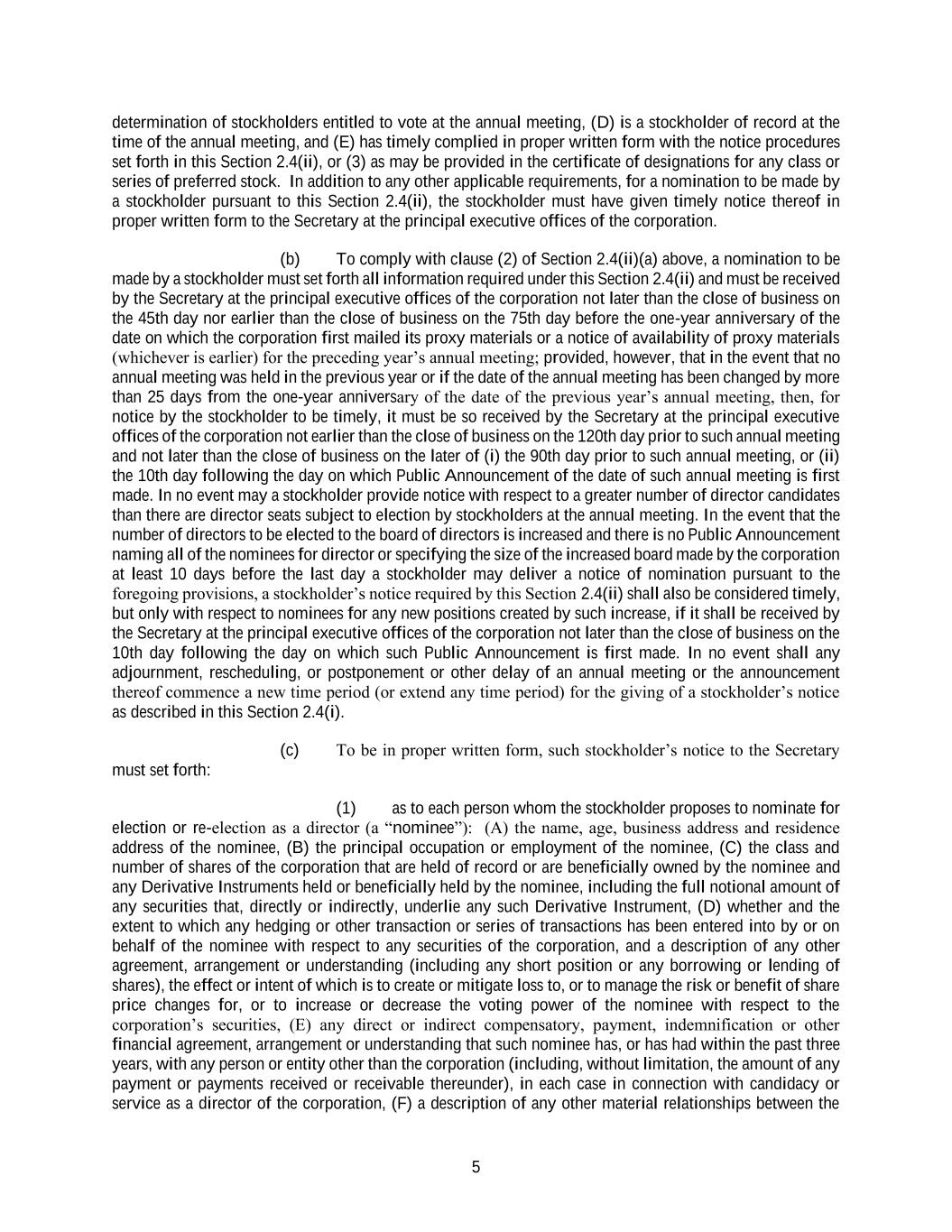 5 determination of stockholders entitled to vote at the annual meeting, (D) is a stockholder of record at the time of the annual meeting, and (E) has timely complied in proper written form with the notice procedures set forth in this Section 2.4(ii), or (3) as may be provided in the certificate of designations for any class or series of preferred stock. In addition to any other applicable requirements, for a nomination to be made by a stockholder pursuant to this Section 2.4(ii), the stockholder must have given timely notice thereof in proper written form to the Secretary at the principal executive offices of the corporation. (b) To comply with clause (2) of Section 2.4(ii)(a) above, a nomination to be made by a stockholder must set forth all information required under this Section 2.4(ii) and must be received by the Secretary at the principal executive offices of the corporation not later than the close of business on the 45th day nor earlier than the close of business on the 75th day before the one-year anniversary of the date on which the corporation first mailed its proxy materials or a notice of availability of proxy materials (whichever is earlier) for the preceding year’s annual meeting; provided, however, that in the event that no annual meeting was held in the previous year or if the date of the annual meeting has been changed by more than 25 days from the one-year anniversary of the date of the previous year’s annual meeting, then, for notice by the stockholder to be timely, it must be so received by the Secretary at the principal executive offices of the corporation not earlier than the close of business on the 120th day prior to such annual meeting and not later than the close of business on the later of (i) the 90th day prior to such annual meeting, or (ii) the 10th day following the day on which Public Announcement of the date of such annual meeting is first made. In no event may a stockholder provide notice with respect to a greater number of director candidates than there are director seats subject to election by stockholders at the annual meeting. In the event that the number of directors to be elected to the board of directors is increased and there is no Public Announcement naming all of the nominees for director or specifying the size of the increased board made by the corporation at least 10 days before the last day a stockholder may deliver a notice of nomination pursuant to the foregoing provisions, a stockholder’s notice required by this Section 2.4(ii) shall also be considered timely, but only with respect to nominees for any new positions created by such increase, if it shall be received by the Secretary at the principal executive offices of the corporation not later than the close of business on the 10th day following the day on which such Public Announcement is first made. In no event shall any adjournment, rescheduling, or postponement or other delay of an annual meeting or the announcement thereof commence a new time period (or extend any time period) for the giving of a stockholder’s notice as described in this Section 2.4(i). (c) To be in proper written form, such stockholder’s notice to the Secretary must set forth: (1) as to each person whom the stockholder proposes to nominate for election or re-election as a director (a “nominee”): (A) the name, age, business address and residence address of the nominee, (B) the principal occupation or employment of the nominee, (C) the class and number of shares of the corporation that are held of record or are beneficially owned by the nominee and any Derivative Instruments held or beneficially held by the nominee, including the full notional amount of any securities that, directly or indirectly, underlie any such Derivative Instrument, (D) whether and the extent to which any hedging or other transaction or series of transactions has been entered into by or on behalf of the nominee with respect to any securities of the corporation, and a description of any other agreement, arrangement or understanding (including any short position or any borrowing or lending of shares), the effect or intent of which is to create or mitigate loss to, or to manage the risk or benefit of share price changes for, or to increase or decrease the voting power of the nominee with respect to the corporation’s securities, (E) any direct or indirect compensatory, payment, indemnification or other financial agreement, arrangement or understanding that such nominee has, or has had within the past three years, with any person or entity other than the corporation (including, without limitation, the amount of any payment or payments received or receivable thereunder), in each case in connection with candidacy or service as a director of the corporation, (F) a description of any other material relationships between the