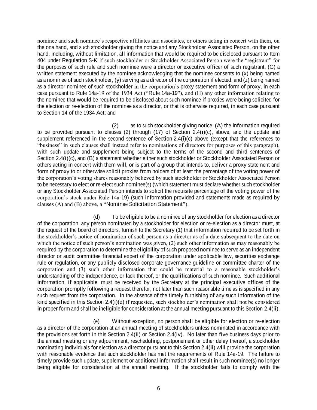 6 nominee and such nominee’s respective affiliates and associates, or others acting in concert with them, on the one hand, and such stockholder giving the notice and any Stockholder Associated Person, on the other hand, including, without limitation, all information that would be required to be disclosed pursuant to Item 404 under Regulation S-K if such stockholder or Stockholder Associated Person were the “registrant” for the purposes of such rule and such nominee were a director or executive officer of such registrant, (G) a written statement executed by the nominee acknowledging that the nominee consents to (x) being named as a nominee of such stockholder, (y) serving as a director of the corporation if elected, and (z) being named as a director nominee of such stockholder in the corporation’s proxy statement and form of proxy, in each case pursuant to Rule 14a-19 of the 1934 Act (“Rule 14a-19”), and (H) any other information relating to the nominee that would be required to be disclosed about such nominee if proxies were being solicited for the election or re-election of the nominee as a director, or that is otherwise required, in each case pursuant to Section 14 of the 1934 Act; and (2) as to such stockholder giving notice, (A) the information required to be provided pursuant to clauses (2) through (17) of Section 2.4(i)(c), above, and the update and supplement referenced in the second sentence of Section 2.4(i)(c) above (except that the references to “business” in such clauses shall instead refer to nominations of directors for purposes of this paragraph), with such update and supplement being subject to the terms of the second and third sentences of Section 2.4(i)(c), and (B) a statement whether either such stockholder or Stockholder Associated Person or others acting in concert with them will, or is part of a group that intends to, deliver a proxy statement and form of proxy to or otherwise solicit proxies from holders of at least the percentage of the voting power of the corporation’s voting shares reasonably believed by such stockholder or Stockholder Associated Person to be necessary to elect or re-elect such nominee(s) (which statement must declare whether such stockholder or any Stockholder Associated Person intends to solicit the requisite percentage of the voting power of the corporation’s stock under Rule 14a-19) (such information provided and statements made as required by clauses (A) and (B) above, a “Nominee Solicitation Statement”). (d) To be eligible to be a nominee of any stockholder for election as a director of the corporation, any person nominated by a stockholder for election or re-election as a director must, at the request of the board of directors, furnish to the Secretary (1) that information required to be set forth in the stockholder’s notice of nomination of such person as a director as of a date subsequent to the date on which the notice of such person’s nomination was given, (2) such other information as may reasonably be required by the corporation to determine the eligibility of such proposed nominee to serve as an independent director or audit committee financial expert of the corporation under applicable law, securities exchange rule or regulation, or any publicly disclosed corporate governance guideline or committee charter of the corporation and (3) such other information that could be material to a reasonable stockholder’s understanding of the independence, or lack thereof, or the qualifications of such nominee. Such additional information, if applicable, must be received by the Secretary at the principal executive offices of the corporation promptly following a request therefor, not later than such reasonable time as is specified in any such request from the corporation. In the absence of the timely furnishing of any such information of the kind specified in this Section 2.4(i)(d) if requested, such stockholder’s nomination shall not be considered in proper form and shall be ineligible for consideration at the annual meeting pursuant to this Section 2.4(ii). (e) Without exception, no person shall be eligible for election or re-election as a director of the corporation at an annual meeting of stockholders unless nominated in accordance with the provisions set forth in this Section 2.4(ii) or Section 2.4(iv). No later than five business days prior to the annual meeting or any adjournment, rescheduling, postponement or other delay thereof, a stockholder nominating individuals for election as a director pursuant to this Section 2.4(ii) will provide the corporation with reasonable evidence that such stockholder has met the requirements of Rule 14a-19. The failure to timely provide such update, supplement or additional information shall result in such nominee(s) no longer being eligible for consideration at the annual meeting. If the stockholder fails to comply with the