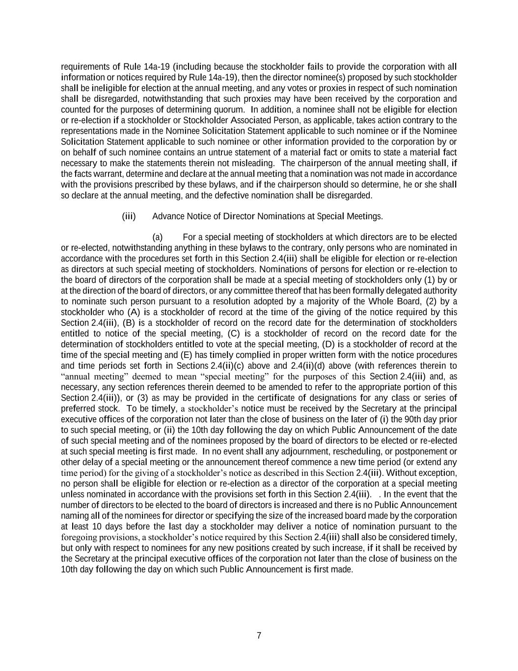 7 requirements of Rule 14a-19 (including because the stockholder fails to provide the corporation with all information or notices required by Rule 14a-19), then the director nominee(s) proposed by such stockholder shall be ineligible for election at the annual meeting, and any votes or proxies in respect of such nomination shall be disregarded, notwithstanding that such proxies may have been received by the corporation and counted for the purposes of determining quorum. In addition, a nominee shall not be eligible for election or re-election if a stockholder or Stockholder Associated Person, as applicable, takes action contrary to the representations made in the Nominee Solicitation Statement applicable to such nominee or if the Nominee Solicitation Statement applicable to such nominee or other information provided to the corporation by or on behalf of such nominee contains an untrue statement of a material fact or omits to state a material fact necessary to make the statements therein not misleading. The chairperson of the annual meeting shall, if the facts warrant, determine and declare at the annual meeting that a nomination was not made in accordance with the provisions prescribed by these bylaws, and if the chairperson should so determine, he or she shall so declare at the annual meeting, and the defective nomination shall be disregarded. (iii) Advance Notice of Director Nominations at Special Meetings. (a) For a special meeting of stockholders at which directors are to be elected or re-elected, notwithstanding anything in these bylaws to the contrary, only persons who are nominated in accordance with the procedures set forth in this Section 2.4(iii) shall be eligible for election or re-election as directors at such special meeting of stockholders. Nominations of persons for election or re-election to the board of directors of the corporation shall be made at a special meeting of stockholders only (1) by or at the direction of the board of directors, or any committee thereof that has been formally delegated authority to nominate such person pursuant to a resolution adopted by a majority of the Whole Board, (2) by a stockholder who (A) is a stockholder of record at the time of the giving of the notice required by this Section 2.4(iii), (B) is a stockholder of record on the record date for the determination of stockholders entitled to notice of the special meeting, (C) is a stockholder of record on the record date for the determination of stockholders entitled to vote at the special meeting, (D) is a stockholder of record at the time of the special meeting and (E) has timely complied in proper written form with the notice procedures and time periods set forth in Sections 2.4(ii)(c) above and 2.4(ii)(d) above (with references therein to “annual meeting” deemed to mean “special meeting” for the purposes of this Section 2.4(iii) and, as necessary, any section references therein deemed to be amended to refer to the appropriate portion of this Section 2.4(iii)), or (3) as may be provided in the certificate of designations for any class or series of preferred stock. To be timely, a stockholder’s notice must be received by the Secretary at the principal executive offices of the corporation not later than the close of business on the later of (i) the 90th day prior to such special meeting, or (ii) the 10th day following the day on which Public Announcement of the date of such special meeting and of the nominees proposed by the board of directors to be elected or re-elected at such special meeting is first made. In no event shall any adjournment, rescheduling, or postponement or other delay of a special meeting or the announcement thereof commence a new time period (or extend any time period) for the giving of a stockholder’s notice as described in this Section 2.4(iii). Without exception, no person shall be eligible for election or re-election as a director of the corporation at a special meeting unless nominated in accordance with the provisions set forth in this Section 2.4(iii). . In the event that the number of directors to be elected to the board of directors is increased and there is no Public Announcement naming all of the nominees for director or specifying the size of the increased board made by the corporation at least 10 days before the last day a stockholder may deliver a notice of nomination pursuant to the foregoing provisions, a stockholder’s notice required by this Section 2.4(iii) shall also be considered timely, but only with respect to nominees for any new positions created by such increase, if it shall be received by the Secretary at the principal executive offices of the corporation not later than the close of business on the 10th day following the day on which such Public Announcement is first made.