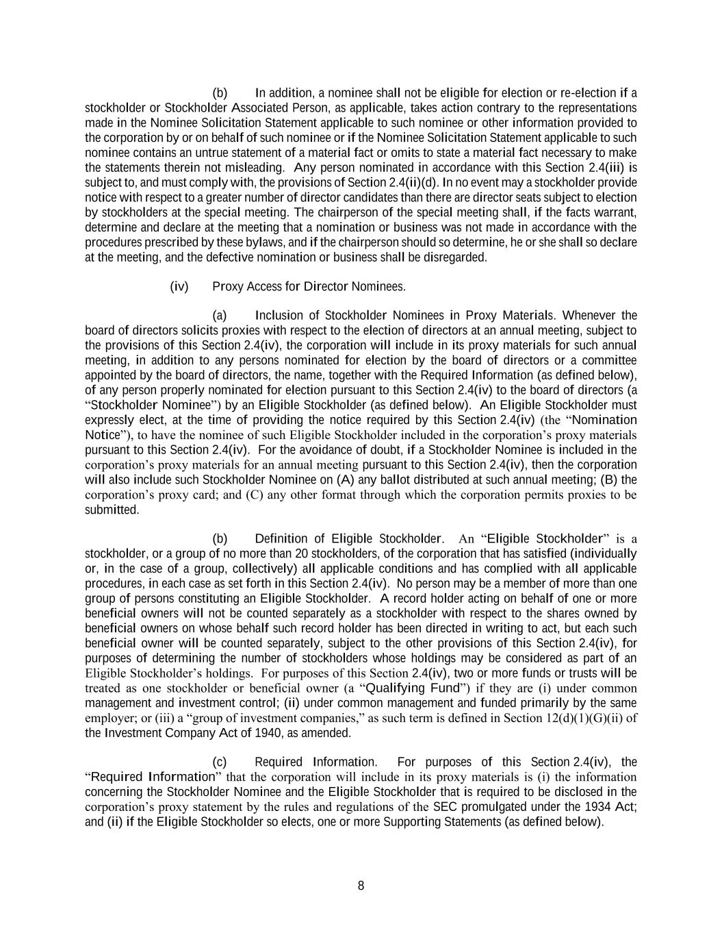 8 (b) In addition, a nominee shall not be eligible for election or re-election if a stockholder or Stockholder Associated Person, as applicable, takes action contrary to the representations made in the Nominee Solicitation Statement applicable to such nominee or other information provided to the corporation by or on behalf of such nominee or if the Nominee Solicitation Statement applicable to such nominee contains an untrue statement of a material fact or omits to state a material fact necessary to make the statements therein not misleading. Any person nominated in accordance with this Section 2.4(iii) is subject to, and must comply with, the provisions of Section 2.4(ii)(d). In no event may a stockholder provide notice with respect to a greater number of director candidates than there are director seats subject to election by stockholders at the special meeting. The chairperson of the special meeting shall, if the facts warrant, determine and declare at the meeting that a nomination or business was not made in accordance with the procedures prescribed by these bylaws, and if the chairperson should so determine, he or she shall so declare at the meeting, and the defective nomination or business shall be disregarded. (iv) Proxy Access for Director Nominees. (a) Inclusion of Stockholder Nominees in Proxy Materials. Whenever the board of directors solicits proxies with respect to the election of directors at an annual meeting, subject to the provisions of this Section 2.4(iv), the corporation will include in its proxy materials for such annual meeting, in addition to any persons nominated for election by the board of directors or a committee appointed by the board of directors, the name, together with the Required Information (as defined below), of any person properly nominated for election pursuant to this Section 2.4(iv) to the board of directors (a “Stockholder Nominee”) by an Eligible Stockholder (as defined below). An Eligible Stockholder must expressly elect, at the time of providing the notice required by this Section 2.4(iv) (the “Nomination Notice”), to have the nominee of such Eligible Stockholder included in the corporation’s proxy materials pursuant to this Section 2.4(iv). For the avoidance of doubt, if a Stockholder Nominee is included in the corporation’s proxy materials for an annual meeting pursuant to this Section 2.4(iv), then the corporation will also include such Stockholder Nominee on (A) any ballot distributed at such annual meeting; (B) the corporation’s proxy card; and (C) any other format through which the corporation permits proxies to be submitted. (b) Definition of Eligible Stockholder. An “Eligible Stockholder” is a stockholder, or a group of no more than 20 stockholders, of the corporation that has satisfied (individually or, in the case of a group, collectively) all applicable conditions and has complied with all applicable procedures, in each case as set forth in this Section 2.4(iv). No person may be a member of more than one group of persons constituting an Eligible Stockholder. A record holder acting on behalf of one or more beneficial owners will not be counted separately as a stockholder with respect to the shares owned by beneficial owners on whose behalf such record holder has been directed in writing to act, but each such beneficial owner will be counted separately, subject to the other provisions of this Section 2.4(iv), for purposes of determining the number of stockholders whose holdings may be considered as part of an Eligible Stockholder’s holdings. For purposes of this Section 2.4(iv), two or more funds or trusts will be treated as one stockholder or beneficial owner (a “Qualifying Fund”) if they are (i) under common management and investment control; (ii) under common management and funded primarily by the same employer; or (iii) a “group of investment companies,” as such term is defined in Section 12(d)(1)(G)(ii) of the Investment Company Act of 1940, as amended. (c) Required Information. For purposes of this Section 2.4(iv), the “Required Information” that the corporation will include in its proxy materials is (i) the information concerning the Stockholder Nominee and the Eligible Stockholder that is required to be disclosed in the corporation’s proxy statement by the rules and regulations of the SEC promulgated under the 1934 Act; and (ii) if the Eligible Stockholder so elects, one or more Supporting Statements (as defined below).