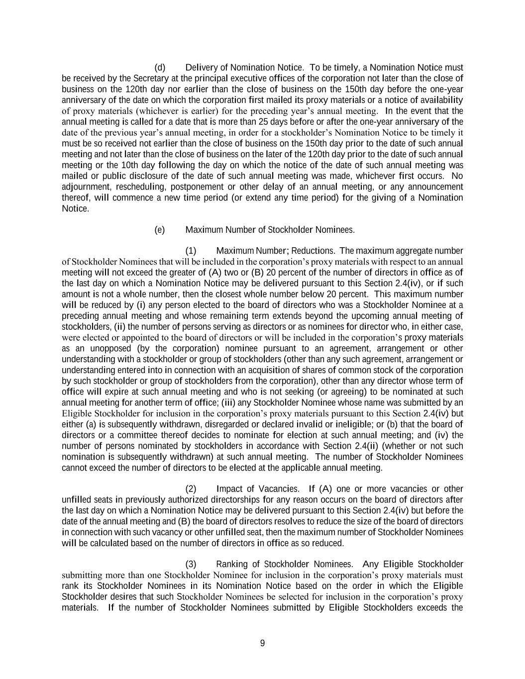 9 (d) Delivery of Nomination Notice. To be timely, a Nomination Notice must be received by the Secretary at the principal executive offices of the corporation not later than the close of business on the 120th day nor earlier than the close of business on the 150th day before the one-year anniversary of the date on which the corporation first mailed its proxy materials or a notice of availability of proxy materials (whichever is earlier) for the preceding year’s annual meeting. In the event that the annual meeting is called for a date that is more than 25 days before or after the one-year anniversary of the date of the previous year’s annual meeting, in order for a stockholder’s Nomination Notice to be timely it must be so received not earlier than the close of business on the 150th day prior to the date of such annual meeting and not later than the close of business on the later of the 120th day prior to the date of such annual meeting or the 10th day following the day on which the notice of the date of such annual meeting was mailed or public disclosure of the date of such annual meeting was made, whichever first occurs. No adjournment, rescheduling, postponement or other delay of an annual meeting, or any announcement thereof, will commence a new time period (or extend any time period) for the giving of a Nomination Notice. (e) Maximum Number of Stockholder Nominees. (1) Maximum Number; Reductions. The maximum aggregate number of Stockholder Nominees that will be included in the corporation’s proxy materials with respect to an annual meeting will not exceed the greater of (A) two or (B) 20 percent of the number of directors in office as of the last day on which a Nomination Notice may be delivered pursuant to this Section 2.4(iv), or if such amount is not a whole number, then the closest whole number below 20 percent. This maximum number will be reduced by (i) any person elected to the board of directors who was a Stockholder Nominee at a preceding annual meeting and whose remaining term extends beyond the upcoming annual meeting of stockholders, (ii) the number of persons serving as directors or as nominees for director who, in either case, were elected or appointed to the board of directors or will be included in the corporation’s proxy materials as an unopposed (by the corporation) nominee pursuant to an agreement, arrangement or other understanding with a stockholder or group of stockholders (other than any such agreement, arrangement or understanding entered into in connection with an acquisition of shares of common stock of the corporation by such stockholder or group of stockholders from the corporation), other than any director whose term of office will expire at such annual meeting and who is not seeking (or agreeing) to be nominated at such annual meeting for another term of office; (iii) any Stockholder Nominee whose name was submitted by an Eligible Stockholder for inclusion in the corporation’s proxy materials pursuant to this Section 2.4(iv) but either (a) is subsequently withdrawn, disregarded or declared invalid or ineligible; or (b) that the board of directors or a committee thereof decides to nominate for election at such annual meeting; and (iv) the number of persons nominated by stockholders in accordance with Section 2.4(ii) (whether or not such nomination is subsequently withdrawn) at such annual meeting. The number of Stockholder Nominees cannot exceed the number of directors to be elected at the applicable annual meeting. (2) Impact of Vacancies. If (A) one or more vacancies or other unfilled seats in previously authorized directorships for any reason occurs on the board of directors after the last day on which a Nomination Notice may be delivered pursuant to this Section 2.4(iv) but before the date of the annual meeting and (B) the board of directors resolves to reduce the size of the board of directors in connection with such vacancy or other unfilled seat, then the maximum number of Stockholder Nominees will be calculated based on the number of directors in office as so reduced. (3) Ranking of Stockholder Nominees. Any Eligible Stockholder submitting more than one Stockholder Nominee for inclusion in the corporation’s proxy materials must rank its Stockholder Nominees in its Nomination Notice based on the order in which the Eligible Stockholder desires that such Stockholder Nominees be selected for inclusion in the corporation’s proxy materials. If the number of Stockholder Nominees submitted by Eligible Stockholders exceeds the