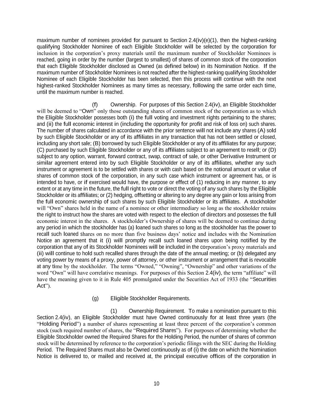 10 maximum number of nominees provided for pursuant to Section 2.4(iv)(e)(1), then the highest-ranking qualifying Stockholder Nominee of each Eligible Stockholder will be selected by the corporation for inclusion in the corporation’s proxy materials until the maximum number of Stockholder Nominees is reached, going in order by the number (largest to smallest) of shares of common stock of the corporation that each Eligible Stockholder disclosed as Owned (as defined below) in its Nomination Notice. If the maximum number of Stockholder Nominees is not reached after the highest-ranking qualifying Stockholder Nominee of each Eligible Stockholder has been selected, then this process will continue with the next highest-ranked Stockholder Nominees as many times as necessary, following the same order each time, until the maximum number is reached. (f) Ownership. For purposes of this Section 2.4(iv), an Eligible Stockholder will be deemed to “Own” only those outstanding shares of common stock of the corporation as to which the Eligible Stockholder possesses both (i) the full voting and investment rights pertaining to the shares; and (ii) the full economic interest in (including the opportunity for profit and risk of loss on) such shares. The number of shares calculated in accordance with the prior sentence will not include any shares (A) sold by such Eligible Stockholder or any of its affiliates in any transaction that has not been settled or closed, including any short sale; (B) borrowed by such Eligible Stockholder or any of its affiliates for any purpose; (C) purchased by such Eligible Stockholder or any of its affiliates subject to an agreement to resell; or (D) subject to any option, warrant, forward contract, swap, contract of sale, or other Derivative Instrument or similar agreement entered into by such Eligible Stockholder or any of its affiliates, whether any such instrument or agreement is to be settled with shares or with cash based on the notional amount or value of shares of common stock of the corporation, in any such case which instrument or agreement has, or is intended to have, or if exercised would have, the purpose or effect of (1) reducing in any manner, to any extent or at any time in the future, the full right to vote or direct the voting of any such shares by the Eligible Stockholder or its affiliates; or (2) hedging, offsetting or altering to any degree any gain or loss arising from the full economic ownership of such shares by such Eligible Stockholder or its affiliates. A stockholder will “Own” shares held in the name of a nominee or other intermediary so long as the stockholder retains the right to instruct how the shares are voted with respect to the election of directors and possesses the full economic interest in the shares. A stockholder’s Ownership of shares will be deemed to continue during any period in which the stockholder has (a) loaned such shares so long as the stockholder has the power to recall such loaned shares on no more than five business days’ notice and includes with the Nomination Notice an agreement that it (i) will promptly recall such loaned shares upon being notified by the corporation that any of its Stockholder Nominees will be included in the corporation’s proxy materials and (ii) will continue to hold such recalled shares through the date of the annual meeting; or (b) delegated any voting power by means of a proxy, power of attorney, or other instrument or arrangement that is revocable at any time by the stockholder. The terms “Owned,” “Owning”, “Ownership” and other variations of the word “Own” will have correlative meanings. For purposes of this Section 2.4(iv), the term “affiliate” will have the meaning given to it in Rule 405 promulgated under the Securities Act of 1933 (the “Securities Act”). (g) Eligible Stockholder Requirements. (1) Ownership Requirement. To make a nomination pursuant to this Section 2.4(iv), an Eligible Stockholder must have Owned continuously for at least three years (the “Holding Period”) a number of shares representing at least three percent of the corporation’s common stock (such required number of shares, the “Required Shares”). For purposes of determining whether the Eligible Stockholder owned the Required Shares for the Holding Period, the number of shares of common stock will be determined by reference to the corporation’s periodic filings with the SEC during the Holding Period. The Required Shares must also be Owned continuously as of (i) the date on which the Nomination Notice is delivered to, or mailed and received at, the principal executive offices of the corporation in