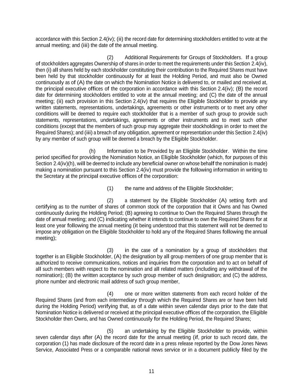 11 accordance with this Section 2.4(iv); (ii) the record date for determining stockholders entitled to vote at the annual meeting; and (iii) the date of the annual meeting. (2) Additional Requirements for Groups of Stockholders. If a group of stockholders aggregates Ownership of shares in order to meet the requirements under this Section 2.4(iv), then (i) all shares held by each stockholder constituting their contribution to the Required Shares must have been held by that stockholder continuously for at least the Holding Period, and must also be Owned continuously as of (A) the date on which the Nomination Notice is delivered to, or mailed and received at, the principal executive offices of the corporation in accordance with this Section 2.4(iv); (B) the record date for determining stockholders entitled to vote at the annual meeting; and (C) the date of the annual meeting; (ii) each provision in this Section 2.4(iv) that requires the Eligible Stockholder to provide any written statements, representations, undertakings, agreements or other instruments or to meet any other conditions will be deemed to require each stockholder that is a member of such group to provide such statements, representations, undertakings, agreements or other instruments and to meet such other conditions (except that the members of such group may aggregate their stockholdings in order to meet the Required Shares); and (iii) a breach of any obligation, agreement or representation under this Section 2.4(iv) by any member of such group will be deemed a breach by the Eligible Stockholder. (h) Information to be Provided by an Eligible Stockholder. Within the time period specified for providing the Nomination Notice, an Eligible Stockholder (which, for purposes of this Section 2.4(iv)(h), will be deemed to include any beneficial owner on whose behalf the nomination is made) making a nomination pursuant to this Section 2.4(iv) must provide the following information in writing to the Secretary at the principal executive offices of the corporation: (1) the name and address of the Eligible Stockholder; (2) a statement by the Eligible Stockholder (A) setting forth and certifying as to the number of shares of common stock of the corporation that it Owns and has Owned continuously during the Holding Period; (B) agreeing to continue to Own the Required Shares through the date of annual meeting; and (C) indicating whether it intends to continue to own the Required Shares for at least one year following the annual meeting (it being understood that this statement will not be deemed to impose any obligation on the Eligible Stockholder to hold any of the Required Shares following the annual meeting); (3) in the case of a nomination by a group of stockholders that together is an Eligible Stockholder, (A) the designation by all group members of one group member that is authorized to receive communications, notices and inquiries from the corporation and to act on behalf of all such members with respect to the nomination and all related matters (including any withdrawal of the nomination); (B) the written acceptance by such group member of such designation; and (C) the address, phone number and electronic mail address of such group member, (4) one or more written statements from each record holder of the Required Shares (and from each intermediary through which the Required Shares are or have been held during the Holding Period) verifying that, as of a date within seven calendar days prior to the date that Nomination Notice is delivered or received at the principal executive offices of the corporation, the Eligible Stockholder then Owns, and has Owned continuously for the Holding Period, the Required Shares; (5) an undertaking by the Eligible Stockholder to provide, within seven calendar days after (A) the record date for the annual meeting (if, prior to such record date, the corporation (1) has made disclosure of the record date in a press release reported by the Dow Jones News Service, Associated Press or a comparable national news service or in a document publicly filed by the