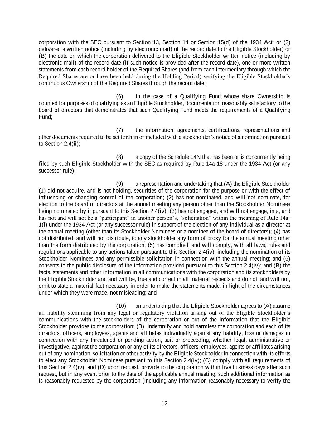12 corporation with the SEC pursuant to Section 13, Section 14 or Section 15(d) of the 1934 Act; or (2) delivered a written notice (including by electronic mail) of the record date to the Eligible Stockholder) or (B) the date on which the corporation delivered to the Eligible Stockholder written notice (including by electronic mail) of the record date (if such notice is provided after the record date), one or more written statements from each record holder of the Required Shares (and from each intermediary through which the Required Shares are or have been held during the Holding Period) verifying the Eligible Stockholder’s continuous Ownership of the Required Shares through the record date; (6) in the case of a Qualifying Fund whose share Ownership is counted for purposes of qualifying as an Eligible Stockholder, documentation reasonably satisfactory to the board of directors that demonstrates that such Qualifying Fund meets the requirements of a Qualifying Fund; (7) the information, agreements, certifications, representations and other documents required to be set forth in or included with a stockholder’s notice of a nomination pursuant to Section 2.4(ii); (8) a copy of the Schedule 14N that has been or is concurrently being filed by such Eligible Stockholder with the SEC as required by Rule 14a-18 under the 1934 Act (or any successor rule); (9) a representation and undertaking that (A) the Eligible Stockholder (1) did not acquire, and is not holding, securities of the corporation for the purpose or with the effect of influencing or changing control of the corporation; (2) has not nominated, and will not nominate, for election to the board of directors at the annual meeting any person other than the Stockholder Nominees being nominated by it pursuant to this Section 2.4(iv); (3) has not engaged, and will not engage, in a, and has not and will not be a “participant” in another person’s, “solicitation” within the meaning of Rule 14a- 1(l) under the 1934 Act (or any successor rule) in support of the election of any individual as a director at the annual meeting (other than its Stockholder Nominees or a nominee of the board of directors); (4) has not distributed, and will not distribute, to any stockholder any form of proxy for the annual meeting other than the form distributed by the corporation; (5) has complied, and will comply, with all laws, rules and regulations applicable to any actions taken pursuant to this Section 2.4(iv), including the nomination of its Stockholder Nominees and any permissible solicitation in connection with the annual meeting; and (6) consents to the public disclosure of the information provided pursuant to this Section 2.4(iv); and (B) the facts, statements and other information in all communications with the corporation and its stockholders by the Eligible Stockholder are, and will be, true and correct in all material respects and do not, and will not, omit to state a material fact necessary in order to make the statements made, in light of the circumstances under which they were made, not misleading; and (10) an undertaking that the Eligible Stockholder agrees to (A) assume all liability stemming from any legal or regulatory violation arising out of the Eligible Stockholder’s communications with the stockholders of the corporation or out of the information that the Eligible Stockholder provides to the corporation; (B) indemnify and hold harmless the corporation and each of its directors, officers, employees, agents and affiliates individually against any liability, loss or damages in connection with any threatened or pending action, suit or proceeding, whether legal, administrative or investigative, against the corporation or any of its directors, officers, employees, agents or affiliates arising out of any nomination, solicitation or other activity by the Eligible Stockholder in connection with its efforts to elect any Stockholder Nominees pursuant to this Section 2.4(iv); (C) comply with all requirements of this Section 2.4(iv); and (D) upon request, provide to the corporation within five business days after such request, but in any event prior to the date of the applicable annual meeting, such additional information as is reasonably requested by the corporation (including any information reasonably necessary to verify the