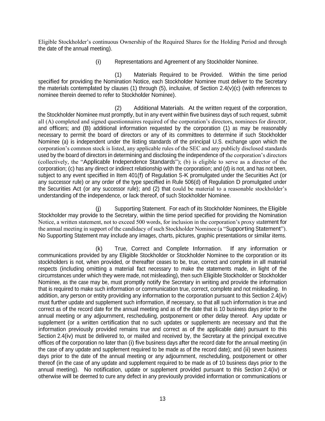 13 Eligible Stockholder’s continuous Ownership of the Required Shares for the Holding Period and through the date of the annual meeting). (i) Representations and Agreement of any Stockholder Nominee. (1) Materials Required to be Provided. Within the time period specified for providing the Nomination Notice, each Stockholder Nominee must deliver to the Secretary the materials contemplated by clauses (1) through (5), inclusive, of Section 2.4(v)(c) (with references to nominee therein deemed to refer to Stockholder Nominee). (2) Additional Materials. At the written request of the corporation, the Stockholder Nominee must promptly, but in any event within five business days of such request, submit all (A) completed and signed questionnaires required of the corporation’s directors, nominees for director, and officers; and (B) additional information requested by the corporation (1) as may be reasonably necessary to permit the board of directors or any of its committees to determine if such Stockholder Nominee (a) is independent under the listing standards of the principal U.S. exchange upon which the corporation’s common stock is listed, any applicable rules of the SEC and any publicly disclosed standards used by the board of directors in determining and disclosing the independence of the corporation’s directors (collectively, the “Applicable Independence Standards”); (b) is eligible to serve as a director of the corporation; (c) has any direct or indirect relationship with the corporation; and (d) is not, and has not been, subject to any event specified in Item 401(f) of Regulation S-K promulgated under the Securities Act (or any successor rule) or any order of the type specified in Rule 506(d) of Regulation D promulgated under the Securities Act (or any successor rule); and (2) that could be material to a reasonable stockholder’s understanding of the independence, or lack thereof, of such Stockholder Nominee. (j) Supporting Statement. For each of its Stockholder Nominees, the Eligible Stockholder may provide to the Secretary, within the time period specified for providing the Nomination Notice, a written statement, not to exceed 500 words, for inclusion in the corporation’s proxy statement for the annual meeting in support of the candidacy of such Stockholder Nominee (a “Supporting Statement”). No Supporting Statement may include any images, charts, pictures, graphic presentations or similar items. (k) True, Correct and Complete Information. If any information or communications provided by any Eligible Stockholder or Stockholder Nominee to the corporation or its stockholders is not, when provided, or thereafter ceases to be, true, correct and complete in all material respects (including omitting a material fact necessary to make the statements made, in light of the circumstances under which they were made, not misleading), then such Eligible Stockholder or Stockholder Nominee, as the case may be, must promptly notify the Secretary in writing and provide the information that is required to make such information or communication true, correct, complete and not misleading. In addition, any person or entity providing any information to the corporation pursuant to this Section 2.4(iv) must further update and supplement such information, if necessary, so that all such information is true and correct as of the record date for the annual meeting and as of the date that is 10 business days prior to the annual meeting or any adjournment, rescheduling, postponement or other delay thereof. Any update or supplement (or a written certification that no such updates or supplements are necessary and that the information previously provided remains true and correct as of the applicable date) pursuant to this Section 2.4(iv) must be delivered to, or mailed and received by, the Secretary at the principal executive offices of the corporation no later than (i) five business days after the record date for the annual meeting (in the case of any update and supplement required to be made as of the record date); and (ii) seven business days prior to the date of the annual meeting or any adjournment, rescheduling, postponement or other thereof (in the case of any update and supplement required to be made as of 10 business days prior to the annual meeting). No notification, update or supplement provided pursuant to this Section 2.4(iv) or otherwise will be deemed to cure any defect in any previously provided information or communications or