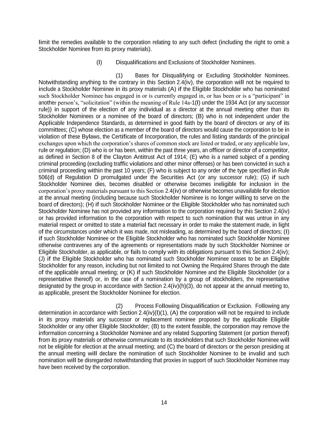 14 limit the remedies available to the corporation relating to any such defect (including the right to omit a Stockholder Nominee from its proxy materials). (l) Disqualifications and Exclusions of Stockholder Nominees. (1) Bases for Disqualifying or Excluding Stockholder Nominees. Notwithstanding anything to the contrary in this Section 2.4(iv), the corporation will not be required to include a Stockholder Nominee in its proxy materials (A) if the Eligible Stockholder who has nominated such Stockholder Nominee has engaged in or is currently engaged in, or has been or is a “participant” in another person’s, “solicitation” (within the meaning of Rule 14a-1(l) under the 1934 Act (or any successor rule)) in support of the election of any individual as a director at the annual meeting other than its Stockholder Nominees or a nominee of the board of directors; (B) who is not independent under the Applicable Independence Standards, as determined in good faith by the board of directors or any of its committees; (C) whose election as a member of the board of directors would cause the corporation to be in violation of these Bylaws, the Certificate of Incorporation, the rules and listing standards of the principal exchanges upon which the corporation’s shares of common stock are listed or traded, or any applicable law, rule or regulation; (D) who is or has been, within the past three years, an officer or director of a competitor, as defined in Section 8 of the Clayton Antitrust Act of 1914; (E) who is a named subject of a pending criminal proceeding (excluding traffic violations and other minor offenses) or has been convicted in such a criminal proceeding within the past 10 years; (F) who is subject to any order of the type specified in Rule 506(d) of Regulation D promulgated under the Securities Act (or any successor rule); (G) if such Stockholder Nominee dies, becomes disabled or otherwise becomes ineligible for inclusion in the corporation’s proxy materials pursuant to this Section 2.4(iv) or otherwise becomes unavailable for election at the annual meeting (including because such Stockholder Nominee is no longer willing to serve on the board of directors); (H) if such Stockholder Nominee or the Eligible Stockholder who has nominated such Stockholder Nominee has not provided any information to the corporation required by this Section 2.4(iv) or has provided information to the corporation with respect to such nomination that was untrue in any material respect or omitted to state a material fact necessary in order to make the statement made, in light of the circumstances under which it was made, not misleading, as determined by the board of directors; (I) if such Stockholder Nominee or the Eligible Stockholder who has nominated such Stockholder Nominee otherwise contravenes any of the agreements or representations made by such Stockholder Nominee or Eligible Stockholder, as applicable, or fails to comply with its obligations pursuant to this Section 2.4(iv); (J) if the Eligible Stockholder who has nominated such Stockholder Nominee ceases to be an Eligible Stockholder for any reason, including but not limited to not Owning the Required Shares through the date of the applicable annual meeting; or (K) if such Stockholder Nominee and the Eligible Stockholder (or a representative thereof) or, in the case of a nomination by a group of stockholders, the representative designated by the group in accordance with Section 2.4(iv)(h)(3), do not appear at the annual meeting to, as applicable, present the Stockholder Nominee for election. (2) Process Following Disqualification or Exclusion. Following any determination in accordance with Section 2.4(iv)(l)(1), (A) the corporation will not be required to include in its proxy materials any successor or replacement nominee proposed by the applicable Eligible Stockholder or any other Eligible Stockholder; (B) to the extent feasible, the corporation may remove the information concerning a Stockholder Nominee and any related Supporting Statement (or portion thereof) from its proxy materials or otherwise communicate to its stockholders that such Stockholder Nominee will not be eligible for election at the annual meeting; and (C) the board of directors or the person presiding at the annual meeting will declare the nomination of such Stockholder Nominee to be invalid and such nomination will be disregarded notwithstanding that proxies in support of such Stockholder Nominee may have been received by the corporation.