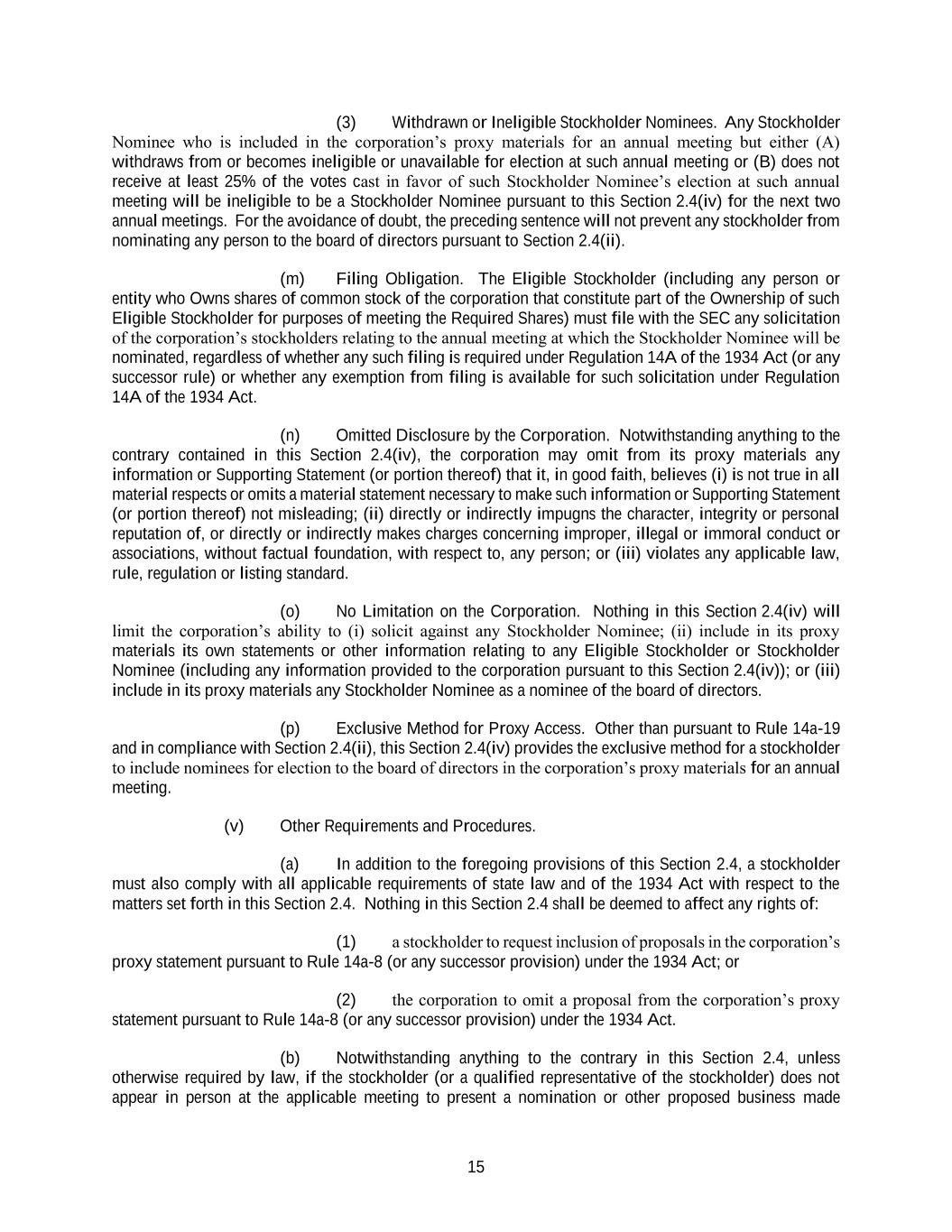 15 (3) Withdrawn or Ineligible Stockholder Nominees. Any Stockholder Nominee who is included in the corporation’s proxy materials for an annual meeting but either (A) withdraws from or becomes ineligible or unavailable for election at such annual meeting or (B) does not receive at least 25% of the votes cast in favor of such Stockholder Nominee’s election at such annual meeting will be ineligible to be a Stockholder Nominee pursuant to this Section 2.4(iv) for the next two annual meetings. For the avoidance of doubt, the preceding sentence will not prevent any stockholder from nominating any person to the board of directors pursuant to Section 2.4(ii). (m) Filing Obligation. The Eligible Stockholder (including any person or entity who Owns shares of common stock of the corporation that constitute part of the Ownership of such Eligible Stockholder for purposes of meeting the Required Shares) must file with the SEC any solicitation of the corporation’s stockholders relating to the annual meeting at which the Stockholder Nominee will be nominated, regardless of whether any such filing is required under Regulation 14A of the 1934 Act (or any successor rule) or whether any exemption from filing is available for such solicitation under Regulation 14A of the 1934 Act. (n) Omitted Disclosure by the Corporation. Notwithstanding anything to the contrary contained in this Section 2.4(iv), the corporation may omit from its proxy materials any information or Supporting Statement (or portion thereof) that it, in good faith, believes (i) is not true in all material respects or omits a material statement necessary to make such information or Supporting Statement (or portion thereof) not misleading; (ii) directly or indirectly impugns the character, integrity or personal reputation of, or directly or indirectly makes charges concerning improper, illegal or immoral conduct or associations, without factual foundation, with respect to, any person; or (iii) violates any applicable law, rule, regulation or listing standard. (o) No Limitation on the Corporation. Nothing in this Section 2.4(iv) will limit the corporation’s ability to (i) solicit against any Stockholder Nominee; (ii) include in its proxy materials its own statements or other information relating to any Eligible Stockholder or Stockholder Nominee (including any information provided to the corporation pursuant to this Section 2.4(iv)); or (iii) include in its proxy materials any Stockholder Nominee as a nominee of the board of directors. (p) Exclusive Method for Proxy Access. Other than pursuant to Rule 14a-19 and in compliance with Section 2.4(ii), this Section 2.4(iv) provides the exclusive method for a stockholder to include nominees for election to the board of directors in the corporation’s proxy materials for an annual meeting. (v) Other Requirements and Procedures. (a) In addition to the foregoing provisions of this Section 2.4, a stockholder must also comply with all applicable requirements of state law and of the 1934 Act with respect to the matters set forth in this Section 2.4. Nothing in this Section 2.4 shall be deemed to affect any rights of: (1) a stockholder to request inclusion of proposals in the corporation’s proxy statement pursuant to Rule 14a-8 (or any successor provision) under the 1934 Act; or (2) the corporation to omit a proposal from the corporation’s proxy statement pursuant to Rule 14a-8 (or any successor provision) under the 1934 Act. (b) Notwithstanding anything to the contrary in this Section 2.4, unless otherwise required by law, if the stockholder (or a qualified representative of the stockholder) does not appear in person at the applicable meeting to present a nomination or other proposed business made