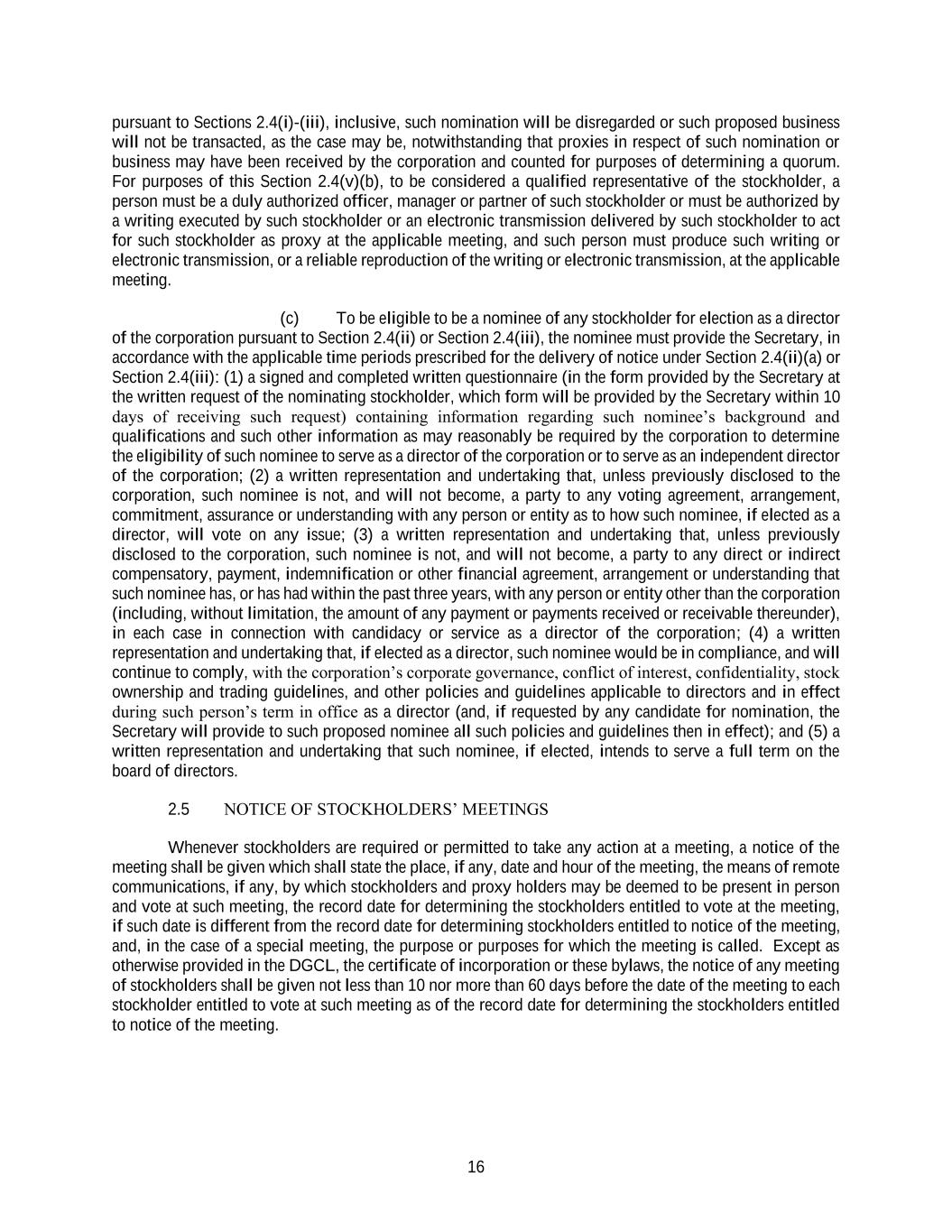 16 pursuant to Sections 2.4(i)-(iii), inclusive, such nomination will be disregarded or such proposed business will not be transacted, as the case may be, notwithstanding that proxies in respect of such nomination or business may have been received by the corporation and counted for purposes of determining a quorum. For purposes of this Section 2.4(v)(b), to be considered a qualified representative of the stockholder, a person must be a duly authorized officer, manager or partner of such stockholder or must be authorized by a writing executed by such stockholder or an electronic transmission delivered by such stockholder to act for such stockholder as proxy at the applicable meeting, and such person must produce such writing or electronic transmission, or a reliable reproduction of the writing or electronic transmission, at the applicable meeting. (c) To be eligible to be a nominee of any stockholder for election as a director of the corporation pursuant to Section 2.4(ii) or Section 2.4(iii), the nominee must provide the Secretary, in accordance with the applicable time periods prescribed for the delivery of notice under Section 2.4(ii)(a) or Section 2.4(iii): (1) a signed and completed written questionnaire (in the form provided by the Secretary at the written request of the nominating stockholder, which form will be provided by the Secretary within 10 days of receiving such request) containing information regarding such nominee’s background and qualifications and such other information as may reasonably be required by the corporation to determine the eligibility of such nominee to serve as a director of the corporation or to serve as an independent director of the corporation; (2) a written representation and undertaking that, unless previously disclosed to the corporation, such nominee is not, and will not become, a party to any voting agreement, arrangement, commitment, assurance or understanding with any person or entity as to how such nominee, if elected as a director, will vote on any issue; (3) a written representation and undertaking that, unless previously disclosed to the corporation, such nominee is not, and will not become, a party to any direct or indirect compensatory, payment, indemnification or other financial agreement, arrangement or understanding that such nominee has, or has had within the past three years, with any person or entity other than the corporation (including, without limitation, the amount of any payment or payments received or receivable thereunder), in each case in connection with candidacy or service as a director of the corporation; (4) a written representation and undertaking that, if elected as a director, such nominee would be in compliance, and will continue to comply, with the corporation’s corporate governance, conflict of interest, confidentiality, stock ownership and trading guidelines, and other policies and guidelines applicable to directors and in effect during such person’s term in office as a director (and, if requested by any candidate for nomination, the Secretary will provide to such proposed nominee all such policies and guidelines then in effect); and (5) a written representation and undertaking that such nominee, if elected, intends to serve a full term on the board of directors. 2.5 NOTICE OF STOCKHOLDERS’ MEETINGS Whenever stockholders are required or permitted to take any action at a meeting, a notice of the meeting shall be given which shall state the place, if any, date and hour of the meeting, the means of remote communications, if any, by which stockholders and proxy holders may be deemed to be present in person and vote at such meeting, the record date for determining the stockholders entitled to vote at the meeting, if such date is different from the record date for determining stockholders entitled to notice of the meeting, and, in the case of a special meeting, the purpose or purposes for which the meeting is called. Except as otherwise provided in the DGCL, the certificate of incorporation or these bylaws, the notice of any meeting of stockholders shall be given not less than 10 nor more than 60 days before the date of the meeting to each stockholder entitled to vote at such meeting as of the record date for determining the stockholders entitled to notice of the meeting.