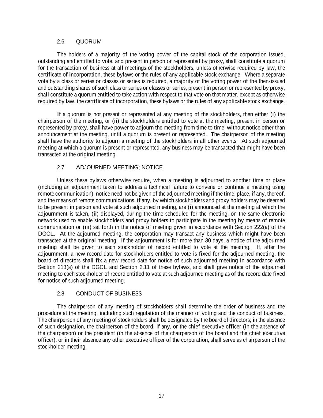 17 2.6 QUORUM The holders of a majority of the voting power of the capital stock of the corporation issued, outstanding and entitled to vote, and present in person or represented by proxy, shall constitute a quorum for the transaction of business at all meetings of the stockholders, unless otherwise required by law, the certificate of incorporation, these bylaws or the rules of any applicable stock exchange. Where a separate vote by a class or series or classes or series is required, a majority of the voting power of the then-issued and outstanding shares of such class or series or classes or series, present in person or represented by proxy, shall constitute a quorum entitled to take action with respect to that vote on that matter, except as otherwise required by law, the certificate of incorporation, these bylaws or the rules of any applicable stock exchange. If a quorum is not present or represented at any meeting of the stockholders, then either (i) the chairperson of the meeting, or (ii) the stockholders entitled to vote at the meeting, present in person or represented by proxy, shall have power to adjourn the meeting from time to time, without notice other than announcement at the meeting, until a quorum is present or represented. The chairperson of the meeting shall have the authority to adjourn a meeting of the stockholders in all other events. At such adjourned meeting at which a quorum is present or represented, any business may be transacted that might have been transacted at the original meeting. 2.7 ADJOURNED MEETING; NOTICE Unless these bylaws otherwise require, when a meeting is adjourned to another time or place (including an adjournment taken to address a technical failure to convene or continue a meeting using remote communication), notice need not be given of the adjourned meeting if the time, place, if any, thereof, and the means of remote communications, if any, by which stockholders and proxy holders may be deemed to be present in person and vote at such adjourned meeting, are (i) announced at the meeting at which the adjournment is taken, (ii) displayed, during the time scheduled for the meeting, on the same electronic network used to enable stockholders and proxy holders to participate in the meeting by means of remote communication or (iii) set forth in the notice of meeting given in accordance with Section 222(a) of the DGCL. At the adjourned meeting, the corporation may transact any business which might have been transacted at the original meeting. If the adjournment is for more than 30 days, a notice of the adjourned meeting shall be given to each stockholder of record entitled to vote at the meeting. If, after the adjournment, a new record date for stockholders entitled to vote is fixed for the adjourned meeting, the board of directors shall fix a new record date for notice of such adjourned meeting in accordance with Section 213(a) of the DGCL and Section 2.11 of these bylaws, and shall give notice of the adjourned meeting to each stockholder of record entitled to vote at such adjourned meeting as of the record date fixed for notice of such adjourned meeting. 2.8 CONDUCT OF BUSINESS The chairperson of any meeting of stockholders shall determine the order of business and the procedure at the meeting, including such regulation of the manner of voting and the conduct of business. The chairperson of any meeting of stockholders shall be designated by the board of directors; in the absence of such designation, the chairperson of the board, if any, or the chief executive officer (in the absence of the chairperson) or the president (in the absence of the chairperson of the board and the chief executive officer), or in their absence any other executive officer of the corporation, shall serve as chairperson of the stockholder meeting.