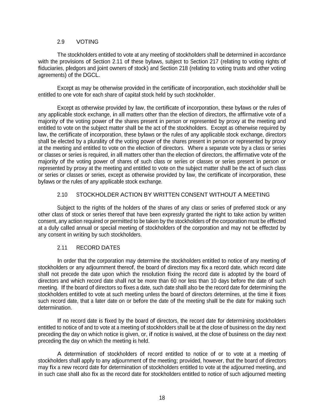18 2.9 VOTING The stockholders entitled to vote at any meeting of stockholders shall be determined in accordance with the provisions of Section 2.11 of these bylaws, subject to Section 217 (relating to voting rights of fiduciaries, pledgors and joint owners of stock) and Section 218 (relating to voting trusts and other voting agreements) of the DGCL. Except as may be otherwise provided in the certificate of incorporation, each stockholder shall be entitled to one vote for each share of capital stock held by such stockholder. Except as otherwise provided by law, the certificate of incorporation, these bylaws or the rules of any applicable stock exchange, in all matters other than the election of directors, the affirmative vote of a majority of the voting power of the shares present in person or represented by proxy at the meeting and entitled to vote on the subject matter shall be the act of the stockholders. Except as otherwise required by law, the certificate of incorporation, these bylaws or the rules of any applicable stock exchange, directors shall be elected by a plurality of the voting power of the shares present in person or represented by proxy at the meeting and entitled to vote on the election of directors. Where a separate vote by a class or series or classes or series is required, in all matters other than the election of directors, the affirmative vote of the majority of the voting power of shares of such class or series or classes or series present in person or represented by proxy at the meeting and entitled to vote on the subject matter shall be the act of such class or series or classes or series, except as otherwise provided by law, the certificate of incorporation, these bylaws or the rules of any applicable stock exchange. 2.10 STOCKHOLDER ACTION BY WRITTEN CONSENT WITHOUT A MEETING Subject to the rights of the holders of the shares of any class or series of preferred stock or any other class of stock or series thereof that have been expressly granted the right to take action by written consent, any action required or permitted to be taken by the stockholders of the corporation must be effected at a duly called annual or special meeting of stockholders of the corporation and may not be effected by any consent in writing by such stockholders. 2.11 RECORD DATES In order that the corporation may determine the stockholders entitled to notice of any meeting of stockholders or any adjournment thereof, the board of directors may fix a record date, which record date shall not precede the date upon which the resolution fixing the record date is adopted by the board of directors and which record date shall not be more than 60 nor less than 10 days before the date of such meeting. If the board of directors so fixes a date, such date shall also be the record date for determining the stockholders entitled to vote at such meeting unless the board of directors determines, at the time it fixes such record date, that a later date on or before the date of the meeting shall be the date for making such determination. If no record date is fixed by the board of directors, the record date for determining stockholders entitled to notice of and to vote at a meeting of stockholders shall be at the close of business on the day next preceding the day on which notice is given, or, if notice is waived, at the close of business on the day next preceding the day on which the meeting is held. A determination of stockholders of record entitled to notice of or to vote at a meeting of stockholders shall apply to any adjournment of the meeting; provided, however, that the board of directors may fix a new record date for determination of stockholders entitled to vote at the adjourned meeting, and in such case shall also fix as the record date for stockholders entitled to notice of such adjourned meeting