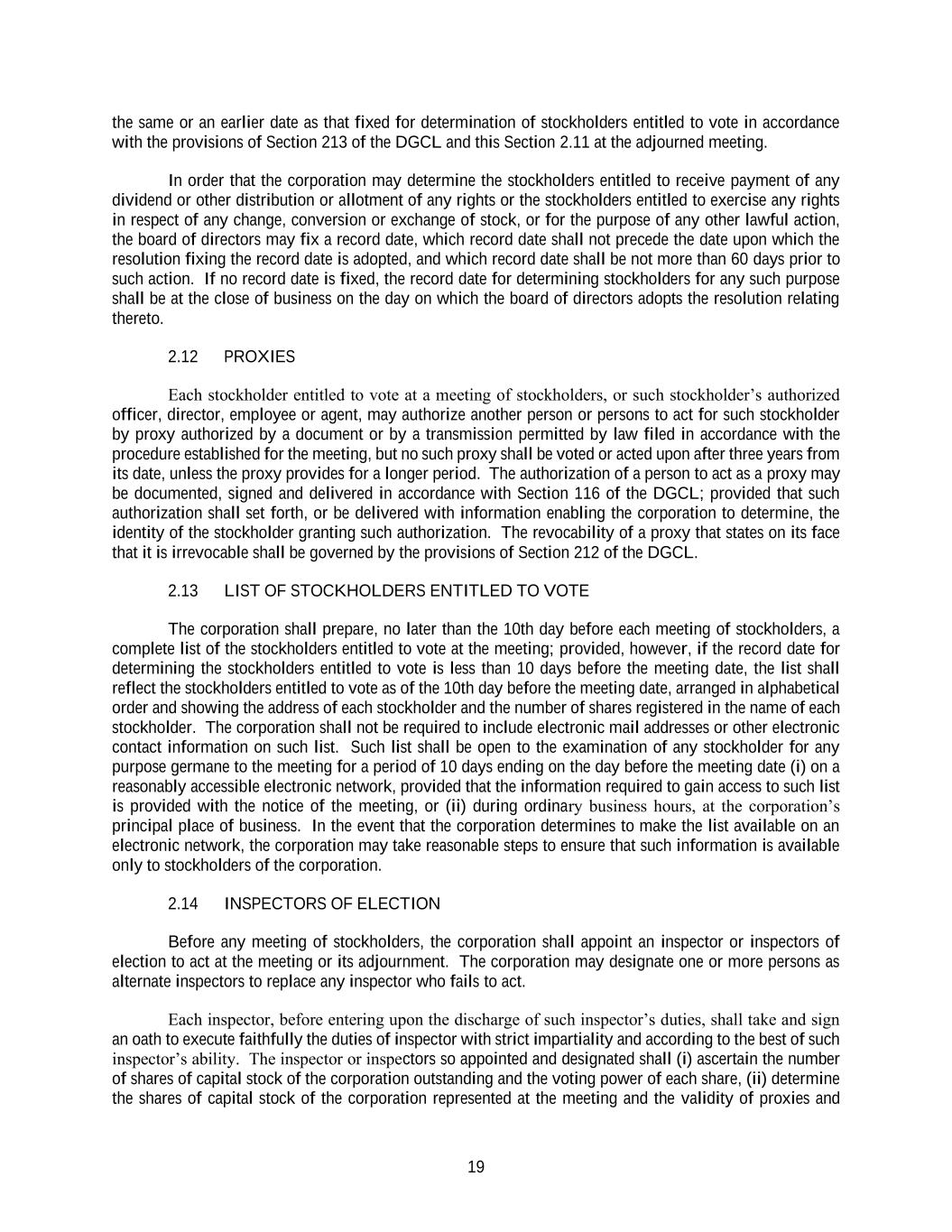 19 the same or an earlier date as that fixed for determination of stockholders entitled to vote in accordance with the provisions of Section 213 of the DGCL and this Section 2.11 at the adjourned meeting. In order that the corporation may determine the stockholders entitled to receive payment of any dividend or other distribution or allotment of any rights or the stockholders entitled to exercise any rights in respect of any change, conversion or exchange of stock, or for the purpose of any other lawful action, the board of directors may fix a record date, which record date shall not precede the date upon which the resolution fixing the record date is adopted, and which record date shall be not more than 60 days prior to such action. If no record date is fixed, the record date for determining stockholders for any such purpose shall be at the close of business on the day on which the board of directors adopts the resolution relating thereto. 2.12 PROXIES Each stockholder entitled to vote at a meeting of stockholders, or such stockholder’s authorized officer, director, employee or agent, may authorize another person or persons to act for such stockholder by proxy authorized by a document or by a transmission permitted by law filed in accordance with the procedure established for the meeting, but no such proxy shall be voted or acted upon after three years from its date, unless the proxy provides for a longer period. The authorization of a person to act as a proxy may be documented, signed and delivered in accordance with Section 116 of the DGCL; provided that such authorization shall set forth, or be delivered with information enabling the corporation to determine, the identity of the stockholder granting such authorization. The revocability of a proxy that states on its face that it is irrevocable shall be governed by the provisions of Section 212 of the DGCL. 2.13 LIST OF STOCKHOLDERS ENTITLED TO VOTE The corporation shall prepare, no later than the 10th day before each meeting of stockholders, a complete list of the stockholders entitled to vote at the meeting; provided, however, if the record date for determining the stockholders entitled to vote is less than 10 days before the meeting date, the list shall reflect the stockholders entitled to vote as of the 10th day before the meeting date, arranged in alphabetical order and showing the address of each stockholder and the number of shares registered in the name of each stockholder. The corporation shall not be required to include electronic mail addresses or other electronic contact information on such list. Such list shall be open to the examination of any stockholder for any purpose germane to the meeting for a period of 10 days ending on the day before the meeting date (i) on a reasonably accessible electronic network, provided that the information required to gain access to such list is provided with the notice of the meeting, or (ii) during ordinary business hours, at the corporation’s principal place of business. In the event that the corporation determines to make the list available on an electronic network, the corporation may take reasonable steps to ensure that such information is available only to stockholders of the corporation. 2.14 INSPECTORS OF ELECTION Before any meeting of stockholders, the corporation shall appoint an inspector or inspectors of election to act at the meeting or its adjournment. The corporation may designate one or more persons as alternate inspectors to replace any inspector who fails to act. Each inspector, before entering upon the discharge of such inspector’s duties, shall take and sign an oath to execute faithfully the duties of inspector with strict impartiality and according to the best of such inspector’s ability. The inspector or inspectors so appointed and designated shall (i) ascertain the number of shares of capital stock of the corporation outstanding and the voting power of each share, (ii) determine the shares of capital stock of the corporation represented at the meeting and the validity of proxies and