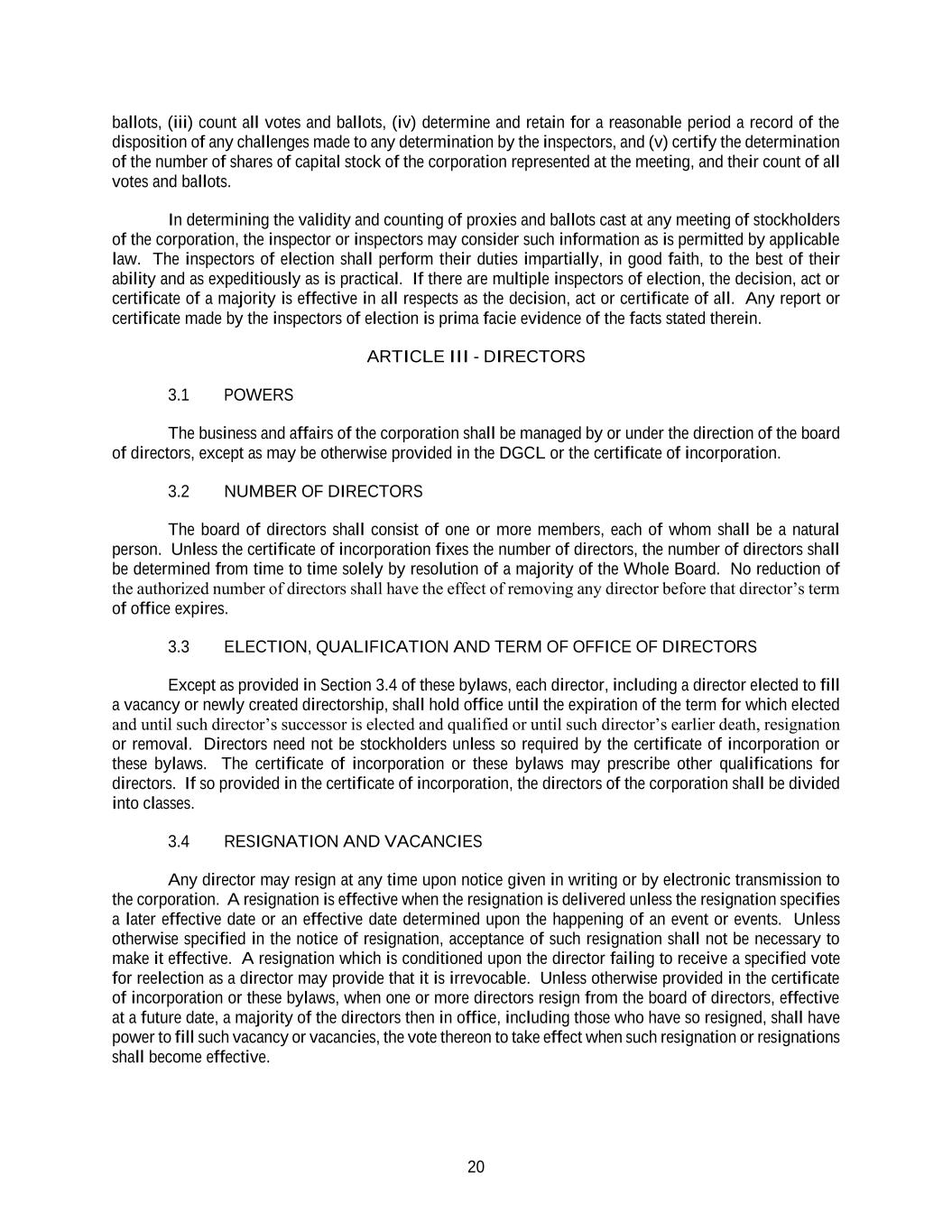 20 ballots, (iii) count all votes and ballots, (iv) determine and retain for a reasonable period a record of the disposition of any challenges made to any determination by the inspectors, and (v) certify the determination of the number of shares of capital stock of the corporation represented at the meeting, and their count of all votes and ballots. In determining the validity and counting of proxies and ballots cast at any meeting of stockholders of the corporation, the inspector or inspectors may consider such information as is permitted by applicable law. The inspectors of election shall perform their duties impartially, in good faith, to the best of their ability and as expeditiously as is practical. If there are multiple inspectors of election, the decision, act or certificate of a majority is effective in all respects as the decision, act or certificate of all. Any report or certificate made by the inspectors of election is prima facie evidence of the facts stated therein. ARTICLE III - DIRECTORS 3.1 POWERS The business and affairs of the corporation shall be managed by or under the direction of the board of directors, except as may be otherwise provided in the DGCL or the certificate of incorporation. 3.2 NUMBER OF DIRECTORS The board of directors shall consist of one or more members, each of whom shall be a natural person. Unless the certificate of incorporation fixes the number of directors, the number of directors shall be determined from time to time solely by resolution of a majority of the Whole Board. No reduction of the authorized number of directors shall have the effect of removing any director before that director’s term of office expires. 3.3 ELECTION, QUALIFICATION AND TERM OF OFFICE OF DIRECTORS Except as provided in Section 3.4 of these bylaws, each director, including a director elected to fill a vacancy or newly created directorship, shall hold office until the expiration of the term for which elected and until such director’s successor is elected and qualified or until such director’s earlier death, resignation or removal. Directors need not be stockholders unless so required by the certificate of incorporation or these bylaws. The certificate of incorporation or these bylaws may prescribe other qualifications for directors. If so provided in the certificate of incorporation, the directors of the corporation shall be divided into classes. 3.4 RESIGNATION AND VACANCIES Any director may resign at any time upon notice given in writing or by electronic transmission to the corporation. A resignation is effective when the resignation is delivered unless the resignation specifies a later effective date or an effective date determined upon the happening of an event or events. Unless otherwise specified in the notice of resignation, acceptance of such resignation shall not be necessary to make it effective. A resignation which is conditioned upon the director failing to receive a specified vote for reelection as a director may provide that it is irrevocable. Unless otherwise provided in the certificate of incorporation or these bylaws, when one or more directors resign from the board of directors, effective at a future date, a majority of the directors then in office, including those who have so resigned, shall have power to fill such vacancy or vacancies, the vote thereon to take effect when such resignation or resignations shall become effective.