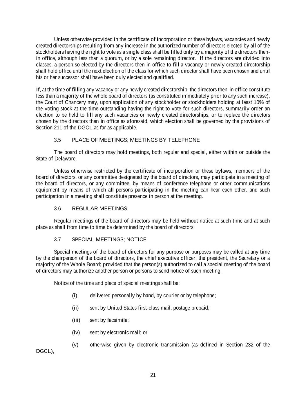 21 Unless otherwise provided in the certificate of incorporation or these bylaws, vacancies and newly created directorships resulting from any increase in the authorized number of directors elected by all of the stockholders having the right to vote as a single class shall be filled only by a majority of the directors then- in office, although less than a quorum, or by a sole remaining director. If the directors are divided into classes, a person so elected by the directors then in office to fill a vacancy or newly created directorship shall hold office until the next election of the class for which such director shall have been chosen and until his or her successor shall have been duly elected and qualified. If, at the time of filling any vacancy or any newly created directorship, the directors then-in office constitute less than a majority of the whole board of directors (as constituted immediately prior to any such increase), the Court of Chancery may, upon application of any stockholder or stockholders holding at least 10% of the voting stock at the time outstanding having the right to vote for such directors, summarily order an election to be held to fill any such vacancies or newly created directorships, or to replace the directors chosen by the directors then in office as aforesaid, which election shall be governed by the provisions of Section 211 of the DGCL as far as applicable. 3.5 PLACE OF MEETINGS; MEETINGS BY TELEPHONE The board of directors may hold meetings, both regular and special, either within or outside the State of Delaware. Unless otherwise restricted by the certificate of incorporation or these bylaws, members of the board of directors, or any committee designated by the board of directors, may participate in a meeting of the board of directors, or any committee, by means of conference telephone or other communications equipment by means of which all persons participating in the meeting can hear each other, and such participation in a meeting shall constitute presence in person at the meeting. 3.6 REGULAR MEETINGS Regular meetings of the board of directors may be held without notice at such time and at such place as shall from time to time be determined by the board of directors. 3.7 SPECIAL MEETINGS; NOTICE Special meetings of the board of directors for any purpose or purposes may be called at any time by the chairperson of the board of directors, the chief executive officer, the president, the Secretary or a majority of the Whole Board; provided that the person(s) authorized to call a special meeting of the board of directors may authorize another person or persons to send notice of such meeting. Notice of the time and place of special meetings shall be: (i) delivered personally by hand, by courier or by telephone; (ii) sent by United States first-class mail, postage prepaid; (iii) sent by facsimile; (iv) sent by electronic mail; or (v) otherwise given by electronic transmission (as defined in Section 232 of the DGCL),