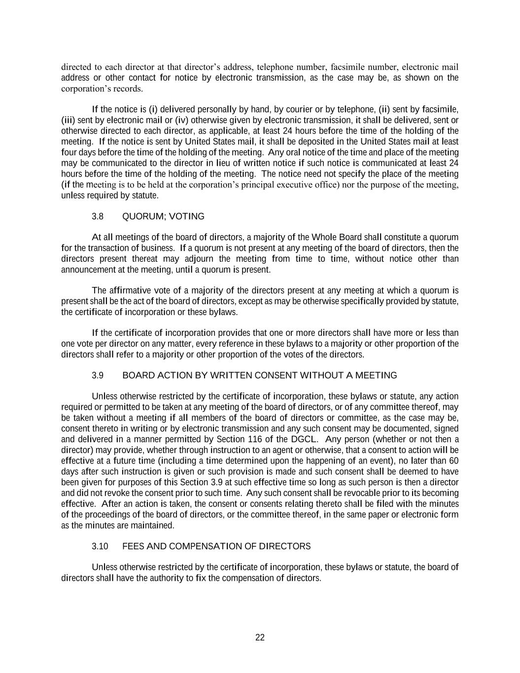 22 directed to each director at that director’s address, telephone number, facsimile number, electronic mail address or other contact for notice by electronic transmission, as the case may be, as shown on the corporation’s records. If the notice is (i) delivered personally by hand, by courier or by telephone, (ii) sent by facsimile, (iii) sent by electronic mail or (iv) otherwise given by electronic transmission, it shall be delivered, sent or otherwise directed to each director, as applicable, at least 24 hours before the time of the holding of the meeting. If the notice is sent by United States mail, it shall be deposited in the United States mail at least four days before the time of the holding of the meeting. Any oral notice of the time and place of the meeting may be communicated to the director in lieu of written notice if such notice is communicated at least 24 hours before the time of the holding of the meeting. The notice need not specify the place of the meeting (if the meeting is to be held at the corporation’s principal executive office) nor the purpose of the meeting, unless required by statute. 3.8 QUORUM; VOTING At all meetings of the board of directors, a majority of the Whole Board shall constitute a quorum for the transaction of business. If a quorum is not present at any meeting of the board of directors, then the directors present thereat may adjourn the meeting from time to time, without notice other than announcement at the meeting, until a quorum is present. The affirmative vote of a majority of the directors present at any meeting at which a quorum is present shall be the act of the board of directors, except as may be otherwise specifically provided by statute, the certificate of incorporation or these bylaws. If the certificate of incorporation provides that one or more directors shall have more or less than one vote per director on any matter, every reference in these bylaws to a majority or other proportion of the directors shall refer to a majority or other proportion of the votes of the directors. 3.9 BOARD ACTION BY WRITTEN CONSENT WITHOUT A MEETING Unless otherwise restricted by the certificate of incorporation, these bylaws or statute, any action required or permitted to be taken at any meeting of the board of directors, or of any committee thereof, may be taken without a meeting if all members of the board of directors or committee, as the case may be, consent thereto in writing or by electronic transmission and any such consent may be documented, signed and delivered in a manner permitted by Section 116 of the DGCL. Any person (whether or not then a director) may provide, whether through instruction to an agent or otherwise, that a consent to action will be effective at a future time (including a time determined upon the happening of an event), no later than 60 days after such instruction is given or such provision is made and such consent shall be deemed to have been given for purposes of this Section 3.9 at such effective time so long as such person is then a director and did not revoke the consent prior to such time. Any such consent shall be revocable prior to its becoming effective. After an action is taken, the consent or consents relating thereto shall be filed with the minutes of the proceedings of the board of directors, or the committee thereof, in the same paper or electronic form as the minutes are maintained. 3.10 FEES AND COMPENSATION OF DIRECTORS Unless otherwise restricted by the certificate of incorporation, these bylaws or statute, the board of directors shall have the authority to fix the compensation of directors.