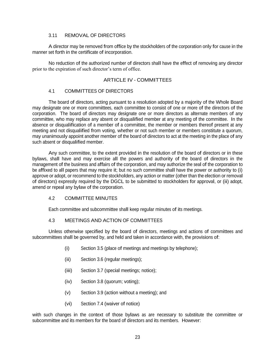 23 3.11 REMOVAL OF DIRECTORS A director may be removed from office by the stockholders of the corporation only for cause in the manner set forth in the certificate of incorporation. No reduction of the authorized number of directors shall have the effect of removing any director prior to the expiration of such director’s term of office. ARTICLE IV - COMMITTEES 4.1 COMMITTEES OF DIRECTORS The board of directors, acting pursuant to a resolution adopted by a majority of the Whole Board may designate one or more committees, each committee to consist of one or more of the directors of the corporation. The board of directors may designate one or more directors as alternate members of any committee, who may replace any absent or disqualified member at any meeting of the committee. In the absence or disqualification of a member of a committee, the member or members thereof present at any meeting and not disqualified from voting, whether or not such member or members constitute a quorum, may unanimously appoint another member of the board of directors to act at the meeting in the place of any such absent or disqualified member. Any such committee, to the extent provided in the resolution of the board of directors or in these bylaws, shall have and may exercise all the powers and authority of the board of directors in the management of the business and affairs of the corporation, and may authorize the seal of the corporation to be affixed to all papers that may require it; but no such committee shall have the power or authority to (i) approve or adopt, or recommend to the stockholders, any action or matter (other than the election or removal of directors) expressly required by the DGCL to be submitted to stockholders for approval, or (ii) adopt, amend or repeal any bylaw of the corporation. 4.2 COMMITTEE MINUTES Each committee and subcommittee shall keep regular minutes of its meetings. 4.3 MEETINGS AND ACTION OF COMMITTEES Unless otherwise specified by the board of directors, meetings and actions of committees and subcommittees shall be governed by, and held and taken in accordance with, the provisions of: (i) Section 3.5 (place of meetings and meetings by telephone); (ii) Section 3.6 (regular meetings); (iii) Section 3.7 (special meetings; notice); (iv) Section 3.8 (quorum; voting); (v) Section 3.9 (action without a meeting); and (vi) Section 7.4 (waiver of notice) with such changes in the context of those bylaws as are necessary to substitute the committee or subcommittee and its members for the board of directors and its members. However: