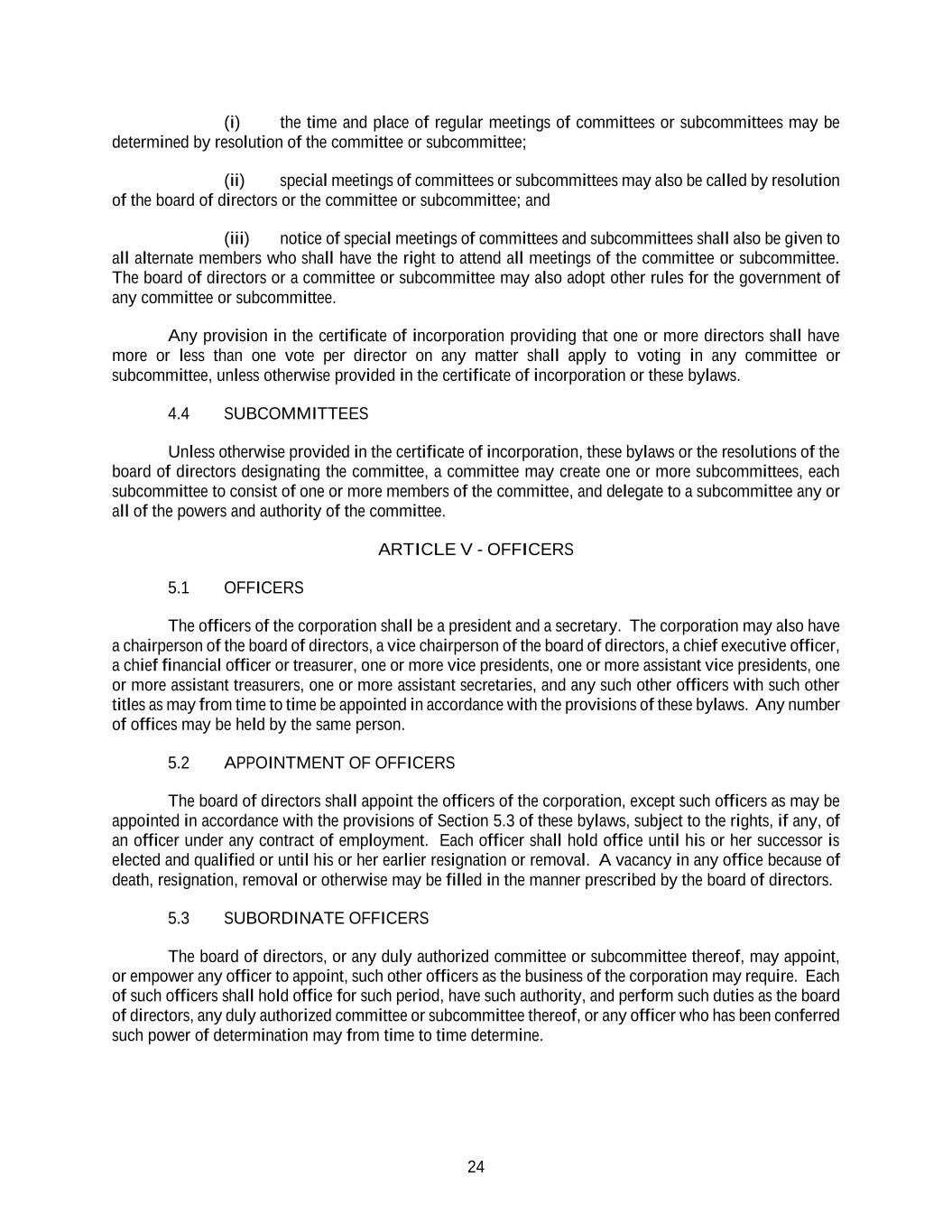 24 (i) the time and place of regular meetings of committees or subcommittees may be determined by resolution of the committee or subcommittee; (ii) special meetings of committees or subcommittees may also be called by resolution of the board of directors or the committee or subcommittee; and (iii) notice of special meetings of committees and subcommittees shall also be given to all alternate members who shall have the right to attend all meetings of the committee or subcommittee. The board of directors or a committee or subcommittee may also adopt other rules for the government of any committee or subcommittee. Any provision in the certificate of incorporation providing that one or more directors shall have more or less than one vote per director on any matter shall apply to voting in any committee or subcommittee, unless otherwise provided in the certificate of incorporation or these bylaws. 4.4 SUBCOMMITTEES Unless otherwise provided in the certificate of incorporation, these bylaws or the resolutions of the board of directors designating the committee, a committee may create one or more subcommittees, each subcommittee to consist of one or more members of the committee, and delegate to a subcommittee any or all of the powers and authority of the committee. ARTICLE V - OFFICERS 5.1 OFFICERS The officers of the corporation shall be a president and a secretary. The corporation may also have a chairperson of the board of directors, a vice chairperson of the board of directors, a chief executive officer, a chief financial officer or treasurer, one or more vice presidents, one or more assistant vice presidents, one or more assistant treasurers, one or more assistant secretaries, and any such other officers with such other titles as may from time to time be appointed in accordance with the provisions of these bylaws. Any number of offices may be held by the same person. 5.2 APPOINTMENT OF OFFICERS The board of directors shall appoint the officers of the corporation, except such officers as may be appointed in accordance with the provisions of Section 5.3 of these bylaws, subject to the rights, if any, of an officer under any contract of employment. Each officer shall hold office until his or her successor is elected and qualified or until his or her earlier resignation or removal. A vacancy in any office because of death, resignation, removal or otherwise may be filled in the manner prescribed by the board of directors. 5.3 SUBORDINATE OFFICERS The board of directors, or any duly authorized committee or subcommittee thereof, may appoint, or empower any officer to appoint, such other officers as the business of the corporation may require. Each of such officers shall hold office for such period, have such authority, and perform such duties as the board of directors, any duly authorized committee or subcommittee thereof, or any officer who has been conferred such power of determination may from time to time determine.