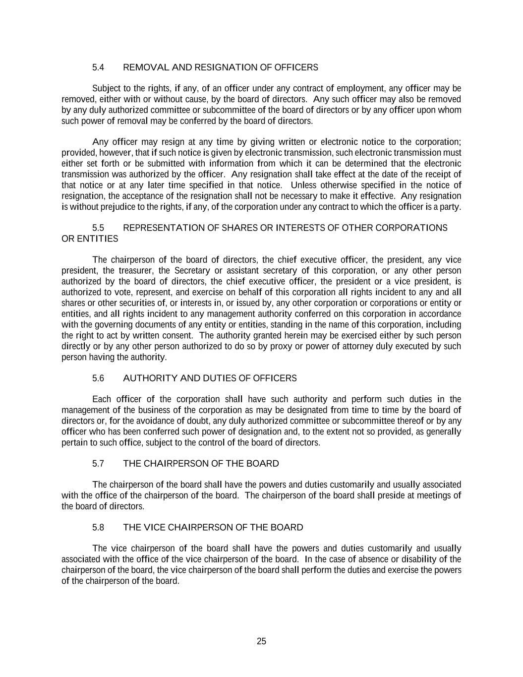 25 5.4 REMOVAL AND RESIGNATION OF OFFICERS Subject to the rights, if any, of an officer under any contract of employment, any officer may be removed, either with or without cause, by the board of directors. Any such officer may also be removed by any duly authorized committee or subcommittee of the board of directors or by any officer upon whom such power of removal may be conferred by the board of directors. Any officer may resign at any time by giving written or electronic notice to the corporation; provided, however, that if such notice is given by electronic transmission, such electronic transmission must either set forth or be submitted with information from which it can be determined that the electronic transmission was authorized by the officer. Any resignation shall take effect at the date of the receipt of that notice or at any later time specified in that notice. Unless otherwise specified in the notice of resignation, the acceptance of the resignation shall not be necessary to make it effective. Any resignation is without prejudice to the rights, if any, of the corporation under any contract to which the officer is a party. 5.5 REPRESENTATION OF SHARES OR INTERESTS OF OTHER CORPORATIONS OR ENTITIES The chairperson of the board of directors, the chief executive officer, the president, any vice president, the treasurer, the Secretary or assistant secretary of this corporation, or any other person authorized by the board of directors, the chief executive officer, the president or a vice president, is authorized to vote, represent, and exercise on behalf of this corporation all rights incident to any and all shares or other securities of, or interests in, or issued by, any other corporation or corporations or entity or entities, and all rights incident to any management authority conferred on this corporation in accordance with the governing documents of any entity or entities, standing in the name of this corporation, including the right to act by written consent. The authority granted herein may be exercised either by such person directly or by any other person authorized to do so by proxy or power of attorney duly executed by such person having the authority. 5.6 AUTHORITY AND DUTIES OF OFFICERS Each officer of the corporation shall have such authority and perform such duties in the management of the business of the corporation as may be designated from time to time by the board of directors or, for the avoidance of doubt, any duly authorized committee or subcommittee thereof or by any officer who has been conferred such power of designation and, to the extent not so provided, as generally pertain to such office, subject to the control of the board of directors. 5.7 THE CHAIRPERSON OF THE BOARD The chairperson of the board shall have the powers and duties customarily and usually associated with the office of the chairperson of the board. The chairperson of the board shall preside at meetings of the board of directors. 5.8 THE VICE CHAIRPERSON OF THE BOARD The vice chairperson of the board shall have the powers and duties customarily and usually associated with the office of the vice chairperson of the board. In the case of absence or disability of the chairperson of the board, the vice chairperson of the board shall perform the duties and exercise the powers of the chairperson of the board.