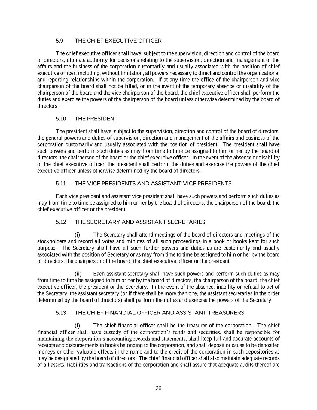 26 5.9 THE CHIEF EXECUTIVE OFFICER The chief executive officer shall have, subject to the supervision, direction and control of the board of directors, ultimate authority for decisions relating to the supervision, direction and management of the affairs and the business of the corporation customarily and usually associated with the position of chief executive officer, including, without limitation, all powers necessary to direct and control the organizational and reporting relationships within the corporation. If at any time the office of the chairperson and vice chairperson of the board shall not be filled, or in the event of the temporary absence or disability of the chairperson of the board and the vice chairperson of the board, the chief executive officer shall perform the duties and exercise the powers of the chairperson of the board unless otherwise determined by the board of directors. 5.10 THE PRESIDENT The president shall have, subject to the supervision, direction and control of the board of directors, the general powers and duties of supervision, direction and management of the affairs and business of the corporation customarily and usually associated with the position of president. The president shall have such powers and perform such duties as may from time to time be assigned to him or her by the board of directors, the chairperson of the board or the chief executive officer. In the event of the absence or disability of the chief executive officer, the president shall perform the duties and exercise the powers of the chief executive officer unless otherwise determined by the board of directors. 5.11 THE VICE PRESIDENTS AND ASSISTANT VICE PRESIDENTS Each vice president and assistant vice president shall have such powers and perform such duties as may from time to time be assigned to him or her by the board of directors, the chairperson of the board, the chief executive officer or the president. 5.12 THE SECRETARY AND ASSISTANT SECRETARIES (i) The Secretary shall attend meetings of the board of directors and meetings of the stockholders and record all votes and minutes of all such proceedings in a book or books kept for such purpose. The Secretary shall have all such further powers and duties as are customarily and usually associated with the position of Secretary or as may from time to time be assigned to him or her by the board of directors, the chairperson of the board, the chief executive officer or the president. (ii) Each assistant secretary shall have such powers and perform such duties as may from time to time be assigned to him or her by the board of directors, the chairperson of the board, the chief executive officer, the president or the Secretary. In the event of the absence, inability or refusal to act of the Secretary, the assistant secretary (or if there shall be more than one, the assistant secretaries in the order determined by the board of directors) shall perform the duties and exercise the powers of the Secretary. 5.13 THE CHIEF FINANCIAL OFFICER AND ASSISTANT TREASURERS (i) The chief financial officer shall be the treasurer of the corporation. The chief financial officer shall have custody of the corporation’s funds and securities, shall be responsible for maintaining the corporation’s accounting records and statements, shall keep full and accurate accounts of receipts and disbursements in books belonging to the corporation, and shall deposit or cause to be deposited moneys or other valuable effects in the name and to the credit of the corporation in such depositories as may be designated by the board of directors. The chief financial officer shall also maintain adequate records of all assets, liabilities and transactions of the corporation and shall assure that adequate audits thereof are