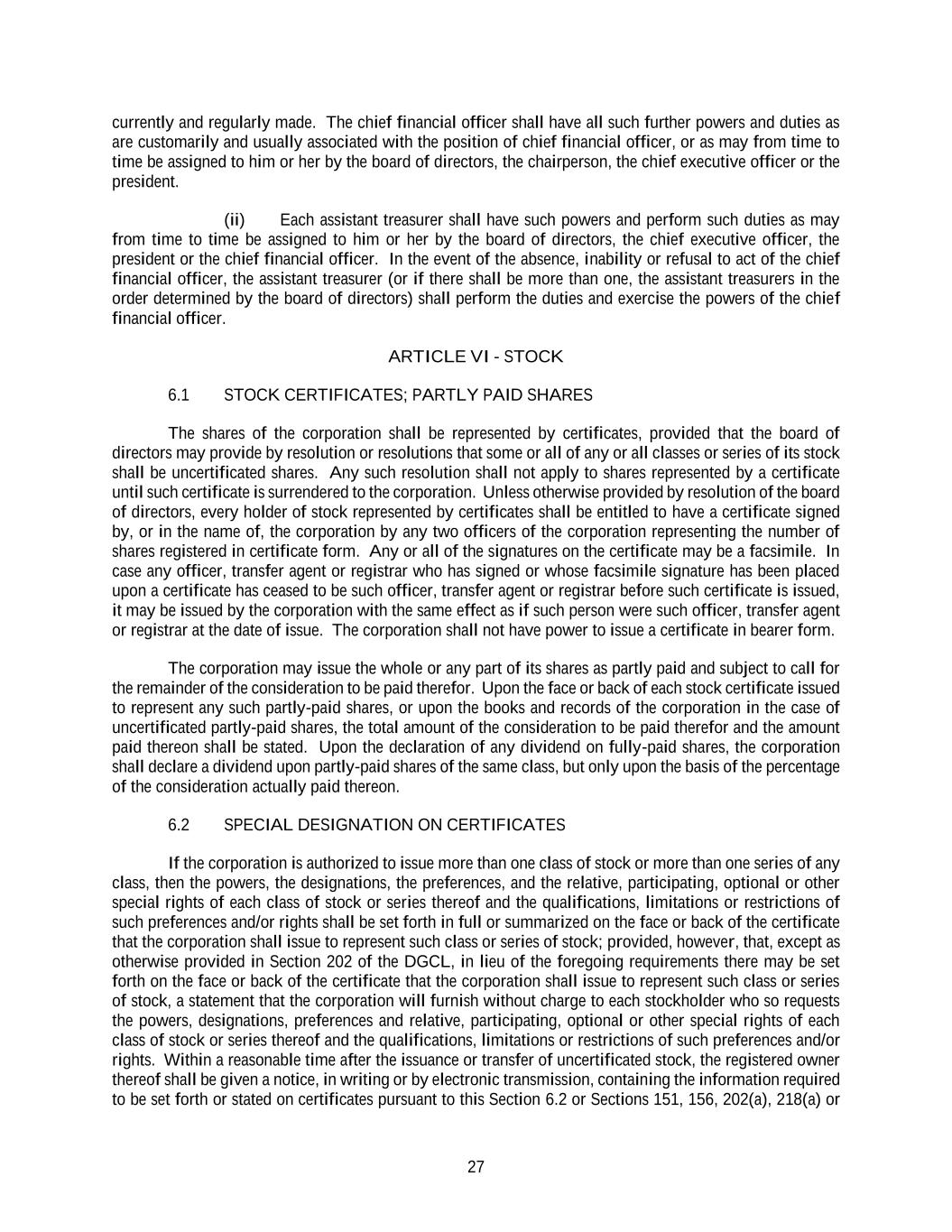 27 currently and regularly made. The chief financial officer shall have all such further powers and duties as are customarily and usually associated with the position of chief financial officer, or as may from time to time be assigned to him or her by the board of directors, the chairperson, the chief executive officer or the president. (ii) Each assistant treasurer shall have such powers and perform such duties as may from time to time be assigned to him or her by the board of directors, the chief executive officer, the president or the chief financial officer. In the event of the absence, inability or refusal to act of the chief financial officer, the assistant treasurer (or if there shall be more than one, the assistant treasurers in the order determined by the board of directors) shall perform the duties and exercise the powers of the chief financial officer. ARTICLE VI - STOCK 6.1 STOCK CERTIFICATES; PARTLY PAID SHARES The shares of the corporation shall be represented by certificates, provided that the board of directors may provide by resolution or resolutions that some or all of any or all classes or series of its stock shall be uncertificated shares. Any such resolution shall not apply to shares represented by a certificate until such certificate is surrendered to the corporation. Unless otherwise provided by resolution of the board of directors, every holder of stock represented by certificates shall be entitled to have a certificate signed by, or in the name of, the corporation by any two officers of the corporation representing the number of shares registered in certificate form. Any or all of the signatures on the certificate may be a facsimile. In case any officer, transfer agent or registrar who has signed or whose facsimile signature has been placed upon a certificate has ceased to be such officer, transfer agent or registrar before such certificate is issued, it may be issued by the corporation with the same effect as if such person were such officer, transfer agent or registrar at the date of issue. The corporation shall not have power to issue a certificate in bearer form. The corporation may issue the whole or any part of its shares as partly paid and subject to call for the remainder of the consideration to be paid therefor. Upon the face or back of each stock certificate issued to represent any such partly-paid shares, or upon the books and records of the corporation in the case of uncertificated partly-paid shares, the total amount of the consideration to be paid therefor and the amount paid thereon shall be stated. Upon the declaration of any dividend on fully-paid shares, the corporation shall declare a dividend upon partly-paid shares of the same class, but only upon the basis of the percentage of the consideration actually paid thereon. 6.2 SPECIAL DESIGNATION ON CERTIFICATES If the corporation is authorized to issue more than one class of stock or more than one series of any class, then the powers, the designations, the preferences, and the relative, participating, optional or other special rights of each class of stock or series thereof and the qualifications, limitations or restrictions of such preferences and/or rights shall be set forth in full or summarized on the face or back of the certificate that the corporation shall issue to represent such class or series of stock; provided, however, that, except as otherwise provided in Section 202 of the DGCL, in lieu of the foregoing requirements there may be set forth on the face or back of the certificate that the corporation shall issue to represent such class or series of stock, a statement that the corporation will furnish without charge to each stockholder who so requests the powers, designations, preferences and relative, participating, optional or other special rights of each class of stock or series thereof and the qualifications, limitations or restrictions of such preferences and/or rights. Within a reasonable time after the issuance or transfer of uncertificated stock, the registered owner thereof shall be given a notice, in writing or by electronic transmission, containing the information required to be set forth or stated on certificates pursuant to this Section 6.2 or Sections 151, 156, 202(a), 218(a) or