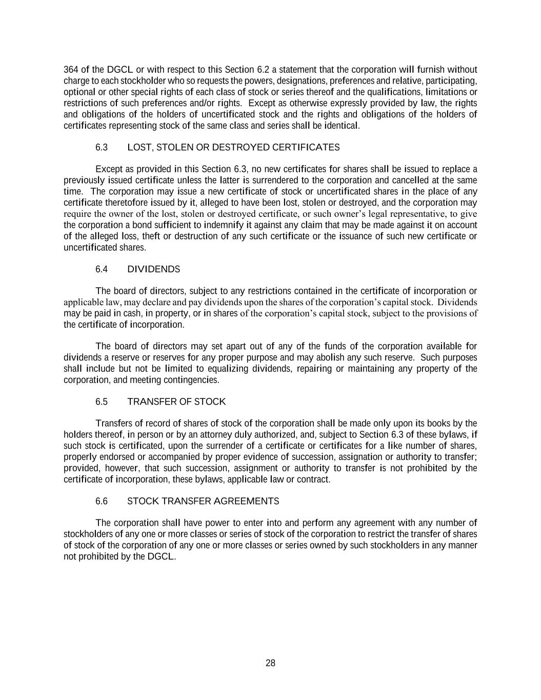 28 364 of the DGCL or with respect to this Section 6.2 a statement that the corporation will furnish without charge to each stockholder who so requests the powers, designations, preferences and relative, participating, optional or other special rights of each class of stock or series thereof and the qualifications, limitations or restrictions of such preferences and/or rights. Except as otherwise expressly provided by law, the rights and obligations of the holders of uncertificated stock and the rights and obligations of the holders of certificates representing stock of the same class and series shall be identical. 6.3 LOST, STOLEN OR DESTROYED CERTIFICATES Except as provided in this Section 6.3, no new certificates for shares shall be issued to replace a previously issued certificate unless the latter is surrendered to the corporation and cancelled at the same time. The corporation may issue a new certificate of stock or uncertificated shares in the place of any certificate theretofore issued by it, alleged to have been lost, stolen or destroyed, and the corporation may require the owner of the lost, stolen or destroyed certificate, or such owner’s legal representative, to give the corporation a bond sufficient to indemnify it against any claim that may be made against it on account of the alleged loss, theft or destruction of any such certificate or the issuance of such new certificate or uncertificated shares. 6.4 DIVIDENDS The board of directors, subject to any restrictions contained in the certificate of incorporation or applicable law, may declare and pay dividends upon the shares of the corporation’s capital stock. Dividends may be paid in cash, in property, or in shares of the corporation’s capital stock, subject to the provisions of the certificate of incorporation. The board of directors may set apart out of any of the funds of the corporation available for dividends a reserve or reserves for any proper purpose and may abolish any such reserve. Such purposes shall include but not be limited to equalizing dividends, repairing or maintaining any property of the corporation, and meeting contingencies. 6.5 TRANSFER OF STOCK Transfers of record of shares of stock of the corporation shall be made only upon its books by the holders thereof, in person or by an attorney duly authorized, and, subject to Section 6.3 of these bylaws, if such stock is certificated, upon the surrender of a certificate or certificates for a like number of shares, properly endorsed or accompanied by proper evidence of succession, assignation or authority to transfer; provided, however, that such succession, assignment or authority to transfer is not prohibited by the certificate of incorporation, these bylaws, applicable law or contract. 6.6 STOCK TRANSFER AGREEMENTS The corporation shall have power to enter into and perform any agreement with any number of stockholders of any one or more classes or series of stock of the corporation to restrict the transfer of shares of stock of the corporation of any one or more classes or series owned by such stockholders in any manner not prohibited by the DGCL.