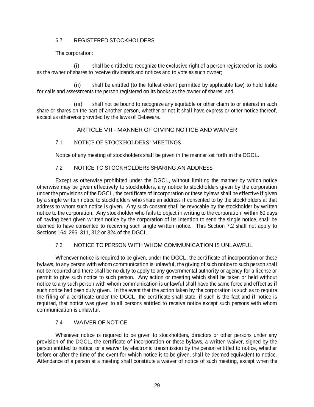 29 6.7 REGISTERED STOCKHOLDERS The corporation: (i) shall be entitled to recognize the exclusive right of a person registered on its books as the owner of shares to receive dividends and notices and to vote as such owner; (ii) shall be entitled (to the fullest extent permitted by applicable law) to hold liable for calls and assessments the person registered on its books as the owner of shares; and (iii) shall not be bound to recognize any equitable or other claim to or interest in such share or shares on the part of another person, whether or not it shall have express or other notice thereof, except as otherwise provided by the laws of Delaware. ARTICLE VII - MANNER OF GIVING NOTICE AND WAIVER 7.1 NOTICE OF STOCKHOLDERS’ MEETINGS Notice of any meeting of stockholders shall be given in the manner set forth in the DGCL. 7.2 NOTICE TO STOCKHOLDERS SHARING AN ADDRESS Except as otherwise prohibited under the DGCL, without limiting the manner by which notice otherwise may be given effectively to stockholders, any notice to stockholders given by the corporation under the provisions of the DGCL, the certificate of incorporation or these bylaws shall be effective if given by a single written notice to stockholders who share an address if consented to by the stockholders at that address to whom such notice is given. Any such consent shall be revocable by the stockholder by written notice to the corporation. Any stockholder who fails to object in writing to the corporation, within 60 days of having been given written notice by the corporation of its intention to send the single notice, shall be deemed to have consented to receiving such single written notice. This Section 7.2 shall not apply to Sections 164, 296, 311, 312 or 324 of the DGCL. 7.3 NOTICE TO PERSON WITH WHOM COMMUNICATION IS UNLAWFUL Whenever notice is required to be given, under the DGCL, the certificate of incorporation or these bylaws, to any person with whom communication is unlawful, the giving of such notice to such person shall not be required and there shall be no duty to apply to any governmental authority or agency for a license or permit to give such notice to such person. Any action or meeting which shall be taken or held without notice to any such person with whom communication is unlawful shall have the same force and effect as if such notice had been duly given. In the event that the action taken by the corporation is such as to require the filing of a certificate under the DGCL, the certificate shall state, if such is the fact and if notice is required, that notice was given to all persons entitled to receive notice except such persons with whom communication is unlawful. 7.4 WAIVER OF NOTICE Whenever notice is required to be given to stockholders, directors or other persons under any provision of the DGCL, the certificate of incorporation or these bylaws, a written waiver, signed by the person entitled to notice, or a waiver by electronic transmission by the person entitled to notice, whether before or after the time of the event for which notice is to be given, shall be deemed equivalent to notice. Attendance of a person at a meeting shall constitute a waiver of notice of such meeting, except when the