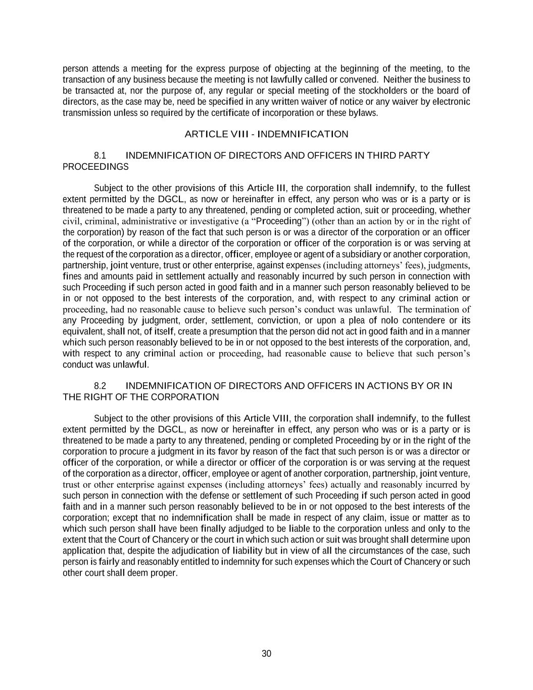 30 person attends a meeting for the express purpose of objecting at the beginning of the meeting, to the transaction of any business because the meeting is not lawfully called or convened. Neither the business to be transacted at, nor the purpose of, any regular or special meeting of the stockholders or the board of directors, as the case may be, need be specified in any written waiver of notice or any waiver by electronic transmission unless so required by the certificate of incorporation or these bylaws. ARTICLE VIII - INDEMNIFICATION 8.1 INDEMNIFICATION OF DIRECTORS AND OFFICERS IN THIRD PARTY PROCEEDINGS Subject to the other provisions of this Article III, the corporation shall indemnify, to the fullest extent permitted by the DGCL, as now or hereinafter in effect, any person who was or is a party or is threatened to be made a party to any threatened, pending or completed action, suit or proceeding, whether civil, criminal, administrative or investigative (a “Proceeding”) (other than an action by or in the right of the corporation) by reason of the fact that such person is or was a director of the corporation or an officer of the corporation, or while a director of the corporation or officer of the corporation is or was serving at the request of the corporation as a director, officer, employee or agent of a subsidiary or another corporation, partnership, joint venture, trust or other enterprise, against expenses (including attorneys’ fees), judgments, fines and amounts paid in settlement actually and reasonably incurred by such person in connection with such Proceeding if such person acted in good faith and in a manner such person reasonably believed to be in or not opposed to the best interests of the corporation, and, with respect to any criminal action or proceeding, had no reasonable cause to believe such person’s conduct was unlawful. The termination of any Proceeding by judgment, order, settlement, conviction, or upon a plea of nolo contendere or its equivalent, shall not, of itself, create a presumption that the person did not act in good faith and in a manner which such person reasonably believed to be in or not opposed to the best interests of the corporation, and, with respect to any criminal action or proceeding, had reasonable cause to believe that such person’s conduct was unlawful. 8.2 INDEMNIFICATION OF DIRECTORS AND OFFICERS IN ACTIONS BY OR IN THE RIGHT OF THE CORPORATION Subject to the other provisions of this Article VIII, the corporation shall indemnify, to the fullest extent permitted by the DGCL, as now or hereinafter in effect, any person who was or is a party or is threatened to be made a party to any threatened, pending or completed Proceeding by or in the right of the corporation to procure a judgment in its favor by reason of the fact that such person is or was a director or officer of the corporation, or while a director or officer of the corporation is or was serving at the request of the corporation as a director, officer, employee or agent of another corporation, partnership, joint venture, trust or other enterprise against expenses (including attorneys’ fees) actually and reasonably incurred by such person in connection with the defense or settlement of such Proceeding if such person acted in good faith and in a manner such person reasonably believed to be in or not opposed to the best interests of the corporation; except that no indemnification shall be made in respect of any claim, issue or matter as to which such person shall have been finally adjudged to be liable to the corporation unless and only to the extent that the Court of Chancery or the court in which such action or suit was brought shall determine upon application that, despite the adjudication of liability but in view of all the circumstances of the case, such person is fairly and reasonably entitled to indemnity for such expenses which the Court of Chancery or such other court shall deem proper.