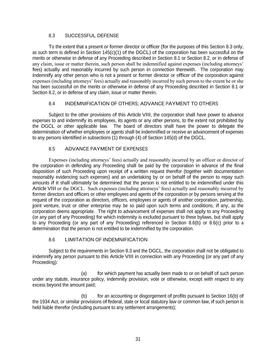 31 8.3 SUCCESSFUL DEFENSE To the extent that a present or former director or officer (for the purposes of this Section 8.3 only, as such term is defined in Section 145(c)(1) of the DGCL) of the corporation has been successful on the merits or otherwise in defense of any Proceeding described in Section 8.1 or Section 8.2, or in defense of any claim, issue or matter therein, such person shall be indemnified against expenses (including attorneys’ fees) actually and reasonably incurred by such person in connection therewith. The corporation may indemnify any other person who is not a present or former director or officer of the corporation against expenses (including attorneys’ fees) actually and reasonably incurred by such person to the extent he or she has been successful on the merits or otherwise in defense of any Proceeding described in Section 8.1 or Section 8.2, or in defense of any claim, issue or matter therein. 8.4 INDEMNIFICATION OF OTHERS; ADVANCE PAYMENT TO OTHERS Subject to the other provisions of this Article VIII, the corporation shall have power to advance expenses to and indemnify its employees, its agents or any other persons, to the extent not prohibited by the DGCL or other applicable law. The board of directors shall have the power to delegate the determination of whether employees or agents shall be indemnified or receive an advancement of expenses to any persons identified in subsections (1) through (4) of Section 145(d) of the DGCL. 8.5 ADVANCE PAYMENT OF EXPENSES Expenses (including attorneys’ fees) actually and reasonably incurred by an officer or director of the corporation in defending any Proceeding shall be paid by the corporation in advance of the final disposition of such Proceeding upon receipt of a written request therefor (together with documentation reasonably evidencing such expenses) and an undertaking by or on behalf of the person to repay such amounts if it shall ultimately be determined that the person is not entitled to be indemnified under this Article VIII or the DGCL. Such expenses (including attorneys’ fees) actually and reasonably incurred by former directors and officers or other employees and agents of the corporation or by persons serving at the request of the corporation as directors, officers, employees or agents of another corporation, partnership, joint venture, trust or other enterprise may be so paid upon such terms and conditions, if any, as the corporation deems appropriate. The right to advancement of expenses shall not apply to any Proceeding (or any part of any Proceeding) for which indemnity is excluded pursuant to these bylaws, but shall apply to any Proceeding (or any part of any Proceeding) referenced in Section 8.6(b) or 8.6(c) prior to a determination that the person is not entitled to be indemnified by the corporation. 8.6 LIMITATION OF INDEMNIFICATION Subject to the requirements in Section 8.3 and the DGCL, the corporation shall not be obligated to indemnify any person pursuant to this Article VIII in connection with any Proceeding (or any part of any Proceeding): (a) for which payment has actually been made to or on behalf of such person under any statute, insurance policy, indemnity provision, vote or otherwise, except with respect to any excess beyond the amount paid; (b) for an accounting or disgorgement of profits pursuant to Section 16(b) of the 1934 Act, or similar provisions of federal, state or local statutory law or common law, if such person is held liable therefor (including pursuant to any settlement arrangements);