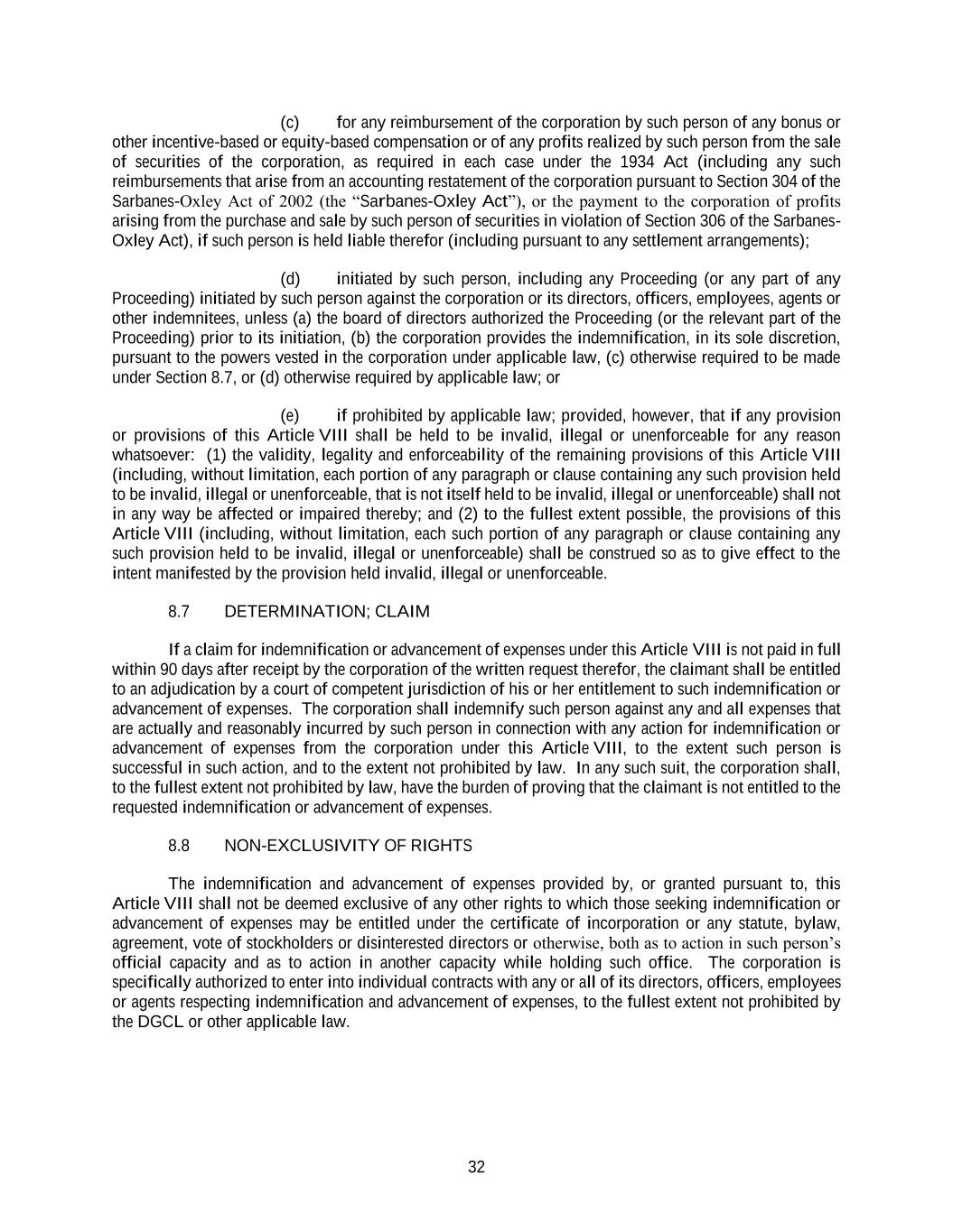 32 (c) for any reimbursement of the corporation by such person of any bonus or other incentive-based or equity-based compensation or of any profits realized by such person from the sale of securities of the corporation, as required in each case under the 1934 Act (including any such reimbursements that arise from an accounting restatement of the corporation pursuant to Section 304 of the Sarbanes-Oxley Act of 2002 (the “Sarbanes-Oxley Act”), or the payment to the corporation of profits arising from the purchase and sale by such person of securities in violation of Section 306 of the Sarbanes- Oxley Act), if such person is held liable therefor (including pursuant to any settlement arrangements); (d) initiated by such person, including any Proceeding (or any part of any Proceeding) initiated by such person against the corporation or its directors, officers, employees, agents or other indemnitees, unless (a) the board of directors authorized the Proceeding (or the relevant part of the Proceeding) prior to its initiation, (b) the corporation provides the indemnification, in its sole discretion, pursuant to the powers vested in the corporation under applicable law, (c) otherwise required to be made under Section 8.7, or (d) otherwise required by applicable law; or (e) if prohibited by applicable law; provided, however, that if any provision or provisions of this Article VIII shall be held to be invalid, illegal or unenforceable for any reason whatsoever: (1) the validity, legality and enforceability of the remaining provisions of this Article VIII (including, without limitation, each portion of any paragraph or clause containing any such provision held to be invalid, illegal or unenforceable, that is not itself held to be invalid, illegal or unenforceable) shall not in any way be affected or impaired thereby; and (2) to the fullest extent possible, the provisions of this Article VIII (including, without limitation, each such portion of any paragraph or clause containing any such provision held to be invalid, illegal or unenforceable) shall be construed so as to give effect to the intent manifested by the provision held invalid, illegal or unenforceable. 8.7 DETERMINATION; CLAIM If a claim for indemnification or advancement of expenses under this Article VIII is not paid in full within 90 days after receipt by the corporation of the written request therefor, the claimant shall be entitled to an adjudication by a court of competent jurisdiction of his or her entitlement to such indemnification or advancement of expenses. The corporation shall indemnify such person against any and all expenses that are actually and reasonably incurred by such person in connection with any action for indemnification or advancement of expenses from the corporation under this Article VIII, to the extent such person is successful in such action, and to the extent not prohibited by law. In any such suit, the corporation shall, to the fullest extent not prohibited by law, have the burden of proving that the claimant is not entitled to the requested indemnification or advancement of expenses. 8.8 NON-EXCLUSIVITY OF RIGHTS The indemnification and advancement of expenses provided by, or granted pursuant to, this Article VIII shall not be deemed exclusive of any other rights to which those seeking indemnification or advancement of expenses may be entitled under the certificate of incorporation or any statute, bylaw, agreement, vote of stockholders or disinterested directors or otherwise, both as to action in such person’s official capacity and as to action in another capacity while holding such office. The corporation is specifically authorized to enter into individual contracts with any or all of its directors, officers, employees or agents respecting indemnification and advancement of expenses, to the fullest extent not prohibited by the DGCL or other applicable law.