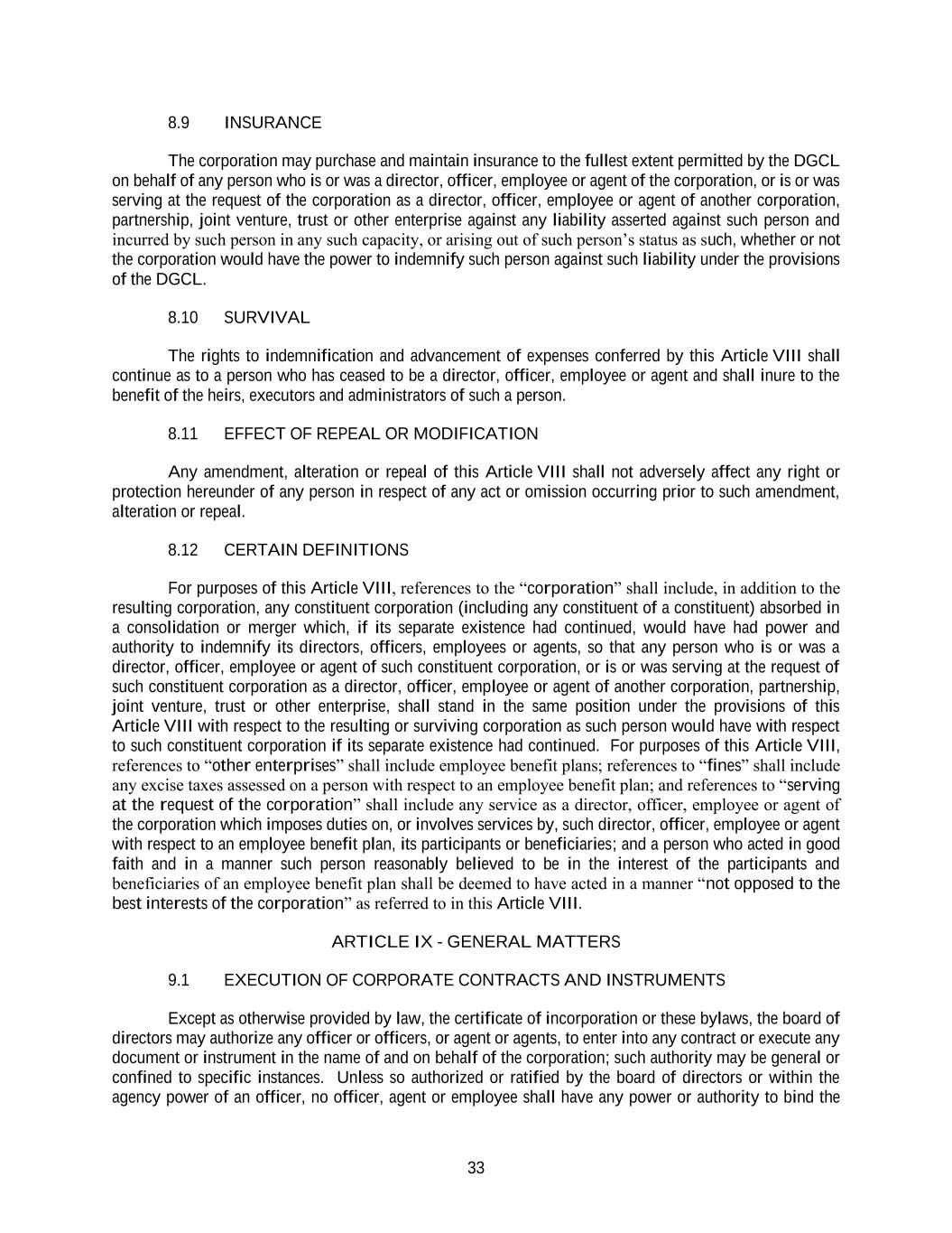 33 8.9 INSURANCE The corporation may purchase and maintain insurance to the fullest extent permitted by the DGCL on behalf of any person who is or was a director, officer, employee or agent of the corporation, or is or was serving at the request of the corporation as a director, officer, employee or agent of another corporation, partnership, joint venture, trust or other enterprise against any liability asserted against such person and incurred by such person in any such capacity, or arising out of such person’s status as such, whether or not the corporation would have the power to indemnify such person against such liability under the provisions of the DGCL. 8.10 SURVIVAL The rights to indemnification and advancement of expenses conferred by this Article VIII shall continue as to a person who has ceased to be a director, officer, employee or agent and shall inure to the benefit of the heirs, executors and administrators of such a person. 8.11 EFFECT OF REPEAL OR MODIFICATION Any amendment, alteration or repeal of this Article VIII shall not adversely affect any right or protection hereunder of any person in respect of any act or omission occurring prior to such amendment, alteration or repeal. 8.12 CERTAIN DEFINITIONS For purposes of this Article VIII, references to the “corporation” shall include, in addition to the resulting corporation, any constituent corporation (including any constituent of a constituent) absorbed in a consolidation or merger which, if its separate existence had continued, would have had power and authority to indemnify its directors, officers, employees or agents, so that any person who is or was a director, officer, employee or agent of such constituent corporation, or is or was serving at the request of such constituent corporation as a director, officer, employee or agent of another corporation, partnership, joint venture, trust or other enterprise, shall stand in the same position under the provisions of this Article VIII with respect to the resulting or surviving corporation as such person would have with respect to such constituent corporation if its separate existence had continued. For purposes of this Article VIII, references to “other enterprises” shall include employee benefit plans; references to “fines” shall include any excise taxes assessed on a person with respect to an employee benefit plan; and references to “serving at the request of the corporation” shall include any service as a director, officer, employee or agent of the corporation which imposes duties on, or involves services by, such director, officer, employee or agent with respect to an employee benefit plan, its participants or beneficiaries; and a person who acted in good faith and in a manner such person reasonably believed to be in the interest of the participants and beneficiaries of an employee benefit plan shall be deemed to have acted in a manner “not opposed to the best interests of the corporation” as referred to in this Article VIII. ARTICLE IX - GENERAL MATTERS 9.1 EXECUTION OF CORPORATE CONTRACTS AND INSTRUMENTS Except as otherwise provided by law, the certificate of incorporation or these bylaws, the board of directors may authorize any officer or officers, or agent or agents, to enter into any contract or execute any document or instrument in the name of and on behalf of the corporation; such authority may be general or confined to specific instances. Unless so authorized or ratified by the board of directors or within the agency power of an officer, no officer, agent or employee shall have any power or authority to bind the