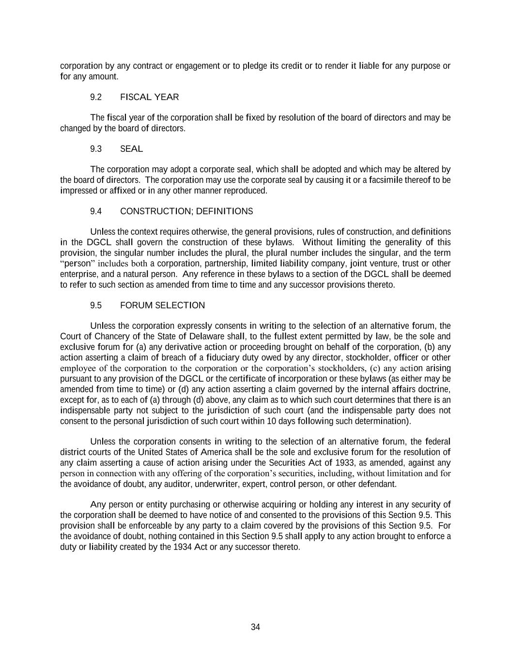 34 corporation by any contract or engagement or to pledge its credit or to render it liable for any purpose or for any amount. 9.2 FISCAL YEAR The fiscal year of the corporation shall be fixed by resolution of the board of directors and may be changed by the board of directors. 9.3 SEAL The corporation may adopt a corporate seal, which shall be adopted and which may be altered by the board of directors. The corporation may use the corporate seal by causing it or a facsimile thereof to be impressed or affixed or in any other manner reproduced. 9.4 CONSTRUCTION; DEFINITIONS Unless the context requires otherwise, the general provisions, rules of construction, and definitions in the DGCL shall govern the construction of these bylaws. Without limiting the generality of this provision, the singular number includes the plural, the plural number includes the singular, and the term “person” includes both a corporation, partnership, limited liability company, joint venture, trust or other enterprise, and a natural person. Any reference in these bylaws to a section of the DGCL shall be deemed to refer to such section as amended from time to time and any successor provisions thereto. 9.5 FORUM SELECTION Unless the corporation expressly consents in writing to the selection of an alternative forum, the Court of Chancery of the State of Delaware shall, to the fullest extent permitted by law, be the sole and exclusive forum for (a) any derivative action or proceeding brought on behalf of the corporation, (b) any action asserting a claim of breach of a fiduciary duty owed by any director, stockholder, officer or other employee of the corporation to the corporation or the corporation’s stockholders, (c) any action arising pursuant to any provision of the DGCL or the certificate of incorporation or these bylaws (as either may be amended from time to time) or (d) any action asserting a claim governed by the internal affairs doctrine, except for, as to each of (a) through (d) above, any claim as to which such court determines that there is an indispensable party not subject to the jurisdiction of such court (and the indispensable party does not consent to the personal jurisdiction of such court within 10 days following such determination). Unless the corporation consents in writing to the selection of an alternative forum, the federal district courts of the United States of America shall be the sole and exclusive forum for the resolution of any claim asserting a cause of action arising under the Securities Act of 1933, as amended, against any person in connection with any offering of the corporation’s securities, including, without limitation and for the avoidance of doubt, any auditor, underwriter, expert, control person, or other defendant. Any person or entity purchasing or otherwise acquiring or holding any interest in any security of the corporation shall be deemed to have notice of and consented to the provisions of this Section 9.5. This provision shall be enforceable by any party to a claim covered by the provisions of this Section 9.5. For the avoidance of doubt, nothing contained in this Section 9.5 shall apply to any action brought to enforce a duty or liability created by the 1934 Act or any successor thereto.