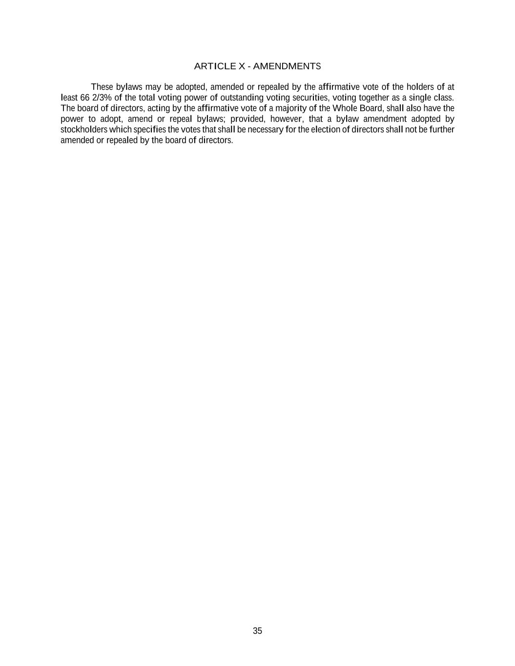 35 ARTICLE X - AMENDMENTS These bylaws may be adopted, amended or repealed by the affirmative vote of the holders of at least 66 2/3% of the total voting power of outstanding voting securities, voting together as a single class. The board of directors, acting by the affirmative vote of a majority of the Whole Board, shall also have the power to adopt, amend or repeal bylaws; provided, however, that a bylaw amendment adopted by stockholders which specifies the votes that shall be necessary for the election of directors shall not be further amended or repealed by the board of directors.