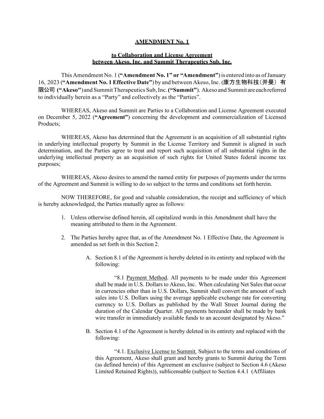 AMENDMENT No. 1 to Collaboration and License Agreement between Akeso, Inc. and Summit Therapeutics Sub, Inc. This Amendment No. 1 (“Amendment No. 1” or “Amendment”) is entered into as of January 16, 2023 (“Amendment No. 1 Effective Date”) by and between Akeso, Inc. (康方生物科技(开曼)有 限公司 (“Akeso") and Summit Therapeutics Sub, Inc. (“Summit”). Akeso and Summit are each referred to individually herein as a “Party” and collectively as the “Parties”. WHEREAS, Akeso and Summit are Parties to a Collaboration and License Agreement executed on December 5, 2022 (“Agreement”) concerning the development and commercialization of Licensed Products; WHEREAS, Akeso has determined that the Agreement is an acquisition of all substantial rights in underlying intellectual property by Summit in the License Territory and Summit is aligned in such determination, and the Parties agree to treat and report such acquisition of all substantial rights in the underlying intellectual property as an acquisition of such rights for United States federal income tax purposes; WHEREAS, Akeso desires to amend the named entity for purposes of payments under the terms of the Agreement and Summit is willing to do so subject to the terms and conditions set forth herein. NOW THEREFORE, for good and valuable consideration, the receipt and sufficiency of which is hereby acknowledged, the Parties mutually agree as follows: 1. Unless otherwise defined herein, all capitalized words in this Amendment shall have the meaning attributed to them in the Agreement. 2. The Parties hereby agree that, as of the Amendment No. 1 Effective Date, the Agreement is amended as set forth in this Section 2. A. Section 8.1 of the Agreement is hereby deleted in its entirety and replaced with the following: “8.1 Payment Method. All payments to be made under this Agreement shall be made in U.S. Dollars to Akeso, Inc. When calculating Net Sales that occur in currencies other than in U.S. Dollars, Summit shall convert the amount of such sales into U.S. Dollars using the average applicable exchange rate for converting currency to U.S. Dollars as published by the Wall Street Journal during the duration of the Calendar Quarter. All payments hereunder shall be made by bank wire transfer in immediately available funds to an account designated by Akeso.” B. Section 4.1 of the Agreement is hereby deleted in its entirety and replaced with the following: “4.1. Exclusive License to Summit. Subject to the terms and conditions of this Agreement, Akeso shall grant and hereby grants to Summit during the Term (as defined herein) of this Agreement an exclusive (subject to Section 4.6 (Akeso Limited Retained Rights)), sublicensable (subject to Section 4.4.1 (Affiliates