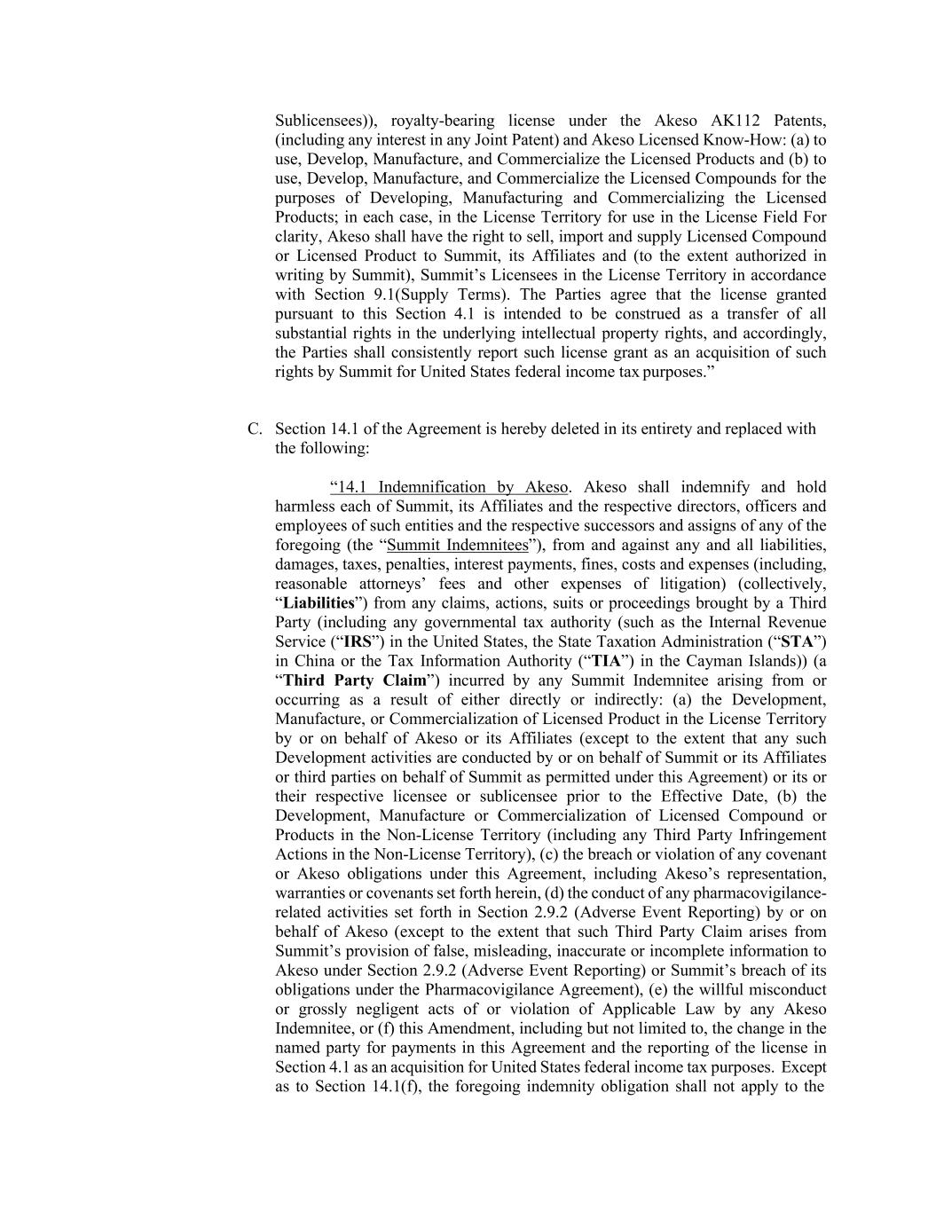Sublicensees)), royalty-bearing license under the Akeso AK112 Patents, (including any interest in any Joint Patent) and Akeso Licensed Know-How: (a) to use, Develop, Manufacture, and Commercialize the Licensed Products and (b) to use, Develop, Manufacture, and Commercialize the Licensed Compounds for the purposes of Developing, Manufacturing and Commercializing the Licensed Products; in each case, in the License Territory for use in the License Field For clarity, Akeso shall have the right to sell, import and supply Licensed Compound or Licensed Product to Summit, its Affiliates and (to the extent authorized in writing by Summit), Summit’s Licensees in the License Territory in accordance with Section 9.1(Supply Terms). The Parties agree that the license granted pursuant to this Section 4.1 is intended to be construed as a transfer of all substantial rights in the underlying intellectual property rights, and accordingly, the Parties shall consistently report such license grant as an acquisition of such rights by Summit for United States federal income tax purposes.” C. Section 14.1 of the Agreement is hereby deleted in its entirety and replaced with the following: “14.1 Indemnification by Akeso. Akeso shall indemnify and hold harmless each of Summit, its Affiliates and the respective directors, officers and employees of such entities and the respective successors and assigns of any of the foregoing (the “Summit Indemnitees”), from and against any and all liabilities, damages, taxes, penalties, interest payments, fines, costs and expenses (including, reasonable attorneys’ fees and other expenses of litigation) (collectively, “Liabilities”) from any claims, actions, suits or proceedings brought by a Third Party (including any governmental tax authority (such as the Internal Revenue Service (“IRS”) in the United States, the State Taxation Administration (“STA”) in China or the Tax Information Authority (“TIA”) in the Cayman Islands)) (a “Third Party Claim”) incurred by any Summit Indemnitee arising from or occurring as a result of either directly or indirectly: (a) the Development, Manufacture, or Commercialization of Licensed Product in the License Territory by or on behalf of Akeso or its Affiliates (except to the extent that any such Development activities are conducted by or on behalf of Summit or its Affiliates or third parties on behalf of Summit as permitted under this Agreement) or its or their respective licensee or sublicensee prior to the Effective Date, (b) the Development, Manufacture or Commercialization of Licensed Compound or Products in the Non-License Territory (including any Third Party Infringement Actions in the Non-License Territory), (c) the breach or violation of any covenant or Akeso obligations under this Agreement, including Akeso’s representation, warranties or covenants set forth herein, (d) the conduct of any pharmacovigilance- related activities set forth in Section 2.9.2 (Adverse Event Reporting) by or on behalf of Akeso (except to the extent that such Third Party Claim arises from Summit’s provision of false, misleading, inaccurate or incomplete information to Akeso under Section 2.9.2 (Adverse Event Reporting) or Summit’s breach of its obligations under the Pharmacovigilance Agreement), (e) the willful misconduct or grossly negligent acts of or violation of Applicable Law by any Akeso Indemnitee, or (f) this Amendment, including but not limited to, the change in the named party for payments in this Agreement and the reporting of the license in Section 4.1 as an acquisition for United States federal income tax purposes. Except as to Section 14.1(f), the foregoing indemnity obligation shall not apply to the