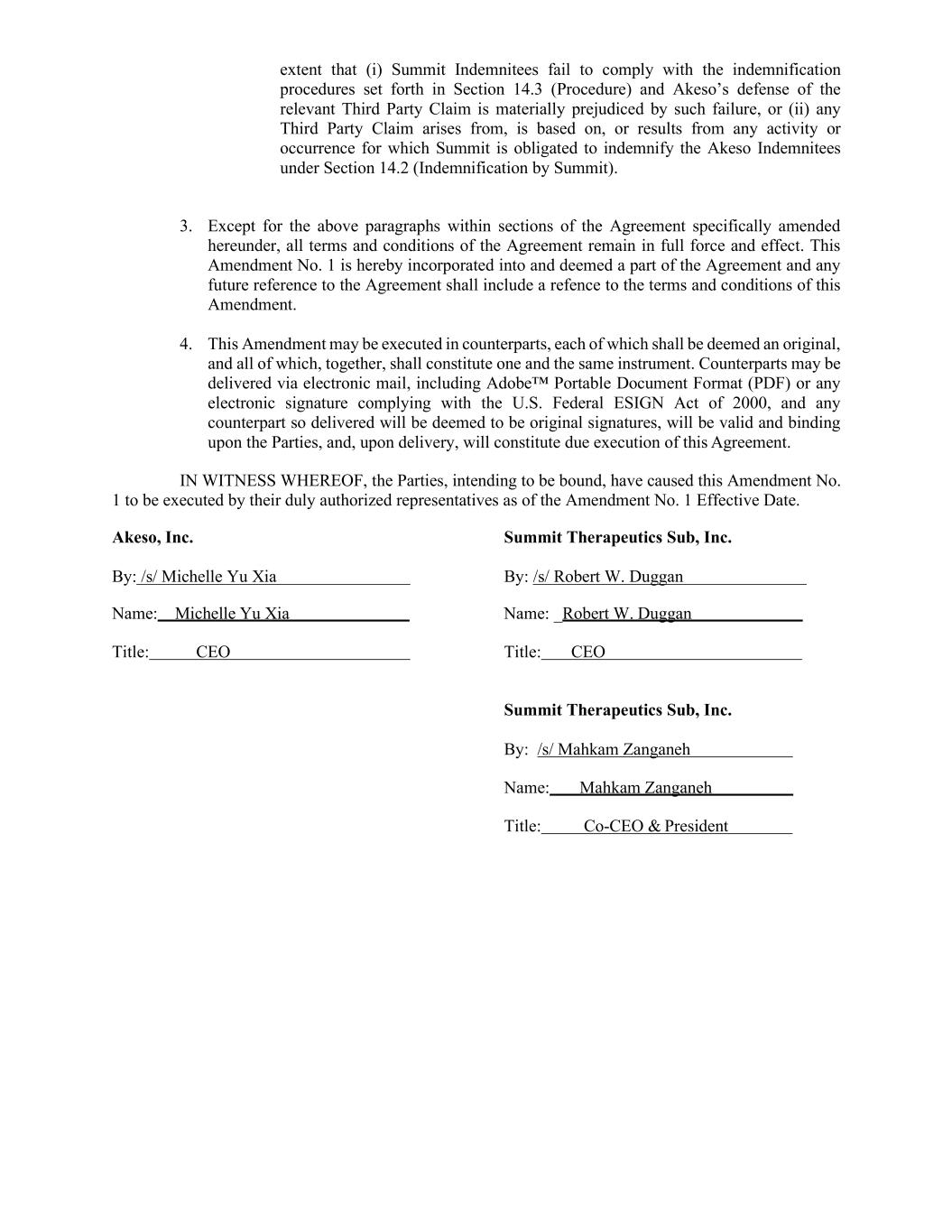 extent that (i) Summit Indemnitees fail to comply with the indemnification procedures set forth in Section 14.3 (Procedure) and Akeso’s defense of the relevant Third Party Claim is materially prejudiced by such failure, or (ii) any Third Party Claim arises from, is based on, or results from any activity or occurrence for which Summit is obligated to indemnify the Akeso Indemnitees under Section 14.2 (Indemnification by Summit). 3. Except for the above paragraphs within sections of the Agreement specifically amended hereunder, all terms and conditions of the Agreement remain in full force and effect. This Amendment No. 1 is hereby incorporated into and deemed a part of the Agreement and any future reference to the Agreement shall include a refence to the terms and conditions of this Amendment. 4. This Amendment may be executed in counterparts, each of which shall be deemed an original, and all of which, together, shall constitute one and the same instrument. Counterparts may be delivered via electronic mail, including Adobe™ Portable Document Format (PDF) or any electronic signature complying with the U.S. Federal ESIGN Act of 2000, and any counterpart so delivered will be deemed to be original signatures, will be valid and binding upon the Parties, and, upon delivery, will constitute due execution of this Agreement. IN WITNESS WHEREOF, the Parties, intending to be bound, have caused this Amendment No. 1 to be executed by their duly authorized representatives as of the Amendment No. 1 Effective Date. Akeso, Inc. Summit Therapeutics Sub, Inc. By: /s/ Michelle Yu Xia By: /s/ Robert W. Duggan Name: Michelle Yu Xia Name: _Robert W. Duggan Title: CEO Title: CEO Summit Therapeutics Sub, Inc. By: /s/ Mahkam Zanganeh Name: Mahkam Zanganeh Title: Co-CEO & President