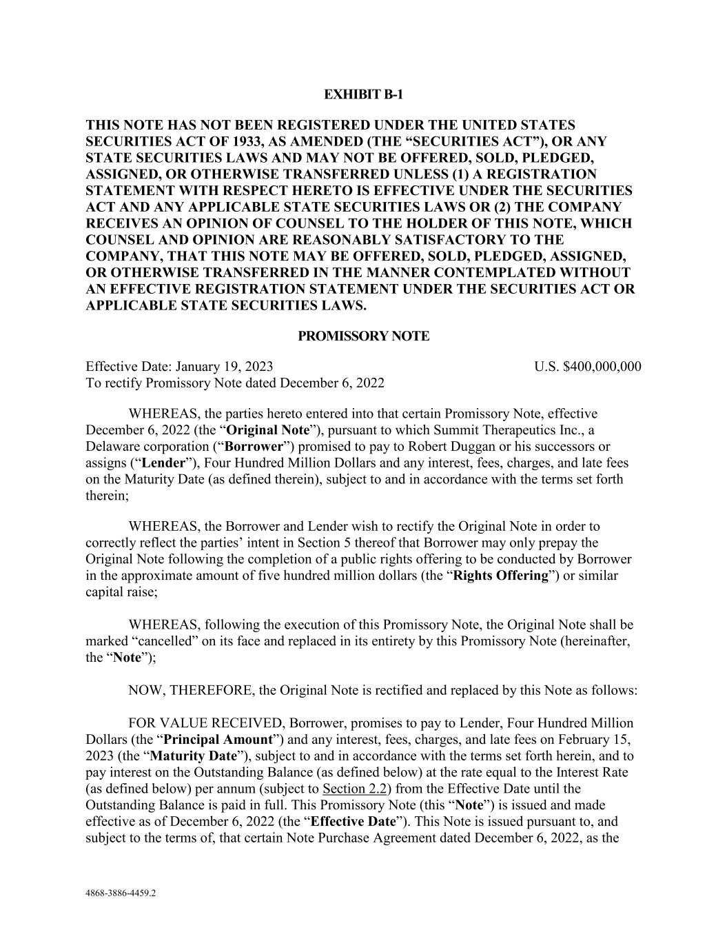 4868-3886-4459.2 EXHIBIT B-1 THIS NOTE HAS NOT BEEN REGISTERED UNDER THE UNITED STATES SECURITIES ACT OF 1933, AS AMENDED (THE “SECURITIES ACT”), OR ANY STATE SECURITIES LAWS AND MAY NOT BE OFFERED, SOLD, PLEDGED, ASSIGNED, OR OTHERWISE TRANSFERRED UNLESS (1) A REGISTRATION STATEMENT WITH RESPECT HERETO IS EFFECTIVE UNDER THE SECURITIES ACT AND ANY APPLICABLE STATE SECURITIES LAWS OR (2) THE COMPANY RECEIVES AN OPINION OF COUNSEL TO THE HOLDER OF THIS NOTE, WHICH COUNSEL AND OPINION ARE REASONABLY SATISFACTORY TO THE COMPANY, THAT THIS NOTE MAY BE OFFERED, SOLD, PLEDGED, ASSIGNED, OR OTHERWISE TRANSFERRED IN THE MANNER CONTEMPLATED WITHOUT AN EFFECTIVE REGISTRATION STATEMENT UNDER THE SECURITIES ACT OR APPLICABLE STATE SECURITIES LAWS. PROMISSORY NOTE Effective Date: January 19, 2023 U.S. $400,000,000 To rectify Promissory Note dated December 6, 2022 WHEREAS, the parties hereto entered into that certain Promissory Note, effective December 6, 2022 (the “Original Note”), pursuant to which Summit Therapeutics Inc., a Delaware corporation (“Borrower”) promised to pay to Robert Duggan or his successors or assigns (“Lender”), Four Hundred Million Dollars and any interest, fees, charges, and late fees on the Maturity Date (as defined therein), subject to and in accordance with the terms set forth therein; WHEREAS, the Borrower and Lender wish to rectify the Original Note in order to correctly reflect the parties’ intent in Section 5 thereof that Borrower may only prepay the Original Note following the completion of a public rights offering to be conducted by Borrower in the approximate amount of five hundred million dollars (the “Rights Offering”) or similar capital raise; WHEREAS, following the execution of this Promissory Note, the Original Note shall be marked “cancelled” on its face and replaced in its entirety by this Promissory Note (hereinafter, the “Note”); NOW, THEREFORE, the Original Note is rectified and replaced by this Note as follows: FOR VALUE RECEIVED, Borrower, promises to pay to Lender, Four Hundred Million Dollars (the “Principal Amount”) and any interest, fees, charges, and late fees on February 15, 2023 (the “Maturity Date”), subject to and in accordance with the terms set forth herein, and to pay interest on the Outstanding Balance (as defined below) at the rate equal to the Interest Rate (as defined below) per annum (subject to Section 2.2) from the Effective Date until the Outstanding Balance is paid in full. This Promissory Note (this “Note”) is issued and made effective as of December 6, 2022 (the “Effective Date”). This Note is issued pursuant to, and subject to the terms of, that certain Note Purchase Agreement dated December 6, 2022, as the