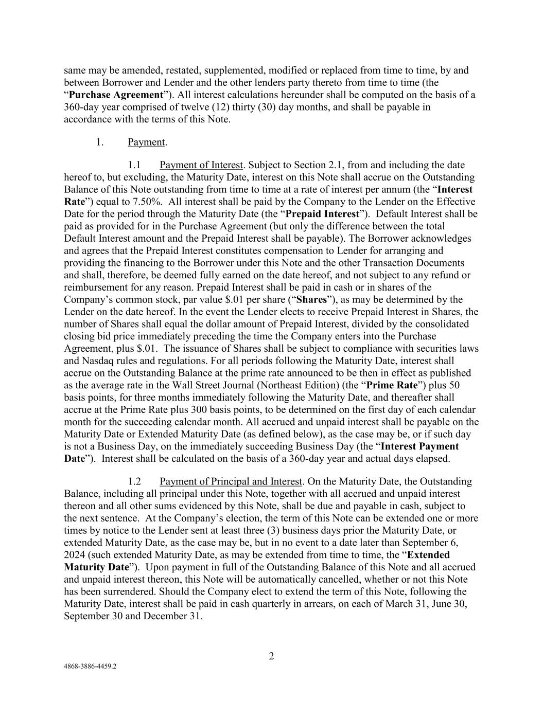 2 4868-3886-4459.2 same may be amended, restated, supplemented, modified or replaced from time to time, by and between Borrower and Lender and the other lenders party thereto from time to time (the “Purchase Agreement”). All interest calculations hereunder shall be computed on the basis of a 360-day year comprised of twelve (12) thirty (30) day months, and shall be payable in accordance with the terms of this Note. 1. Payment. 1.1 Payment of Interest. Subject to Section 2.1, from and including the date hereof to, but excluding, the Maturity Date, interest on this Note shall accrue on the Outstanding Balance of this Note outstanding from time to time at a rate of interest per annum (the “Interest Rate”) equal to 7.50%. All interest shall be paid by the Company to the Lender on the Effective Date for the period through the Maturity Date (the “Prepaid Interest”). Default Interest shall be paid as provided for in the Purchase Agreement (but only the difference between the total Default Interest amount and the Prepaid Interest shall be payable). The Borrower acknowledges and agrees that the Prepaid Interest constitutes compensation to Lender for arranging and providing the financing to the Borrower under this Note and the other Transaction Documents and shall, therefore, be deemed fully earned on the date hereof, and not subject to any refund or reimbursement for any reason. Prepaid Interest shall be paid in cash or in shares of the Company’s common stock, par value $.01 per share (“Shares”), as may be determined by the Lender on the date hereof. In the event the Lender elects to receive Prepaid Interest in Shares, the number of Shares shall equal the dollar amount of Prepaid Interest, divided by the consolidated closing bid price immediately preceding the time the Company enters into the Purchase Agreement, plus $.01. The issuance of Shares shall be subject to compliance with securities laws and Nasdaq rules and regulations. For all periods following the Maturity Date, interest shall accrue on the Outstanding Balance at the prime rate announced to be then in effect as published as the average rate in the Wall Street Journal (Northeast Edition) (the “Prime Rate”) plus 50 basis points, for three months immediately following the Maturity Date, and thereafter shall accrue at the Prime Rate plus 300 basis points, to be determined on the first day of each calendar month for the succeeding calendar month. All accrued and unpaid interest shall be payable on the Maturity Date or Extended Maturity Date (as defined below), as the case may be, or if such day is not a Business Day, on the immediately succeeding Business Day (the “Interest Payment Date”). Interest shall be calculated on the basis of a 360-day year and actual days elapsed. 1.2 Payment of Principal and Interest. On the Maturity Date, the Outstanding Balance, including all principal under this Note, together with all accrued and unpaid interest thereon and all other sums evidenced by this Note, shall be due and payable in cash, subject to the next sentence. At the Company’s election, the term of this Note can be extended one or more times by notice to the Lender sent at least three (3) business days prior the Maturity Date, or extended Maturity Date, as the case may be, but in no event to a date later than September 6, 2024 (such extended Maturity Date, as may be extended from time to time, the “Extended Maturity Date”). Upon payment in full of the Outstanding Balance of this Note and all accrued and unpaid interest thereon, this Note will be automatically cancelled, whether or not this Note has been surrendered. Should the Company elect to extend the term of this Note, following the Maturity Date, interest shall be paid in cash quarterly in arrears, on each of March 31, June 30, September 30 and December 31.