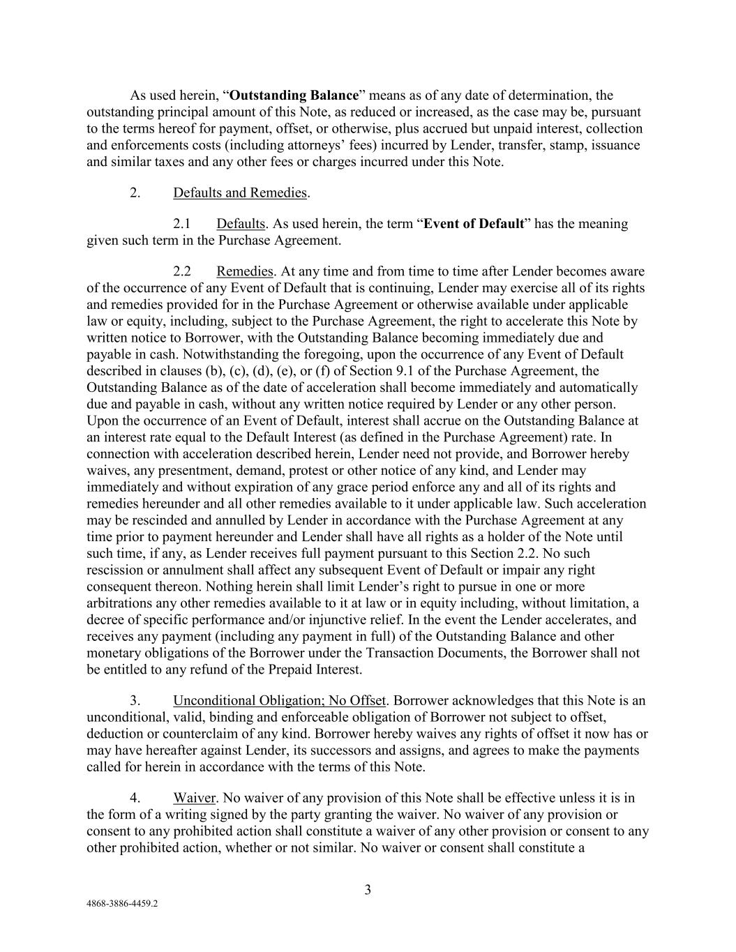 3 4877-5800-7115.2 As used herein, “Outstanding Balance” means as of any date of determination, the outstanding principal amount of this Note, as reduced or increased, as the case may be, pursuant to the terms hereof for payment, offset, or otherwise, plus accrued but unpaid interest, collection and enforcements costs (including attorneys’ fees) incurred by Lender, transfer, stamp, issuance and similar taxes and any other fees or charges incurred under this Note. 2. Defaults and Remedies. 2.1 Defaults. As used herein, the term “Event of Default” has the meaning given such term in the Purchase Agreement. 2.2 Remedies. At any time and from time to time after Lender becomes aware of the occurrence of any Event of Default that is continuing, Lender may exercise all of its rights and remedies provided for in the Purchase Agreement or otherwise available under applicable law or equity, including, subject to the Purchase Agreement, the right to accelerate this Note by written notice to Borrower, with the Outstanding Balance becoming immediately due and payable in cash. Notwithstanding the foregoing, upon the occurrence of any Event of Default described in clauses (b), (c), (d), (e), or (f) of Section 9.1 of the Purchase Agreement, the Outstanding Balance as of the date of acceleration shall become immediately and automatically due and payable in cash, without any written notice required by Lender or any other person. Upon the occurrence of an Event of Default, interest shall accrue on the Outstanding Balance at an interest rate equal to the Default Interest (as defined in the Purchase Agreement) rate. In connection with acceleration described herein, Lender need not provide, and Borrower hereby waives, any presentment, demand, protest or other notice of any kind, and Lender may immediately and without expiration of any grace period enforce any and all of its rights and remedies hereunder and all other remedies available to it under applicable law. Such acceleration may be rescinded and annulled by Lender in accordance with the Purchase Agreement at any time prior to payment hereunder and Lender shall have all rights as a holder of the Note until such time, if any, as Lender receives full payment pursuant to this Section 2.2. No such rescission or annulment shall affect any subsequent Event of Default or impair any right consequent thereon. Nothing herein shall limit Lender’s right to pursue in one or more arbitrations any other remedies available to it at law or in equity including, without limitation, a decree of specific performance and/or injunctive relief. In the event the Lender accelerates, and receives any payment (including any payment in full) of the Outstanding Balance and other monetary obligations of the Borrower under the Transaction Documents, the Borrower shall not be entitled to any refund of the Prepaid Interest. 3. Unconditional Obligation; No Offset. Borrower acknowledges that this Note is an unconditional, valid, binding and enforceable obligation of Borrower not subject to offset, deduction or counterclaim of any kind. Borrower hereby waives any rights of offset it now has or may have hereafter against Lender, its successors and assigns, and agrees to make the payments called for herein in accordance with the terms of this Note. 4. Waiver. No waiver of any provision of this Note shall be effective unless it is in the form of a writing signed by the party granting the waiver. No waiver of any provision or consent to any prohibited action shall constitute a waiver of any other provision or consent to any other prohibited action, whether or not similar. No waiver or consent shall constitute a