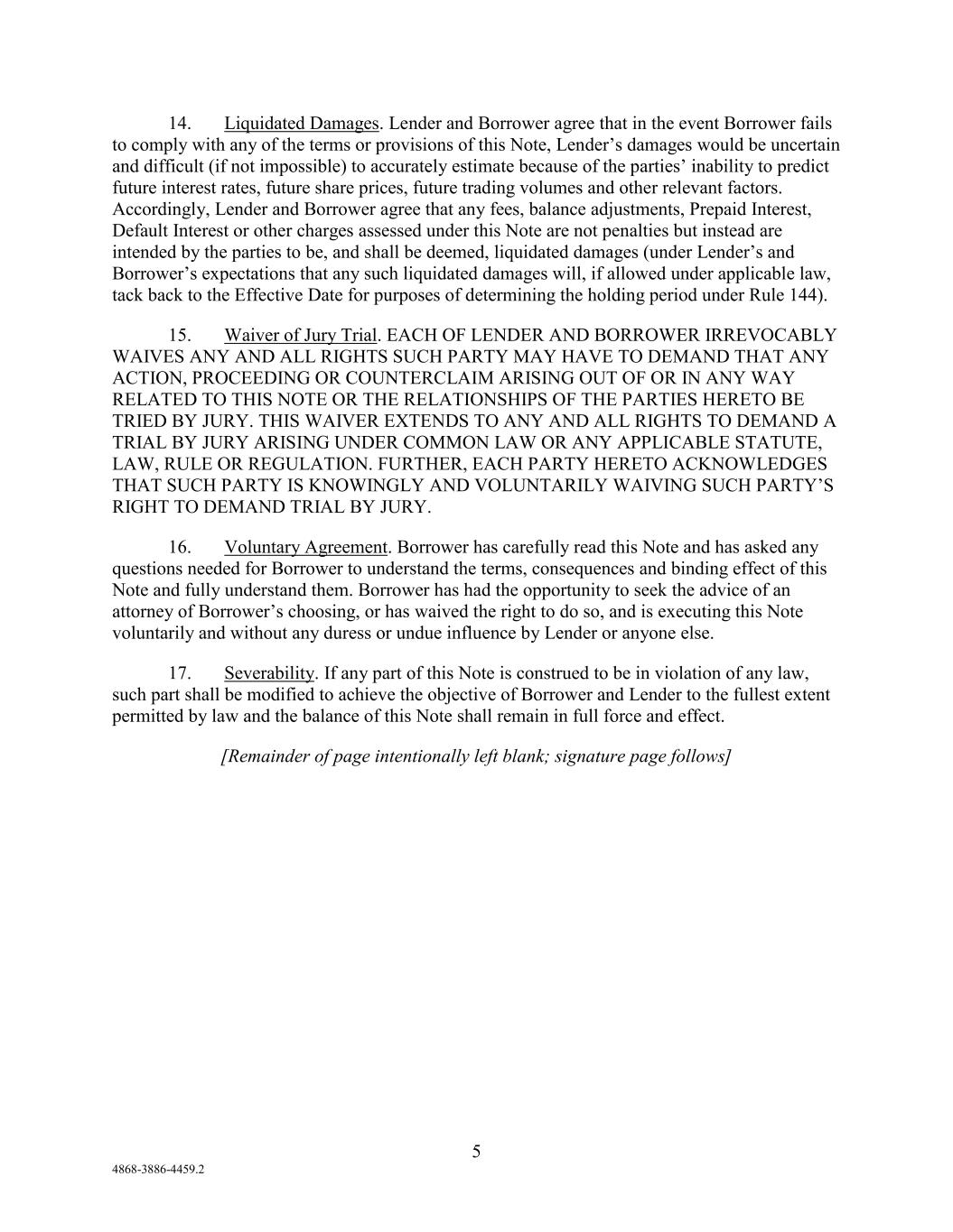 5 4877-5800-7115.2 14. Liquidated Damages. Lender and Borrower agree that in the event Borrower fails to comply with any of the terms or provisions of this Note, Lender’s damages would be uncertain and difficult (if not impossible) to accurately estimate because of the parties’ inability to predict future interest rates, future share prices, future trading volumes and other relevant factors. Accordingly, Lender and Borrower agree that any fees, balance adjustments, Prepaid Interest, Default Interest or other charges assessed under this Note are not penalties but instead are intended by the parties to be, and shall be deemed, liquidated damages (under Lender’s and Borrower’s expectations that any such liquidated damages will, if allowed under applicable law, tack back to the Effective Date for purposes of determining the holding period under Rule 144). 15. Waiver of Jury Trial. EACH OF LENDER AND BORROWER IRREVOCABLY WAIVES ANY AND ALL RIGHTS SUCH PARTY MAY HAVE TO DEMAND THAT ANY ACTION, PROCEEDING OR COUNTERCLAIM ARISING OUT OF OR IN ANY WAY RELATED TO THIS NOTE OR THE RELATIONSHIPS OF THE PARTIES HERETO BE TRIED BY JURY. THIS WAIVER EXTENDS TO ANY AND ALL RIGHTS TO DEMAND A TRIAL BY JURY ARISING UNDER COMMON LAW OR ANY APPLICABLE STATUTE, LAW, RULE OR REGULATION. FURTHER, EACH PARTY HERETO ACKNOWLEDGES THAT SUCH PARTY IS KNOWINGLY AND VOLUNTARILY WAIVING SUCH PARTY’S RIGHT TO DEMAND TRIAL BY JURY. 16. Voluntary Agreement. Borrower has carefully read this Note and has asked any questions needed for Borrower to understand the terms, consequences and binding effect of this Note and fully understand them. Borrower has had the opportunity to seek the advice of an attorney of Borrower’s choosing, or has waived the right to do so, and is executing this Note voluntarily and without any duress or undue influence by Lender or anyone else. 17. Severability. If any part of this Note is construed to be in violation of any law, such part shall be modified to achieve the objective of Borrower and Lender to the fullest extent permitted by law and the balance of this Note shall remain in full force and effect. [Remainder of page intentionally left blank; signature page follows]
