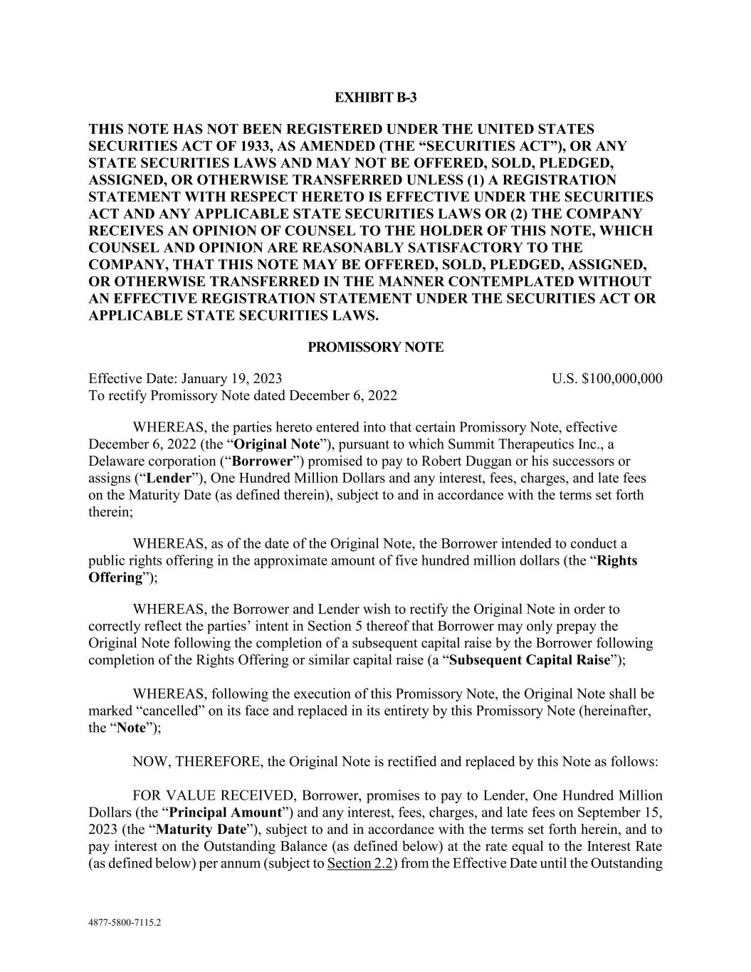 4877-5800-7115.2 EXHIBIT B-3 THIS NOTE HAS NOT BEEN REGISTERED UNDER THE UNITED STATES SECURITIES ACT OF 1933, AS AMENDED (THE “SECURITIES ACT”), OR ANY STATE SECURITIES LAWS AND MAY NOT BE OFFERED, SOLD, PLEDGED, ASSIGNED, OR OTHERWISE TRANSFERRED UNLESS (1) A REGISTRATION STATEMENT WITH RESPECT HERETO IS EFFECTIVE UNDER THE SECURITIES ACT AND ANY APPLICABLE STATE SECURITIES LAWS OR (2) THE COMPANY RECEIVES AN OPINION OF COUNSEL TO THE HOLDER OF THIS NOTE, WHICH COUNSEL AND OPINION ARE REASONABLY SATISFACTORY TO THE COMPANY, THAT THIS NOTE MAY BE OFFERED, SOLD, PLEDGED, ASSIGNED, OR OTHERWISE TRANSFERRED IN THE MANNER CONTEMPLATED WITHOUT AN EFFECTIVE REGISTRATION STATEMENT UNDER THE SECURITIES ACT OR APPLICABLE STATE SECURITIES LAWS. PROMISSORY NOTE Effective Date: January 19, 2023 U.S. $100,000,000 To rectify Promissory Note dated December 6, 2022 WHEREAS, the parties hereto entered into that certain Promissory Note, effective December 6, 2022 (the “Original Note”), pursuant to which Summit Therapeutics Inc., a Delaware corporation (“Borrower”) promised to pay to Robert Duggan or his successors or assigns (“Lender”), One Hundred Million Dollars and any interest, fees, charges, and late fees on the Maturity Date (as defined therein), subject to and in accordance with the terms set forth therein; WHEREAS, as of the date of the Original Note, the Borrower intended to conduct a public rights offering in the approximate amount of five hundred million dollars (the “Rights Offering”); WHEREAS, the Borrower and Lender wish to rectify the Original Note in order to correctly reflect the parties’ intent in Section 5 thereof that Borrower may only prepay the Original Note following the completion of a subsequent capital raise by the Borrower following completion of the Rights Offering or similar capital raise (a “Subsequent Capital Raise”); WHEREAS, following the execution of this Promissory Note, the Original Note shall be marked “cancelled” on its face and replaced in its entirety by this Promissory Note (hereinafter, the “Note”); NOW, THEREFORE, the Original Note is rectified and replaced by this Note as follows: FOR VALUE RECEIVED, Borrower, promises to pay to Lender, One Hundred Million Dollars (the “Principal Amount”) and any interest, fees, charges, and late fees on September 15, 2023 (the “Maturity Date”), subject to and in accordance with the terms set forth herein, and to pay interest on the Outstanding Balance (as defined below) at the rate equal to the Interest Rate (as defined below) per annum (subject to Section 2.2) from the Effective Date until the Outstanding