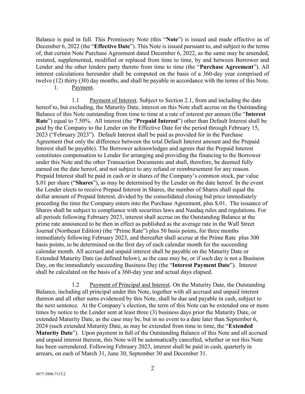 2 4877-5800-7115.2 Balance is paid in full. This Promissory Note (this “Note”) is issued and made effective as of December 6, 2022 (the “Effective Date”). This Note is issued pursuant to, and subject to the terms of, that certain Note Purchase Agreement dated December 6, 2022, as the same may be amended, restated, supplemented, modified or replaced from time to time, by and between Borrower and Lender and the other lenders party thereto from time to time (the “Purchase Agreement”). All interest calculations hereunder shall be computed on the basis of a 360-day year comprised of twelve (12) thirty (30) day months, and shall be payable in accordance with the terms of this Note. 1. Payment. 1.1 Payment of Interest. Subject to Section 2.1, from and including the date hereof to, but excluding, the Maturity Date, interest on this Note shall accrue on the Outstanding Balance of this Note outstanding from time to time at a rate of interest per annum (the “Interest Rate”) equal to 7.50%. All interest (the “Prepaid Interest”) other than Default Interest shall be paid by the Company to the Lender on the Effective Date for the period through February 15, 2023 (“February 2023”). Default Interest shall be paid as provided for in the Purchase Agreement (but only the difference between the total Default Interest amount and the Prepaid Interest shall be payable). The Borrower acknowledges and agrees that the Prepaid Interest constitutes compensation to Lender for arranging and providing the financing to the Borrower under this Note and the other Transaction Documents and shall, therefore, be deemed fully earned on the date hereof, and not subject to any refund or reimbursement for any reason. Prepaid Interest shall be paid in cash or in shares of the Company’s common stock, par value $.01 per share (“Shares”), as may be determined by the Lender on the date hereof. In the event the Lender elects to receive Prepaid Interest in Shares, the number of Shares shall equal the dollar amount of Prepaid Interest, divided by the consolidated closing bid price immediately preceding the time the Company enters into the Purchase Agreement, plus $.01. The issuance of Shares shall be subject to compliance with securities laws and Nasdaq rules and regulations. For all periods following February 2023, interest shall accrue on the Outstanding Balance at the prime rate announced to be then in effect as published as the average rate in the Wall Street Journal (Northeast Edition) (the “Prime Rate”) plus 50 basis points, for three months immediately following February 2023, and thereafter shall accrue at the Prime Rate plus 300 basis points, to be determined on the first day of each calendar month for the succeeding calendar month. All accrued and unpaid interest shall be payable on the Maturity Date or Extended Maturity Date (as defined below), as the case may be, or if such day is not a Business Day, on the immediately succeeding Business Day (the “Interest Payment Date”). Interest shall be calculated on the basis of a 360-day year and actual days elapsed. 1.2 Payment of Principal and Interest. On the Maturity Date, the Outstanding Balance, including all principal under this Note, together with all accrued and unpaid interest thereon and all other sums evidenced by this Note, shall be due and payable in cash, subject to the next sentence. At the Company’s election, the term of this Note can be extended one or more times by notice to the Lender sent at least three (3) business days prior the Maturity Date, or extended Maturity Date, as the case may be, but in no event to a date later than September 6, 2024 (such extended Maturity Date, as may be extended from time to time, the “Extended Maturity Date”). Upon payment in full of the Outstanding Balance of this Note and all accrued and unpaid interest thereon, this Note will be automatically cancelled, whether or not this Note has been surrendered. Following February 2023, interest shall be paid in cash, quarterly in arrears, on each of March 31, June 30, September 30 and December 31.