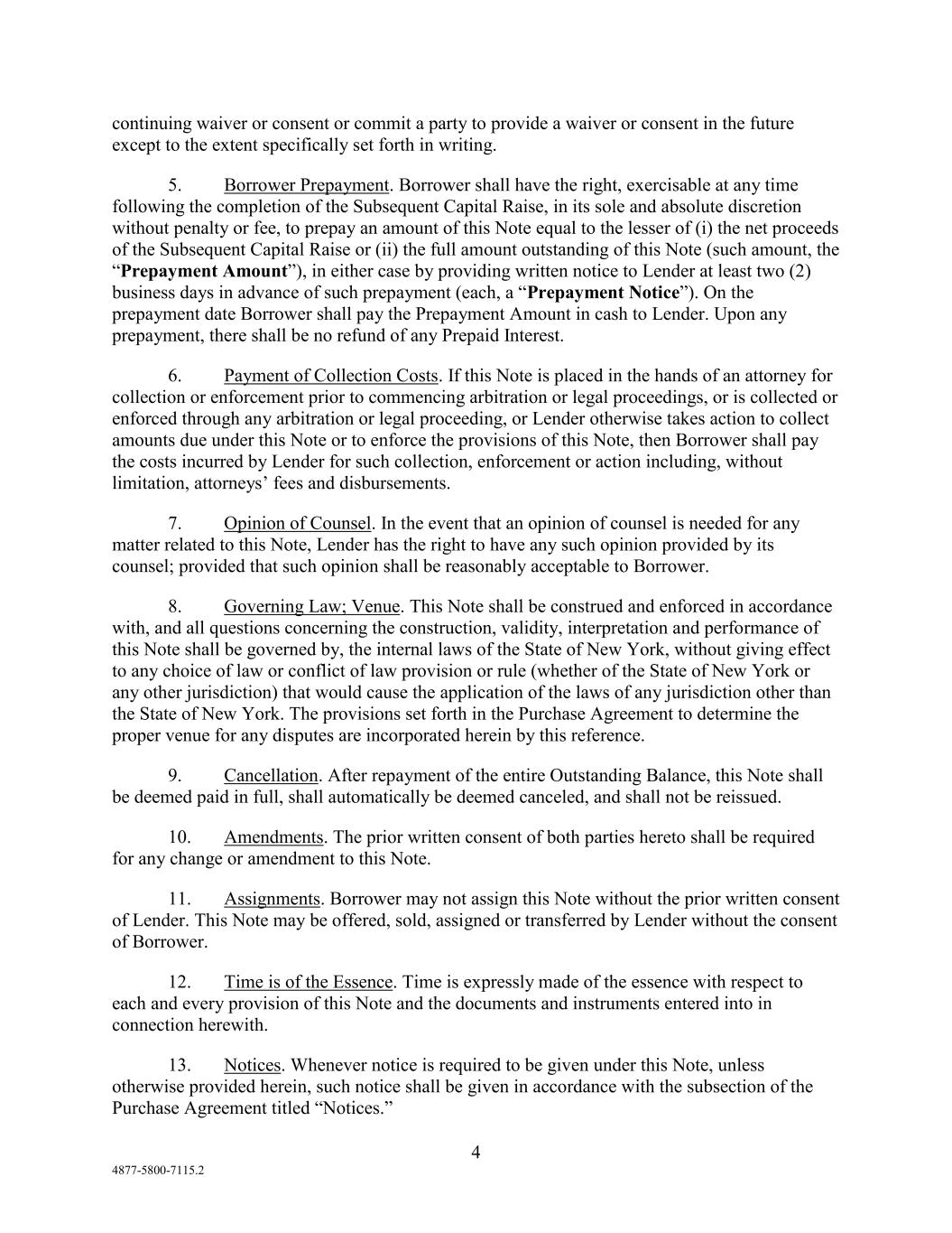 4 4877-5800-7115.2 continuing waiver or consent or commit a party to provide a waiver or consent in the future except to the extent specifically set forth in writing. 5. Borrower Prepayment. Borrower shall have the right, exercisable at any time following the completion of the Subsequent Capital Raise, in its sole and absolute discretion without penalty or fee, to prepay an amount of this Note equal to the lesser of (i) the net proceeds of the Subsequent Capital Raise or (ii) the full amount outstanding of this Note (such amount, the “Prepayment Amount”), in either case by providing written notice to Lender at least two (2) business days in advance of such prepayment (each, a “Prepayment Notice”). On the prepayment date Borrower shall pay the Prepayment Amount in cash to Lender. Upon any prepayment, there shall be no refund of any Prepaid Interest. 6. Payment of Collection Costs. If this Note is placed in the hands of an attorney for collection or enforcement prior to commencing arbitration or legal proceedings, or is collected or enforced through any arbitration or legal proceeding, or Lender otherwise takes action to collect amounts due under this Note or to enforce the provisions of this Note, then Borrower shall pay the costs incurred by Lender for such collection, enforcement or action including, without limitation, attorneys’ fees and disbursements. 7. Opinion of Counsel. In the event that an opinion of counsel is needed for any matter related to this Note, Lender has the right to have any such opinion provided by its counsel; provided that such opinion shall be reasonably acceptable to Borrower. 8. Governing Law; Venue. This Note shall be construed and enforced in accordance with, and all questions concerning the construction, validity, interpretation and performance of this Note shall be governed by, the internal laws of the State of New York, without giving effect to any choice of law or conflict of law provision or rule (whether of the State of New York or any other jurisdiction) that would cause the application of the laws of any jurisdiction other than the State of New York. The provisions set forth in the Purchase Agreement to determine the proper venue for any disputes are incorporated herein by this reference. 9. Cancellation. After repayment of the entire Outstanding Balance, this Note shall be deemed paid in full, shall automatically be deemed canceled, and shall not be reissued. 10. Amendments. The prior written consent of both parties hereto shall be required for any change or amendment to this Note. 11. Assignments. Borrower may not assign this Note without the prior written consent of Lender. This Note may be offered, sold, assigned or transferred by Lender without the consent of Borrower. 12. Time is of the Essence. Time is expressly made of the essence with respect to each and every provision of this Note and the documents and instruments entered into in connection herewith. 13. Notices. Whenever notice is required to be given under this Note, unless otherwise provided herein, such notice shall be given in accordance with the subsection of the Purchase Agreement titled “Notices.”