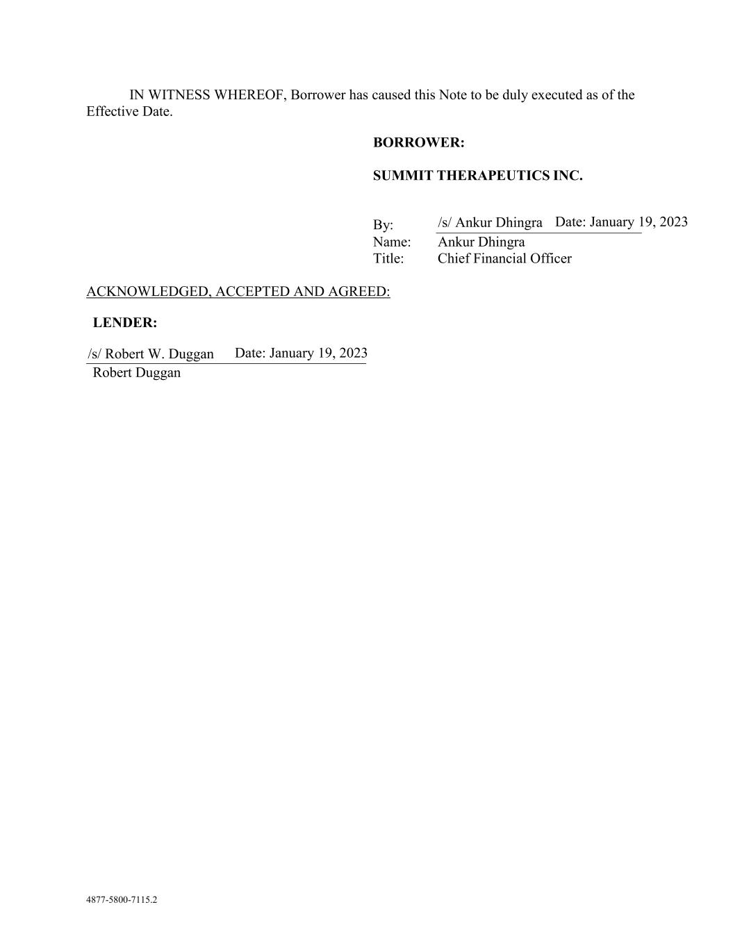 4877-5800-7115.2 IN WITNESS WHEREOF, Borrower has caused this Note to be duly executed as of the Effective Date. BORROWER: SUMMIT THERAPEUTICS INC. By: Name: Ankur Dhingra Title: Chief Financial Officer ACKNOWLEDGED, ACCEPTED AND AGREED: LENDER: Robert Duggan /s/ Ankur Dhingra /s/ Robert W. Duggan Date: January 19, 2023 Date: January 19, 2023
