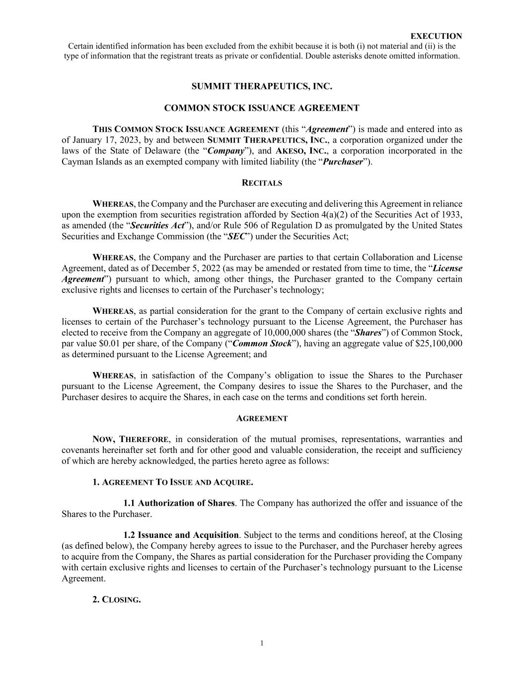 EXECUTION Certain identified information has been excluded from the exhibit because it is both (i) not material and (ii) is the type of information that the registrant treats as private or confidential. Double asterisks denote omitted information. 1 SUMMIT THERAPEUTICS, INC. COMMON STOCK ISSUANCE AGREEMENT THIS COMMON STOCK ISSUANCE AGREEMENT (this “Agreement”) is made and entered into as of January 17, 2023, by and between SUMMIT THERAPEUTICS, INC., a corporation organized under the laws of the State of Delaware (the “Company”), and AKESO, INC., a corporation incorporated in the Cayman Islands as an exempted company with limited liability (the “Purchaser”). RECITALS WHEREAS, the Company and the Purchaser are executing and delivering this Agreement in reliance upon the exemption from securities registration afforded by Section 4(a)(2) of the Securities Act of 1933, as amended (the “Securities Act”), and/or Rule 506 of Regulation D as promulgated by the United States Securities and Exchange Commission (the “SEC”) under the Securities Act; WHEREAS, the Company and the Purchaser are parties to that certain Collaboration and License Agreement, dated as of December 5, 2022 (as may be amended or restated from time to time, the “License Agreement”) pursuant to which, among other things, the Purchaser granted to the Company certain exclusive rights and licenses to certain of the Purchaser’s technology; WHEREAS, as partial consideration for the grant to the Company of certain exclusive rights and licenses to certain of the Purchaser’s technology pursuant to the License Agreement, the Purchaser has elected to receive from the Company an aggregate of 10,000,000 shares (the “Shares”) of Common Stock, par value $0.01 per share, of the Company (“Common Stock”), having an aggregate value of $25,100,000 as determined pursuant to the License Agreement; and WHEREAS, in satisfaction of the Company’s obligation to issue the Shares to the Purchaser pursuant to the License Agreement, the Company desires to issue the Shares to the Purchaser, and the Purchaser desires to acquire the Shares, in each case on the terms and conditions set forth herein. AGREEMENT NOW, THEREFORE, in consideration of the mutual promises, representations, warranties and covenants hereinafter set forth and for other good and valuable consideration, the receipt and sufficiency of which are hereby acknowledged, the parties hereto agree as follows: 1. AGREEMENT TO ISSUE AND ACQUIRE. 1.1 Authorization of Shares. The Company has authorized the offer and issuance of the Shares to the Purchaser. 1.2 Issuance and Acquisition. Subject to the terms and conditions hereof, at the Closing (as defined below), the Company hereby agrees to issue to the Purchaser, and the Purchaser hereby agrees to acquire from the Company, the Shares as partial consideration for the Purchaser providing the Company with certain exclusive rights and licenses to certain of the Purchaser’s technology pursuant to the License Agreement. 2. CLOSING.