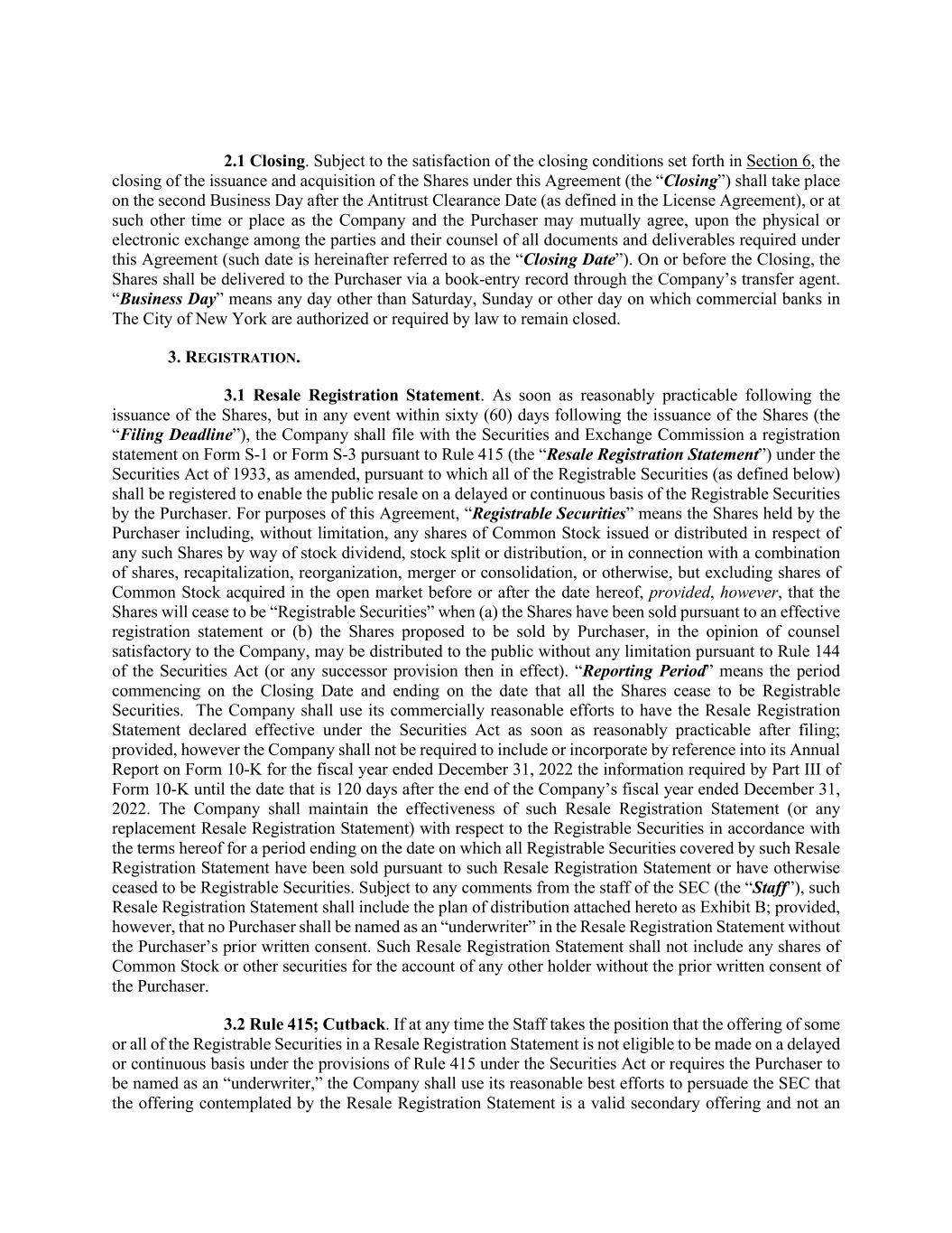 2.1 Closing. Subject to the satisfaction of the closing conditions set forth in Section 6, the closing of the issuance and acquisition of the Shares under this Agreement (the “Closing”) shall take place on the second Business Day after the Antitrust Clearance Date (as defined in the License Agreement), or at such other time or place as the Company and the Purchaser may mutually agree, upon the physical or electronic exchange among the parties and their counsel of all documents and deliverables required under this Agreement (such date is hereinafter referred to as the “Closing Date”). On or before the Closing, the Shares shall be delivered to the Purchaser via a book-entry record through the Company’s transfer agent. “Business Day” means any day other than Saturday, Sunday or other day on which commercial banks in The City of New York are authorized or required by law to remain closed. 3. REGISTRATION. 3.1 Resale Registration Statement. As soon as reasonably practicable following the issuance of the Shares, but in any event within sixty (60) days following the issuance of the Shares (the “Filing Deadline”), the Company shall file with the Securities and Exchange Commission a registration statement on Form S-1 or Form S-3 pursuant to Rule 415 (the “Resale Registration Statement”) under the Securities Act of 1933, as amended, pursuant to which all of the Registrable Securities (as defined below) shall be registered to enable the public resale on a delayed or continuous basis of the Registrable Securities by the Purchaser. For purposes of this Agreement, “Registrable Securities” means the Shares held by the Purchaser including, without limitation, any shares of Common Stock issued or distributed in respect of any such Shares by way of stock dividend, stock split or distribution, or in connection with a combination of shares, recapitalization, reorganization, merger or consolidation, or otherwise, but excluding shares of Common Stock acquired in the open market before or after the date hereof, provided, however, that the Shares will cease to be “Registrable Securities” when (a) the Shares have been sold pursuant to an effective registration statement or (b) the Shares proposed to be sold by Purchaser, in the opinion of counsel satisfactory to the Company, may be distributed to the public without any limitation pursuant to Rule 144 of the Securities Act (or any successor provision then in effect). “Reporting Period” means the period commencing on the Closing Date and ending on the date that all the Shares cease to be Registrable Securities. The Company shall use its commercially reasonable efforts to have the Resale Registration Statement declared effective under the Securities Act as soon as reasonably practicable after filing; provided, however the Company shall not be required to include or incorporate by reference into its Annual Report on Form 10-K for the fiscal year ended December 31, 2022 the information required by Part III of Form 10-K until the date that is 120 days after the end of the Company’s fiscal year ended December 31, 2022. The Company shall maintain the effectiveness of such Resale Registration Statement (or any replacement Resale Registration Statement) with respect to the Registrable Securities in accordance with the terms hereof for a period ending on the date on which all Registrable Securities covered by such Resale Registration Statement have been sold pursuant to such Resale Registration Statement or have otherwise ceased to be Registrable Securities. Subject to any comments from the staff of the SEC (the “Staff”), such Resale Registration Statement shall include the plan of distribution attached hereto as Exhibit B; provided, however, that no Purchaser shall be named as an “underwriter” in the Resale Registration Statement without the Purchaser’s prior written consent. Such Resale Registration Statement shall not include any shares of Common Stock or other securities for the account of any other holder without the prior written consent of the Purchaser. 3.2 Rule 415; Cutback. If at any time the Staff takes the position that the offering of some or all of the Registrable Securities in a Resale Registration Statement is not eligible to be made on a delayed or continuous basis under the provisions of Rule 415 under the Securities Act or requires the Purchaser to be named as an “underwriter,” the Company shall use its reasonable best efforts to persuade the SEC that the offering contemplated by the Resale Registration Statement is a valid secondary offering and not an